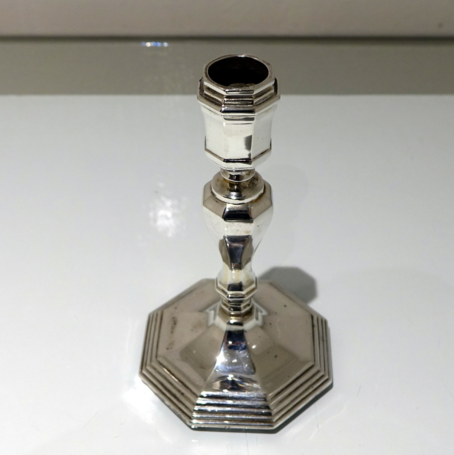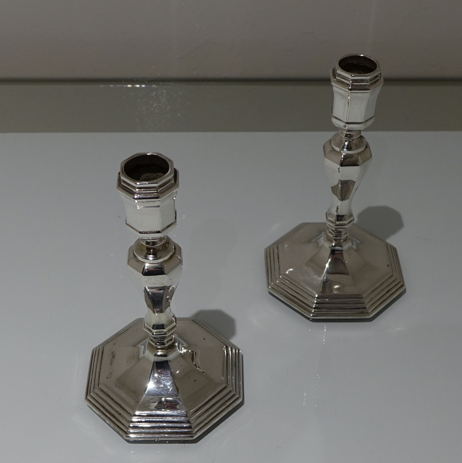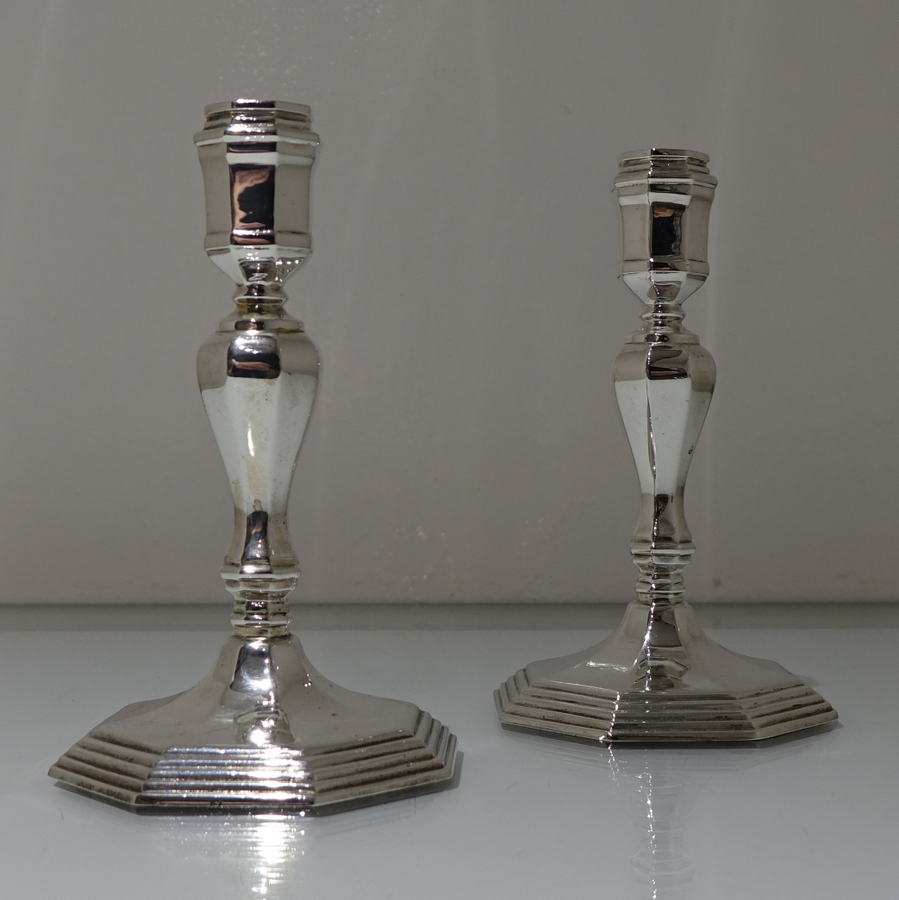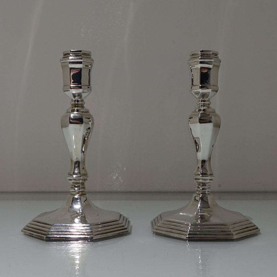 A stylish pair of modern silver octagonal formed cast candlesticks designed with outer “stepped” bases for lowlights and elegant curvaceous stems.