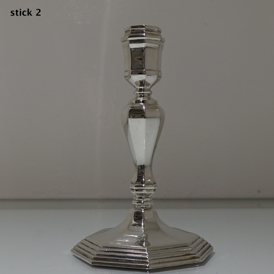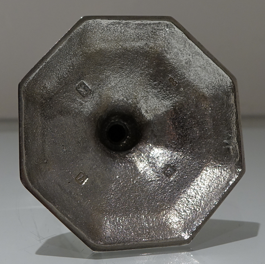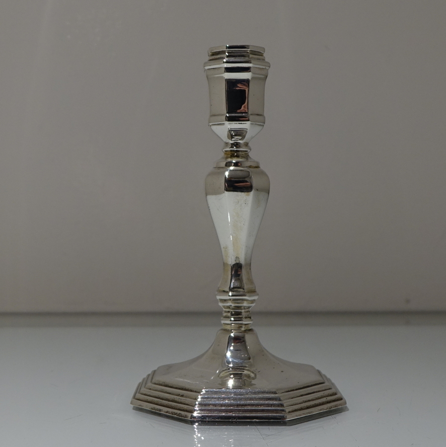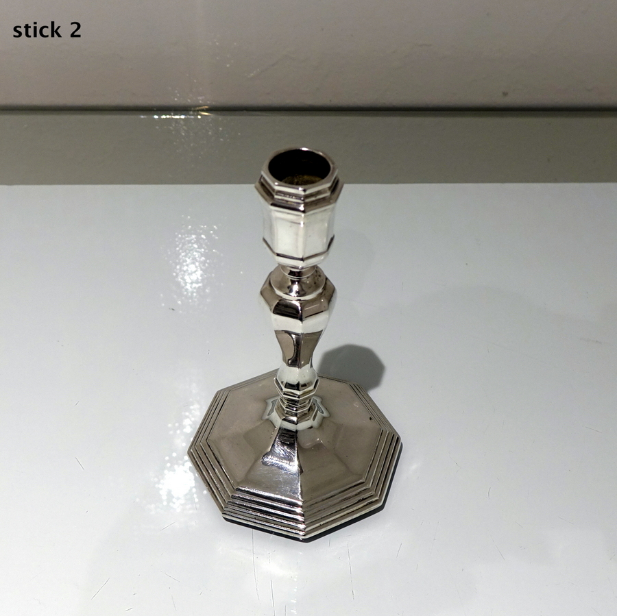 A stylish pair of modern silver octagonal formed cast candlesticks designed with outer “stepped” bases for lowlights and elegant curvaceous stems.