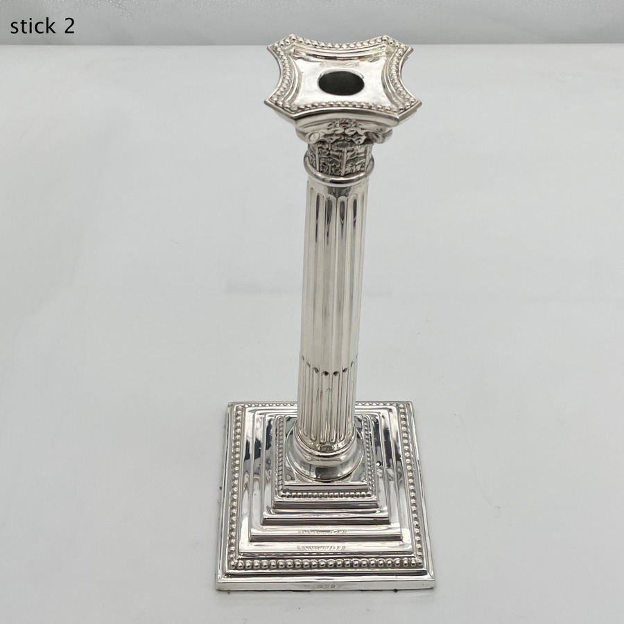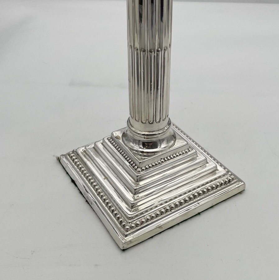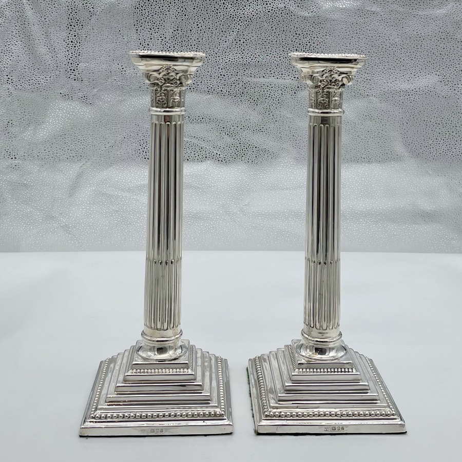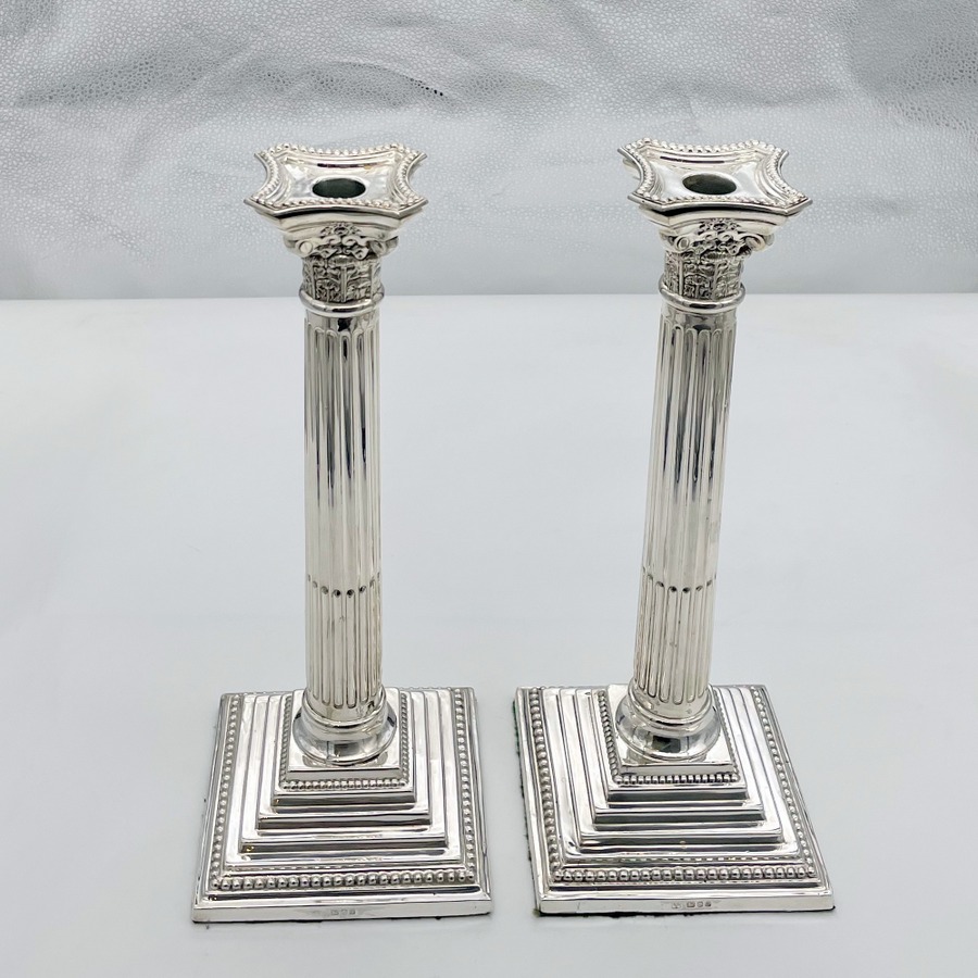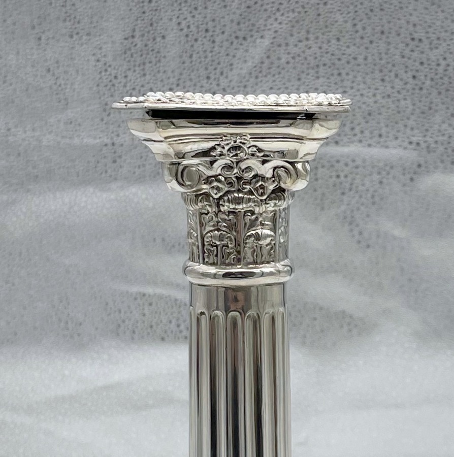 A highly desirable pair of modern silver corinthian style candlesticks decorated with additional bead borders for highlights. Â The upper shaped square sconces are detachable.