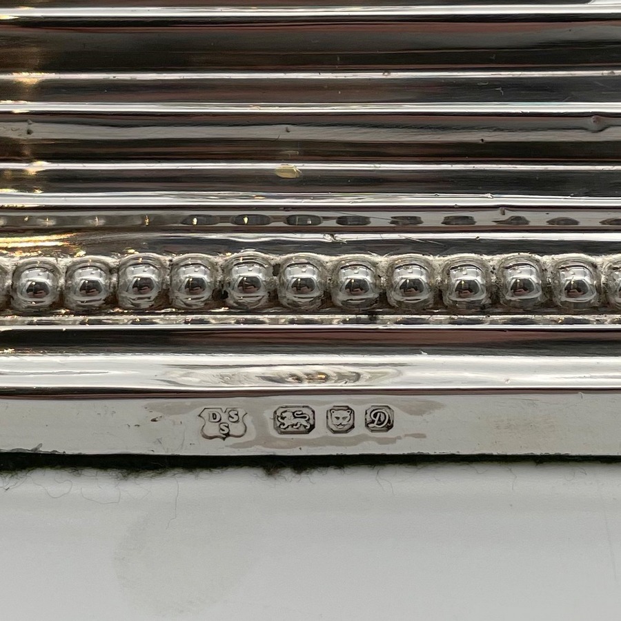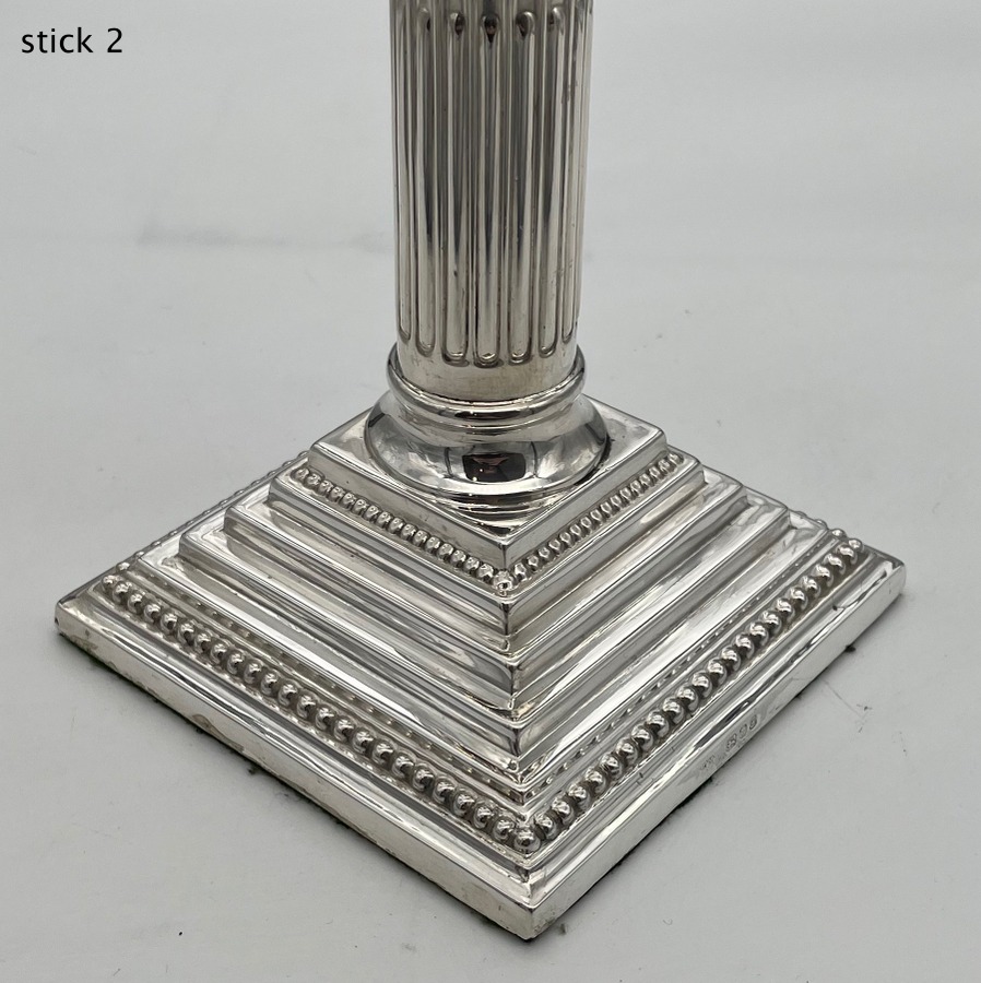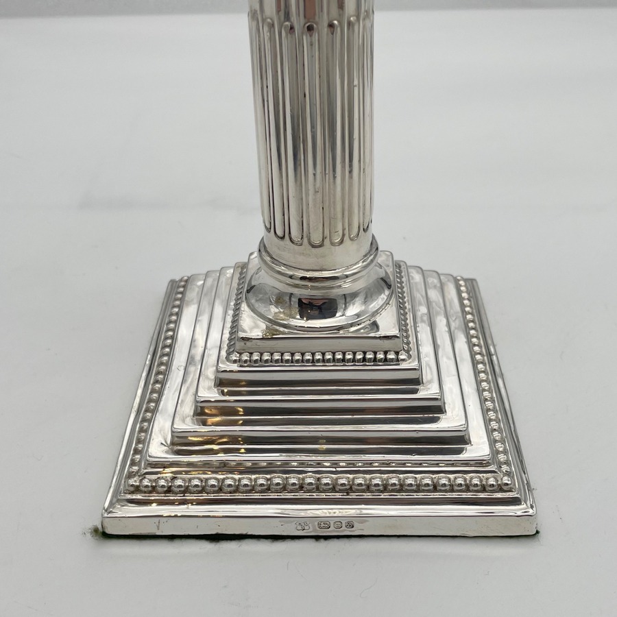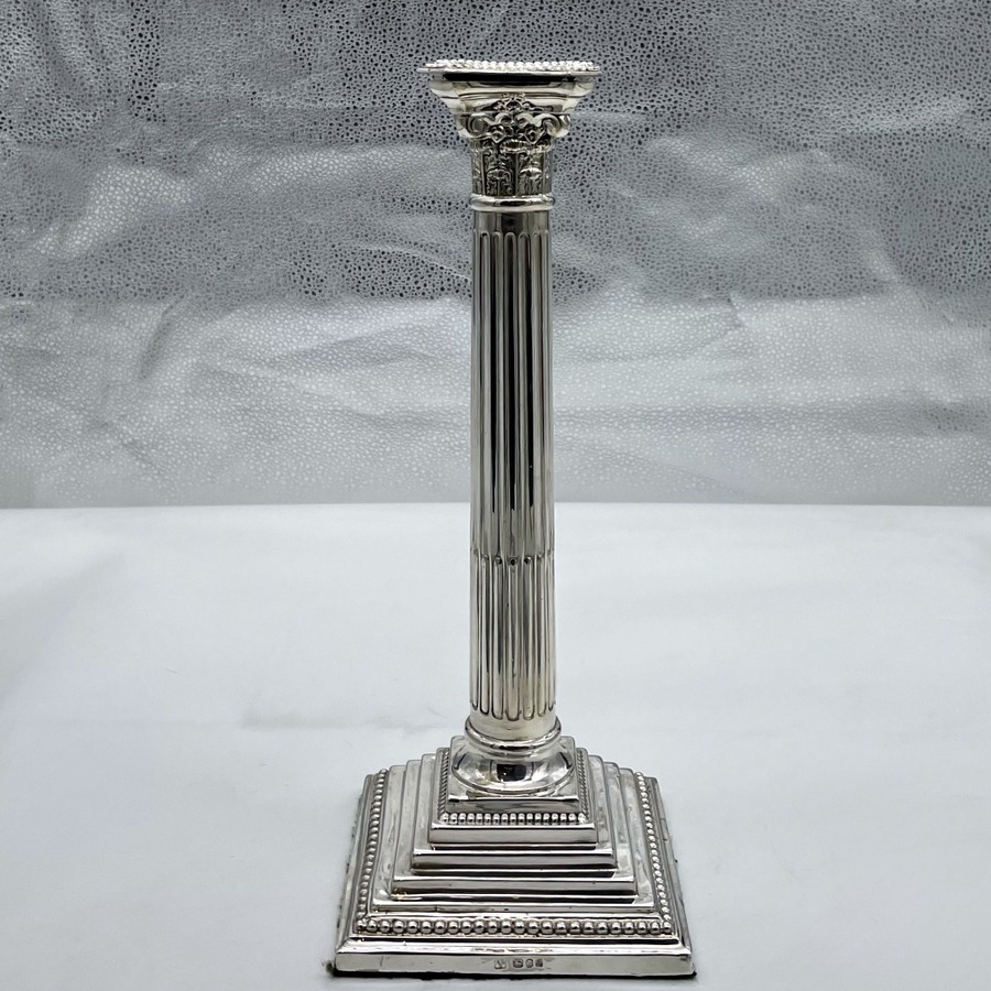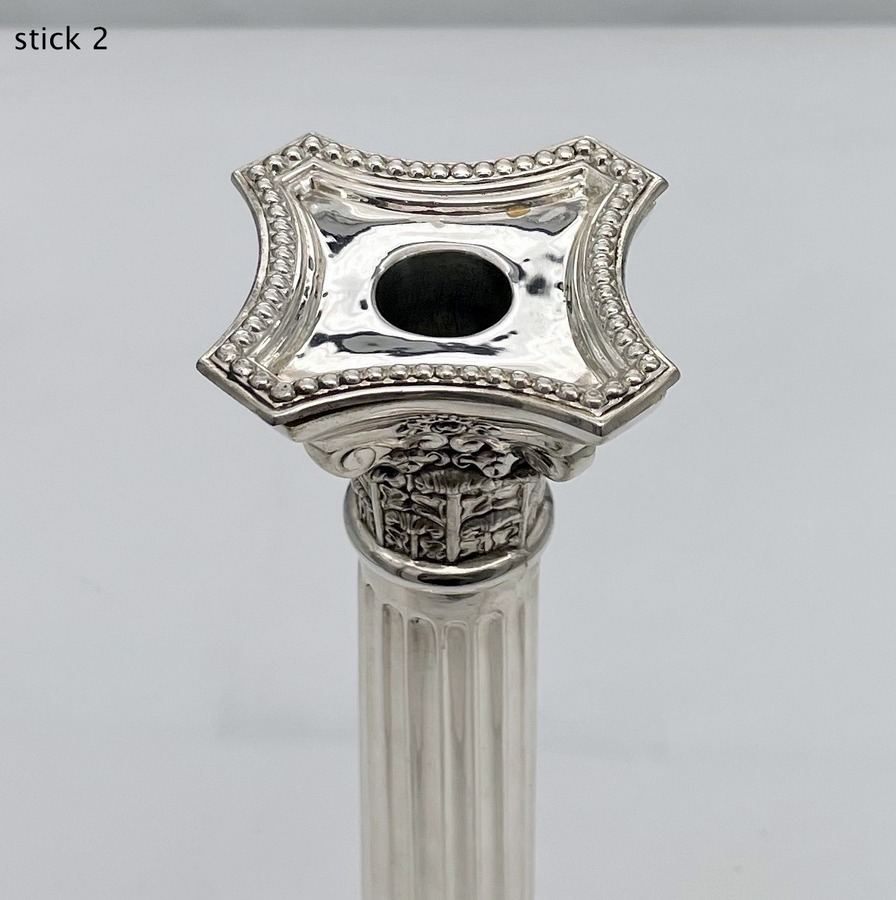 A highly desirable pair of modern silver corinthian style candlesticks decorated with additional bead borders for highlights. Â The upper shaped square sconces are detachable.