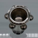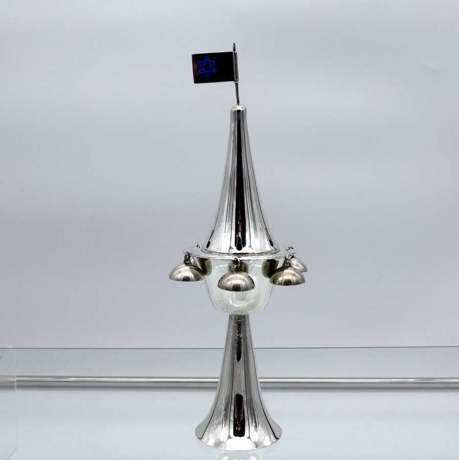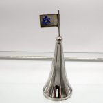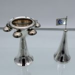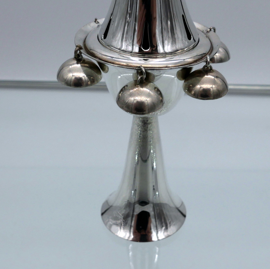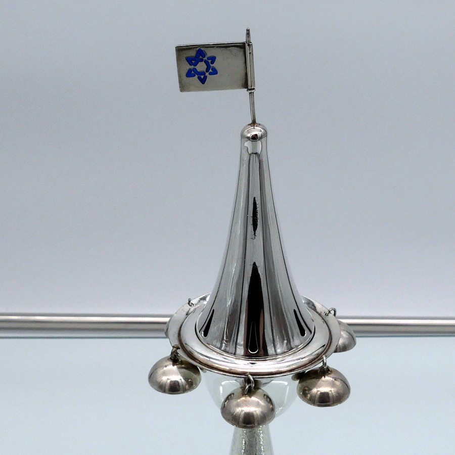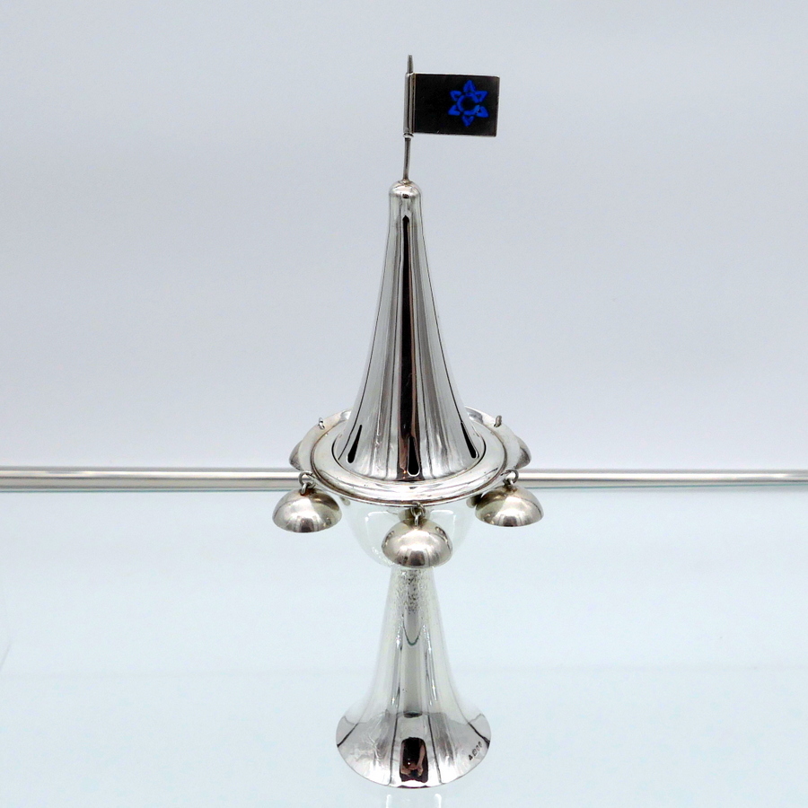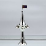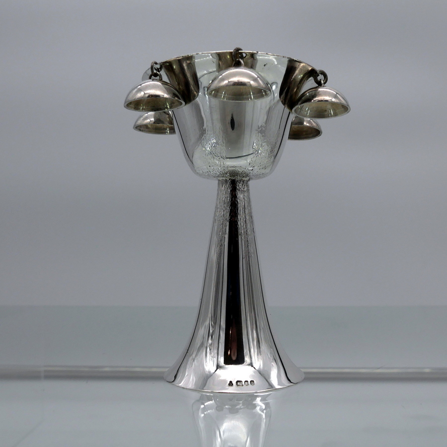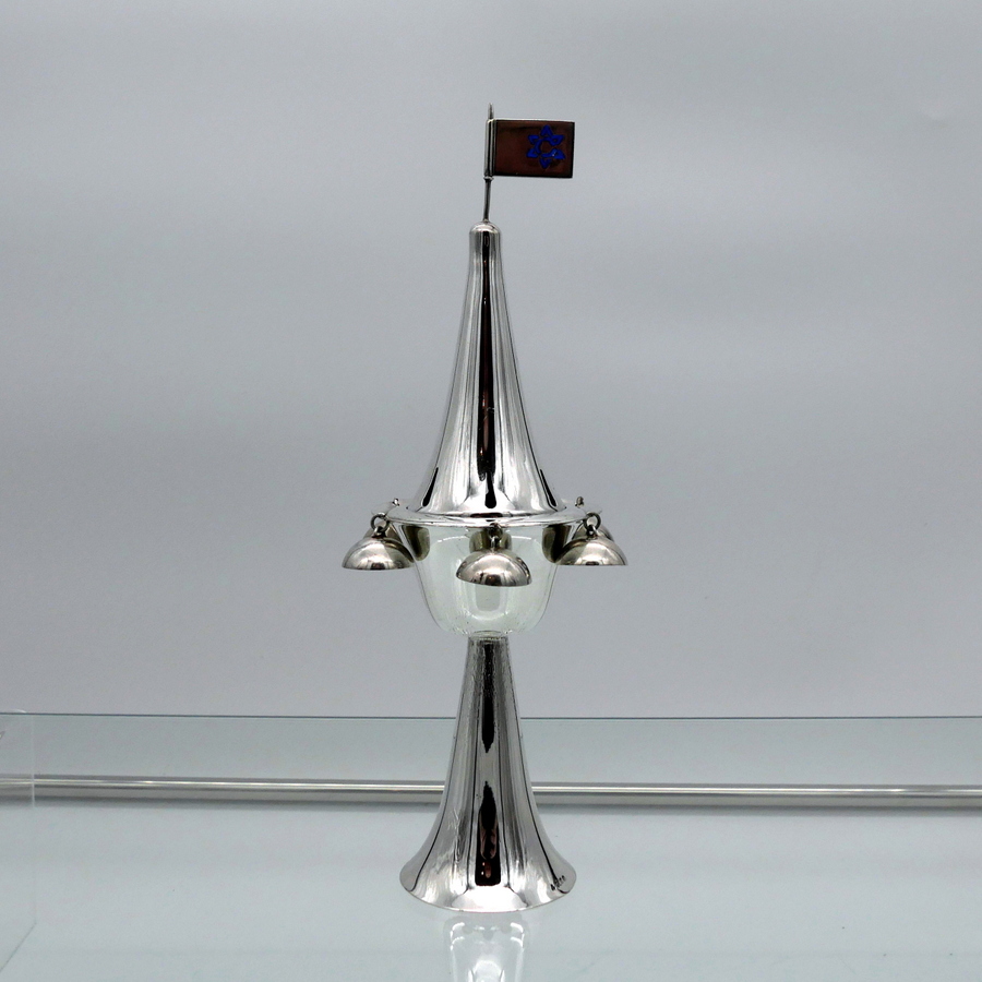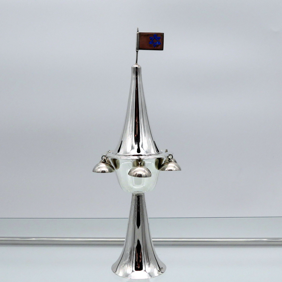 A modern art sterling silver spice tower designed with a stylish central spice cavity which is then surround by elegant hanging bells and sits on a delightful trumpet style foot. Â The sumptuous detachable pierced mast lid is crowned with an enamelled motif flying flag.