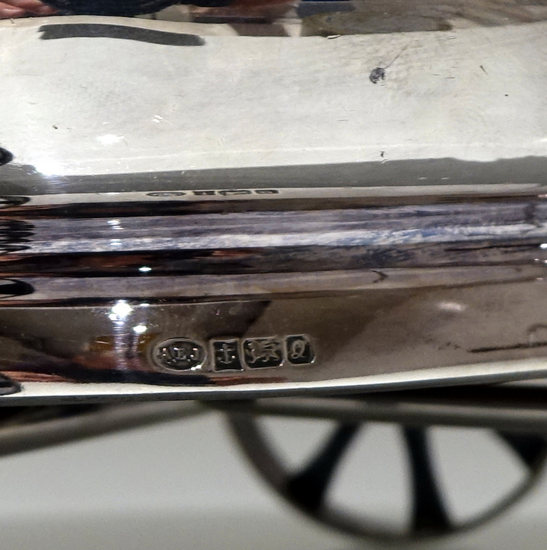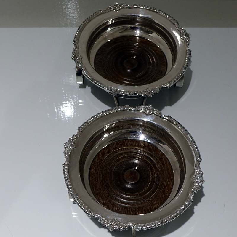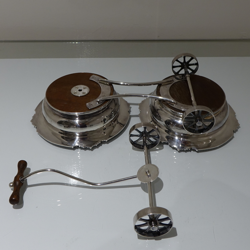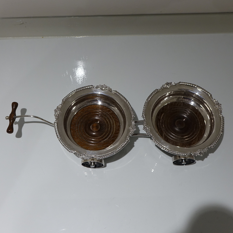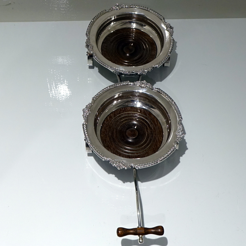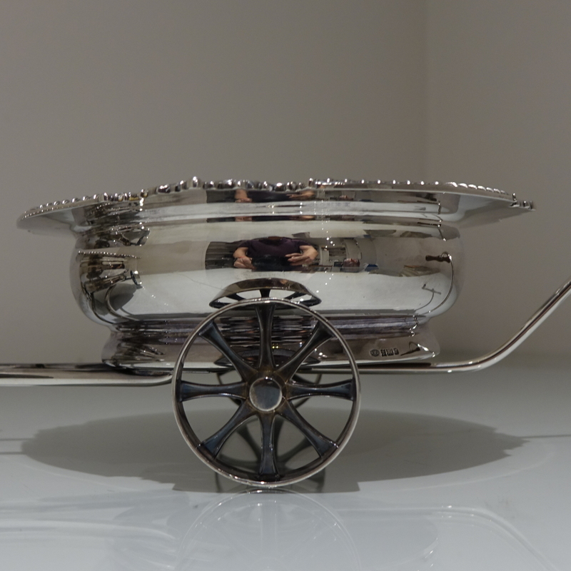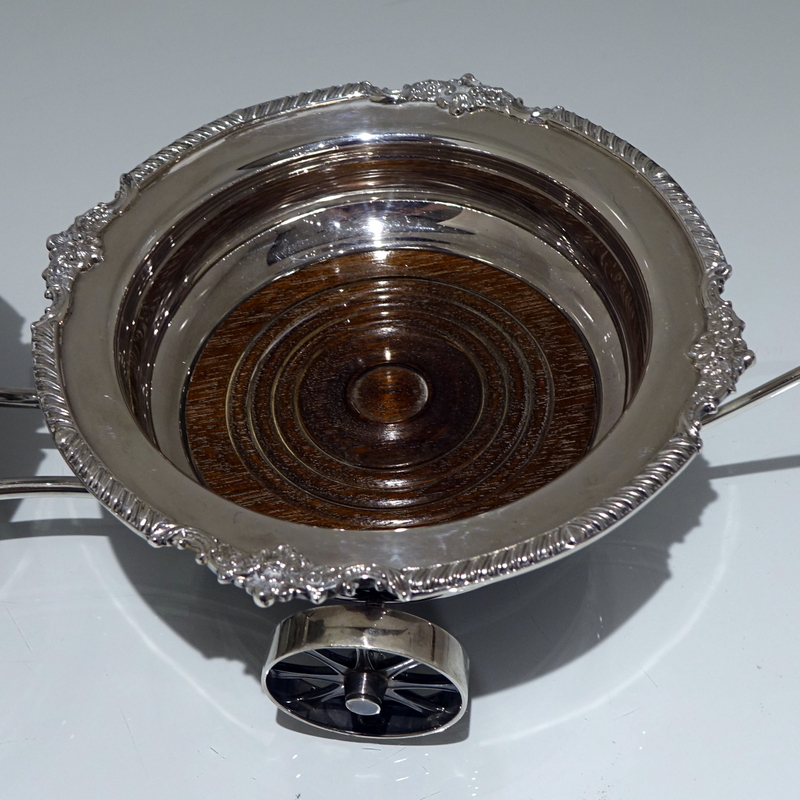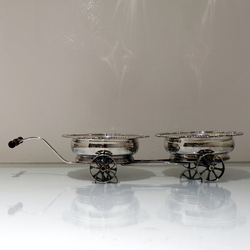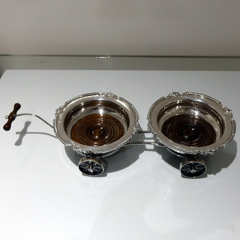 A rare and incredibly beautiful silver trolley coaster made by the highly collectable Albert Edward Jones workshop. Â The coasters are shaped circular gadroon in style and have elegant “turned” wood grooves in there bases. Â The trolley has elegant “spoke” wagon wheels for decorative lowlights.