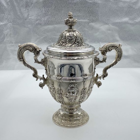 A truly fabulous sterling silver cup and cover designed with exquisite lower floral strap work applied to a matt background for decorative visual contrast above which sits a stylish dividing girdle to highlight the elegant plain formed workmanship.  The sumptuous acanthus capped cast double scroll handles rounds of a beautiful piece of 20th century copy workmanship designed in the manner of the premier silversmith Paul de Lamerie.