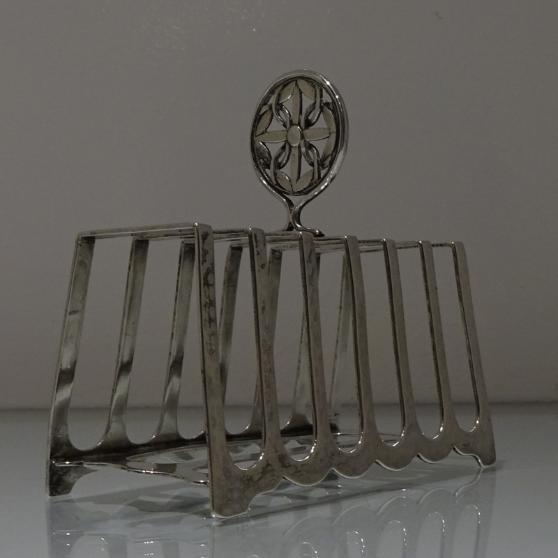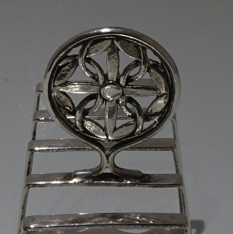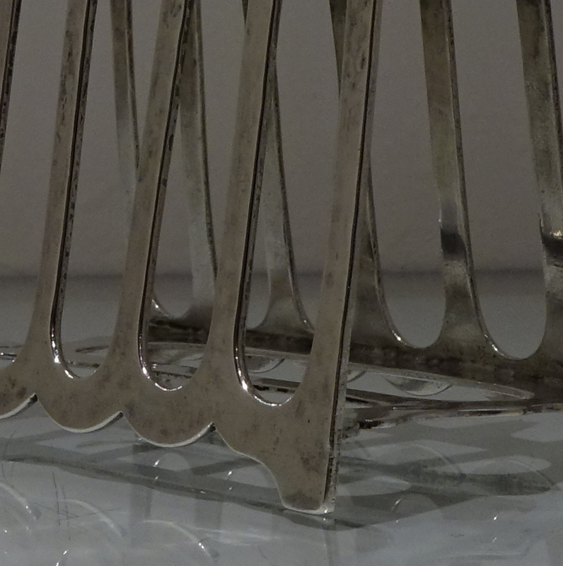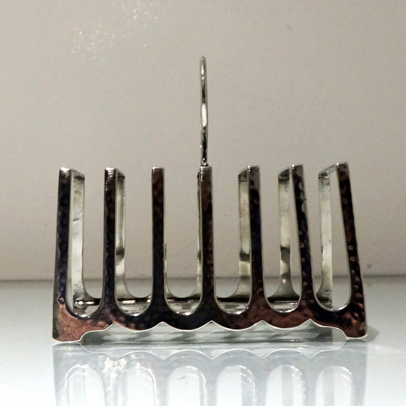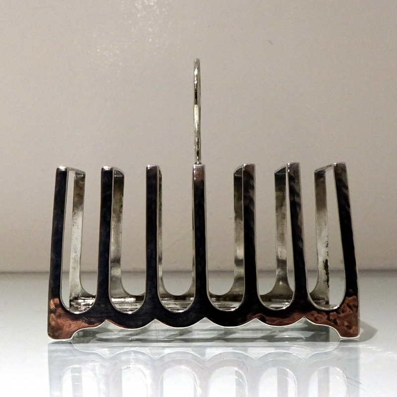 A stylish and incredibly unusual seven bar toast rack beautifully designed with hints of art deco and art nouveau craftsmanship for decorative modelling. Â The bars taper at the sides with subtle ripples of a “hammer” finish effect. Â The elaborate mounted handle rounds off an already stylish piece of craftsmanship.