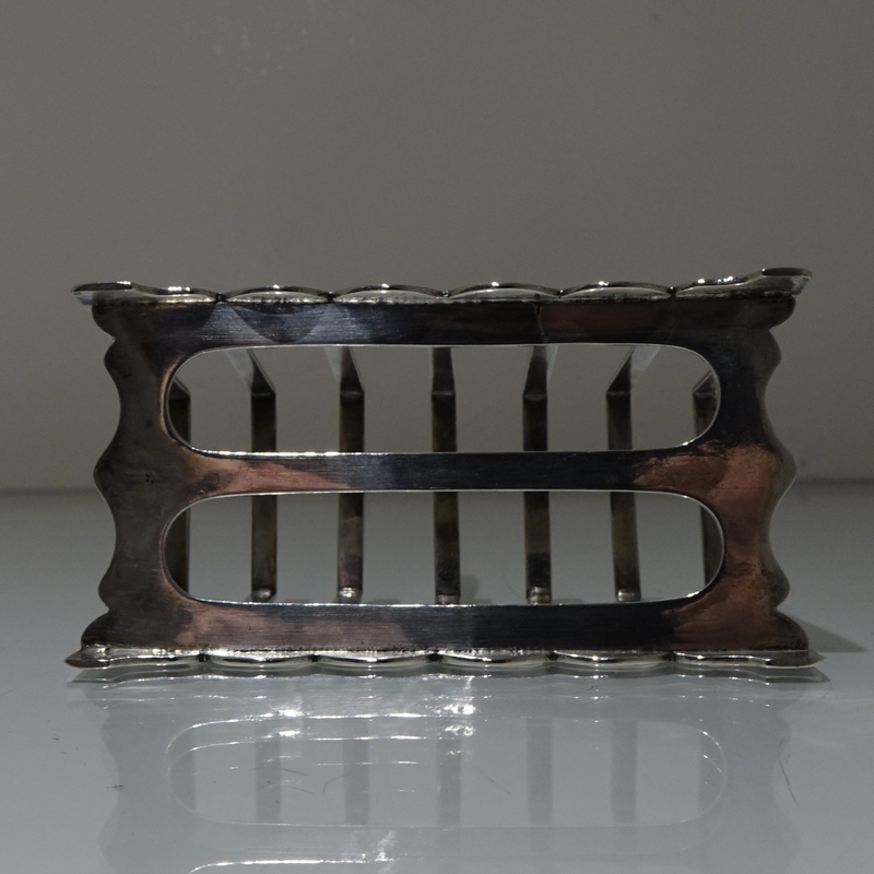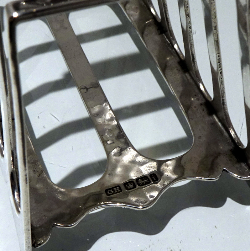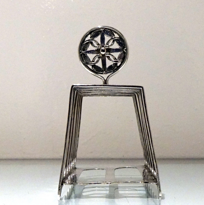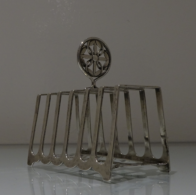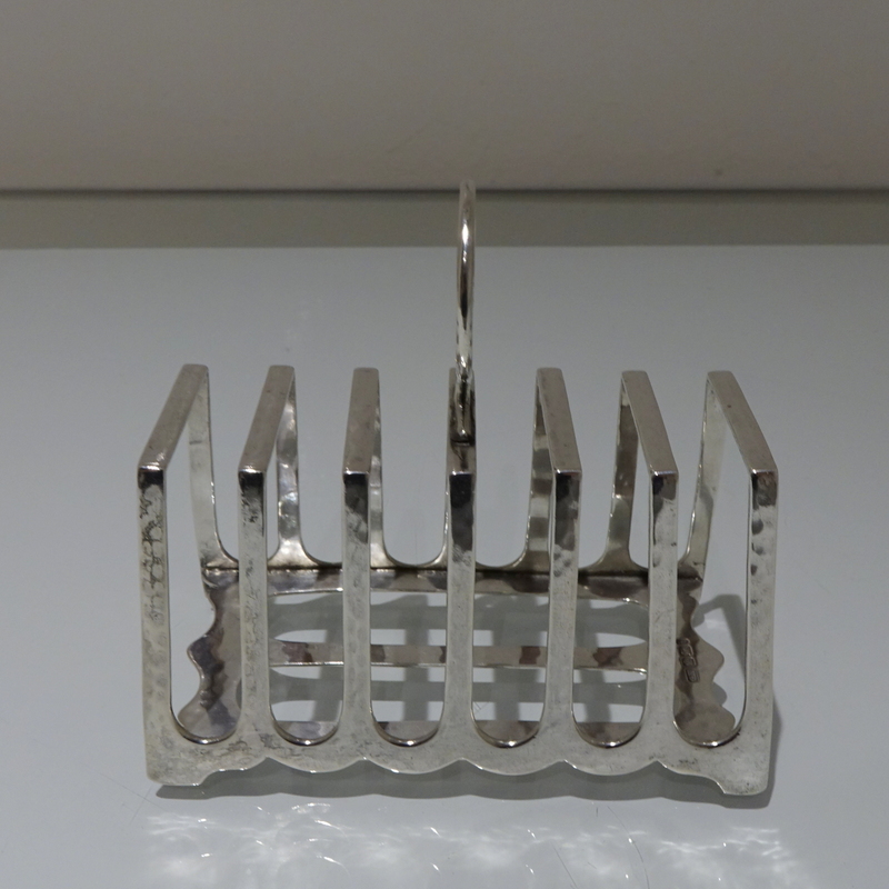 A stylish and incredibly unusual seven bar toast rack beautifully designed with hints of art deco and art nouveau craftsmanship for decorative modelling. Â The bars taper at the sides with subtle ripples of a “hammer” finish effect. Â The elaborate mounted handle rounds off an already stylish piece of craftsmanship.