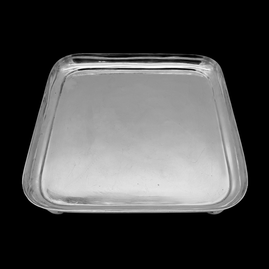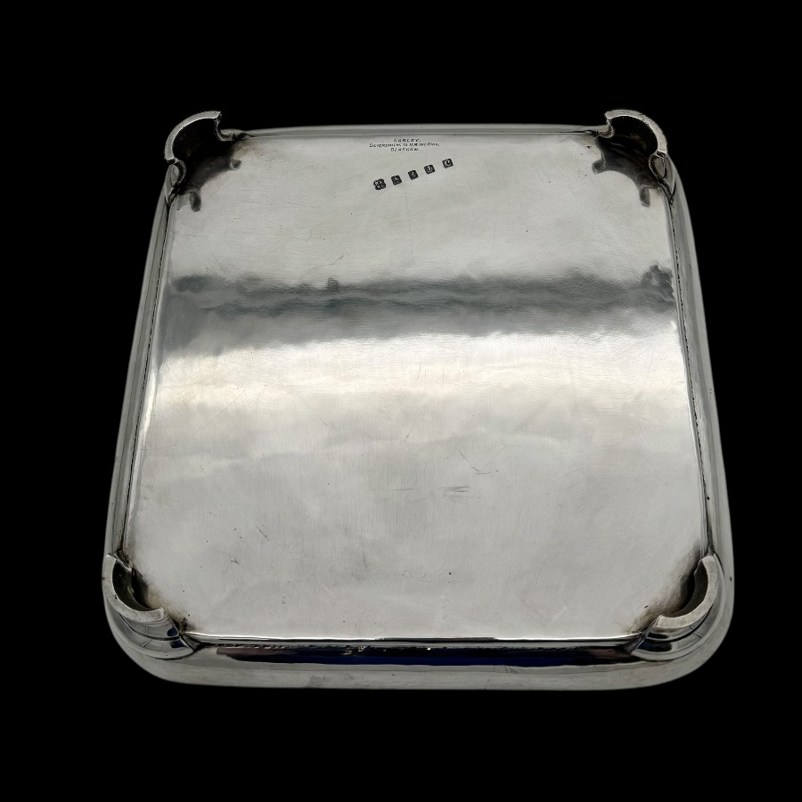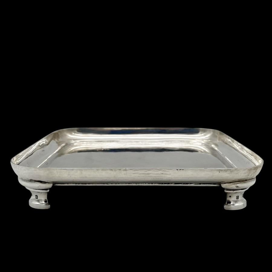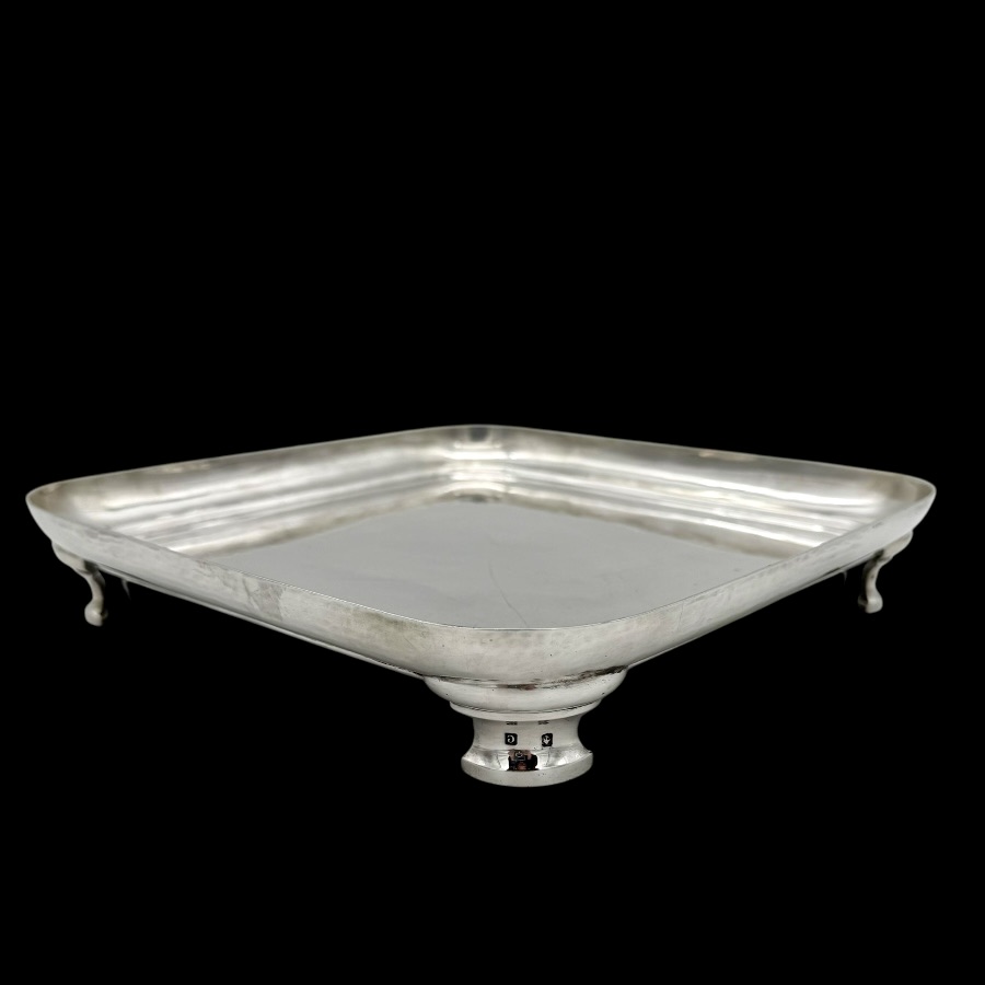 Most sought after style of modern silver salver designed in a elegant shaped square form with slightly raised walls and a striking hammered finished patina. Each foot separately hallmarked (unusual) for designer influenced decorative lowlights.