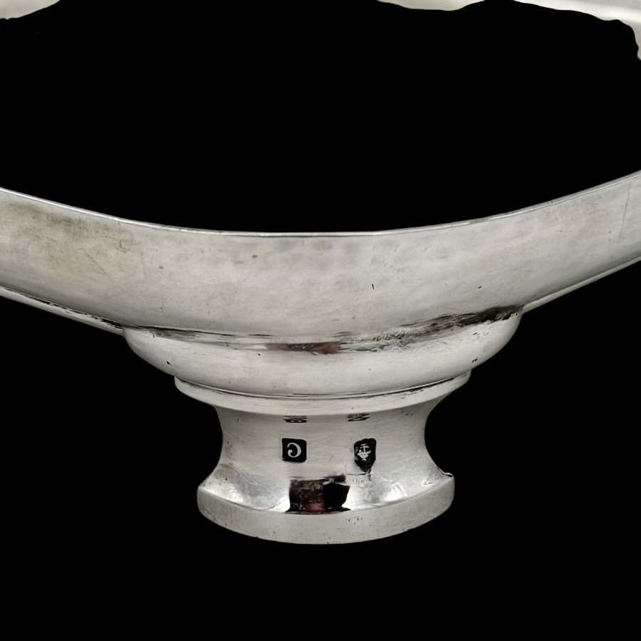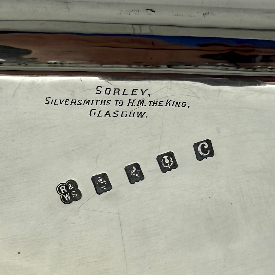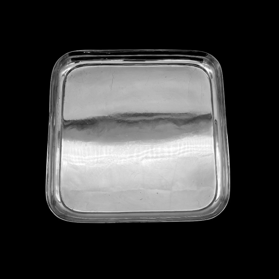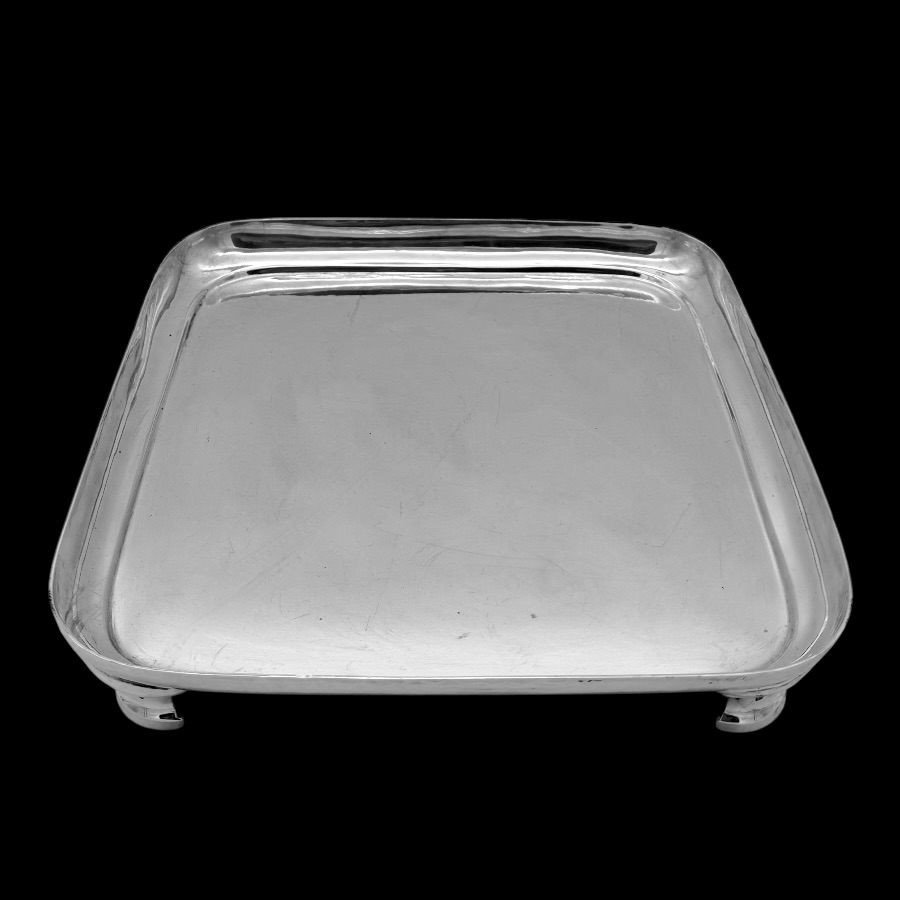 Most sought after style of modern silver salver designed in a elegant shaped square form with slightly raised walls and a striking hammered finished patina. Each foot separately hallmarked (unusual) for designer influenced decorative lowlights.
