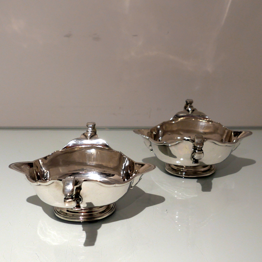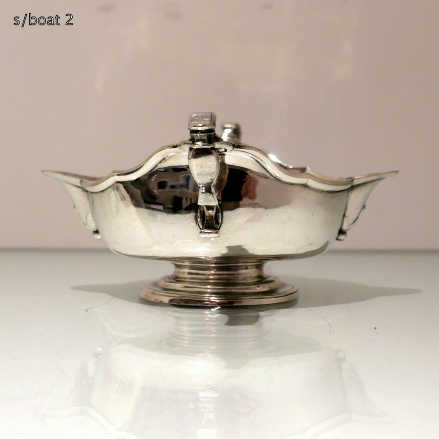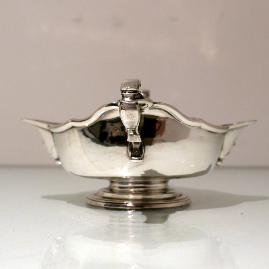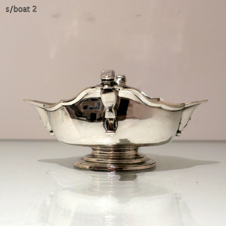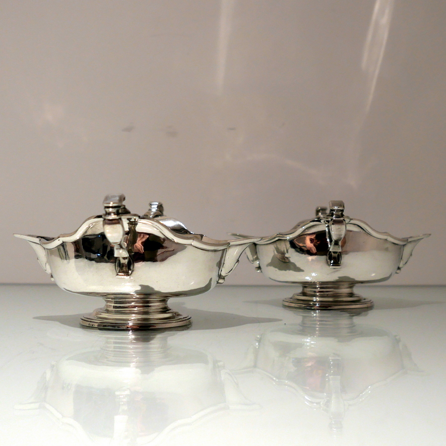A rare pair of sterling silver copy (circa 1720) double lipped sauce boats elegantly plain formed in design and sitting on stylish oval raised pedestal feet.