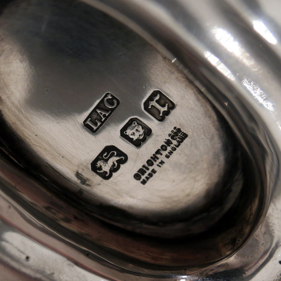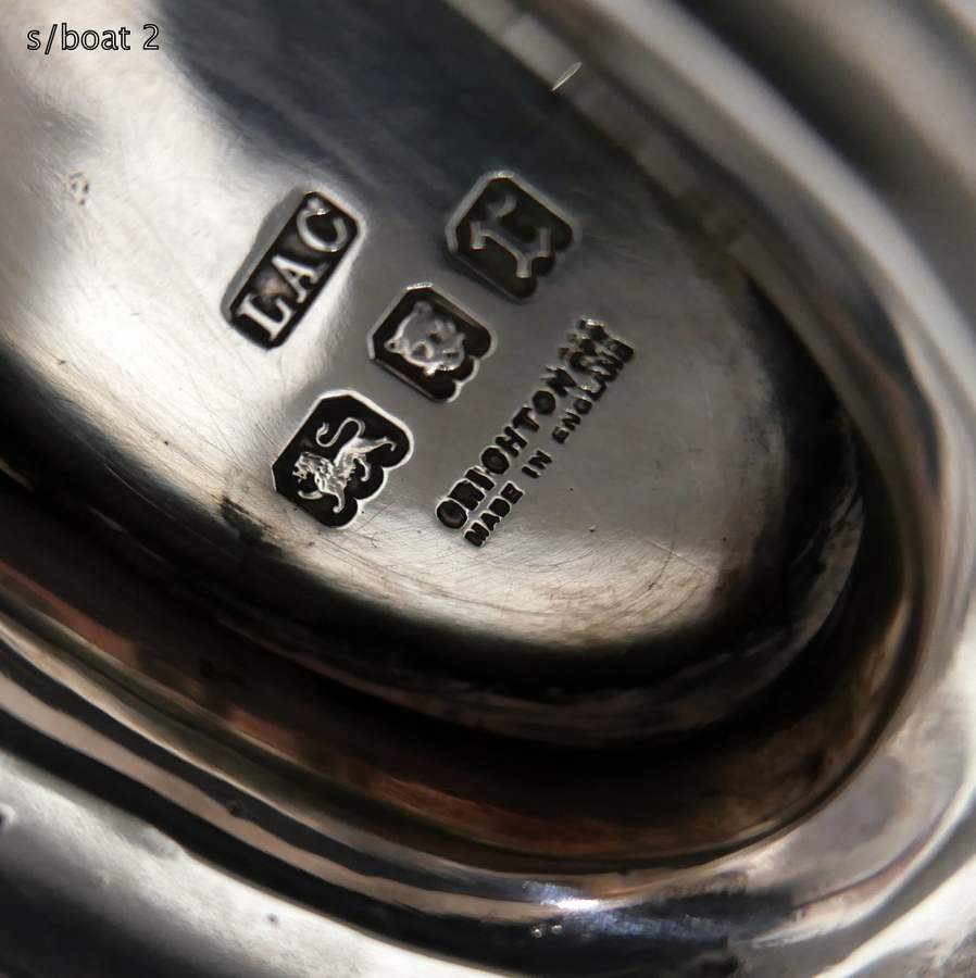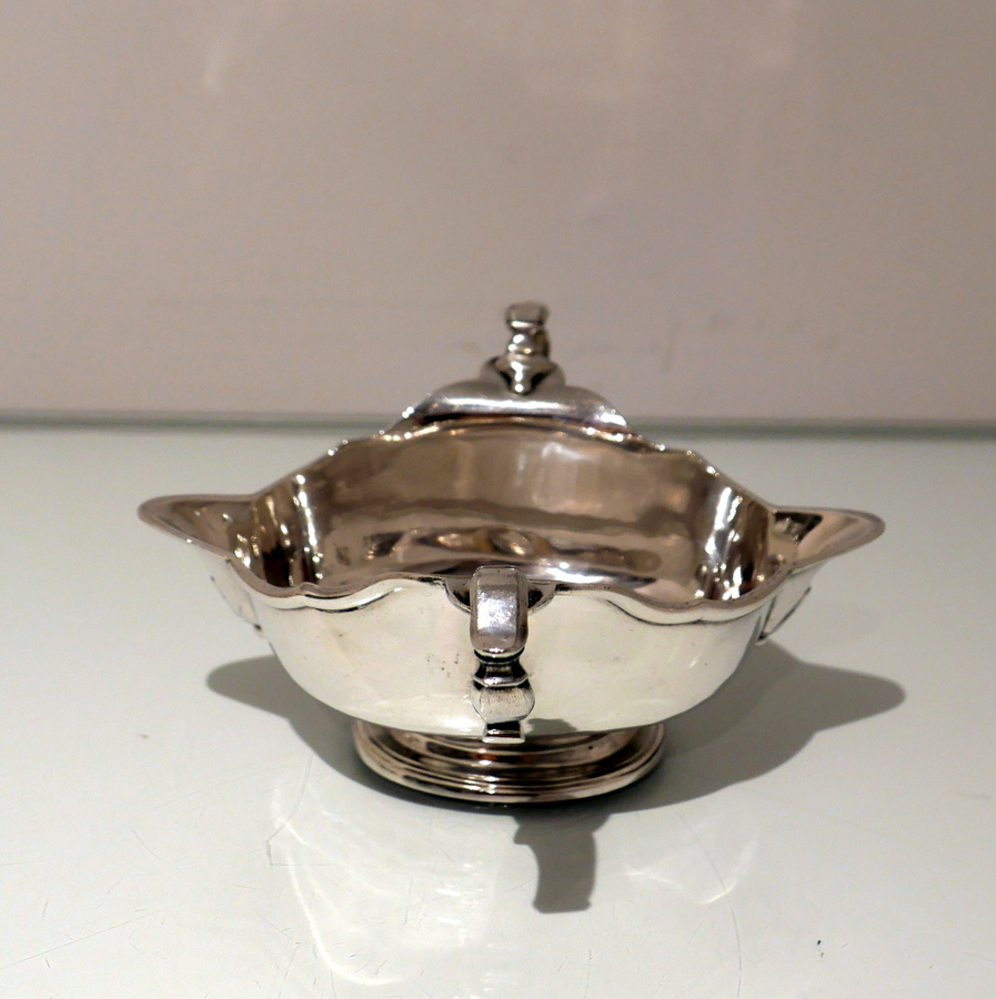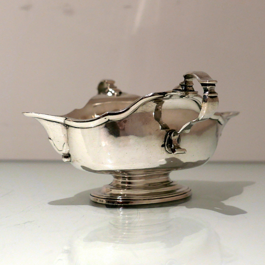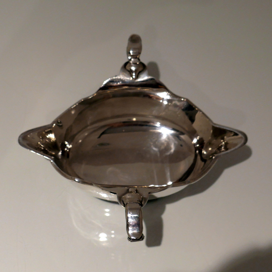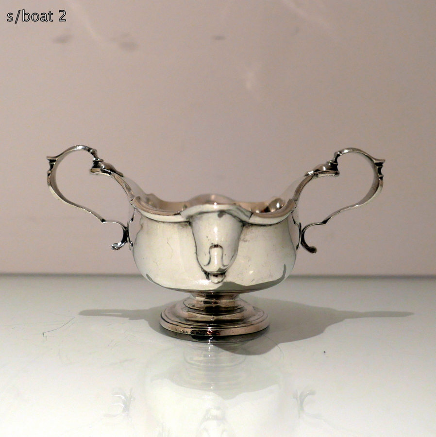 A rare pair of sterling silver copy (circa 1720) double lipped sauce boats elegantly plain formed in design and sitting on stylish oval raised pedestal feet.