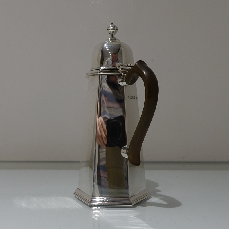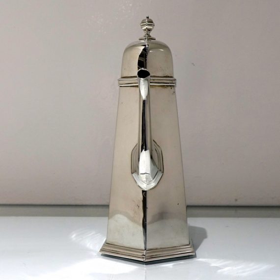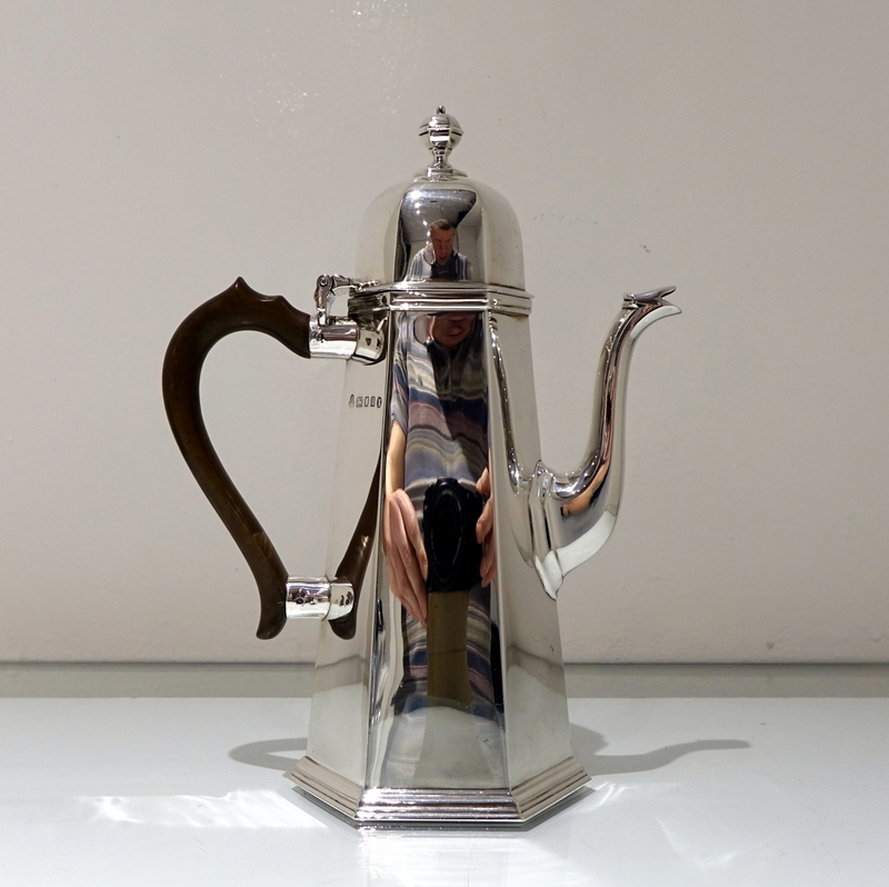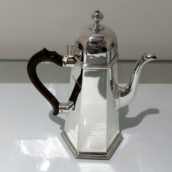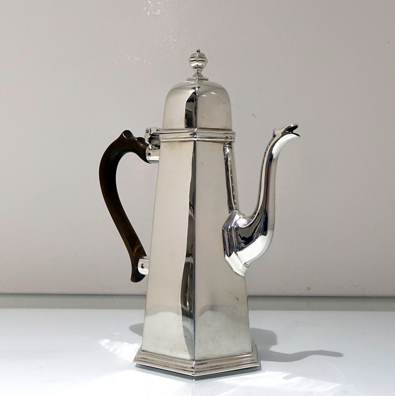 A fine and extremely elegant hexagonal plain formed panelled coffee pot with an applied fruitwood scroll formed handle. Â The lid is hinged and crowned with a stylish finial.