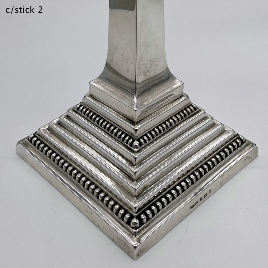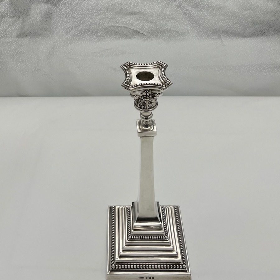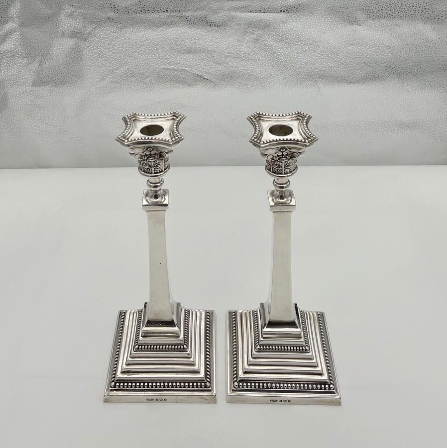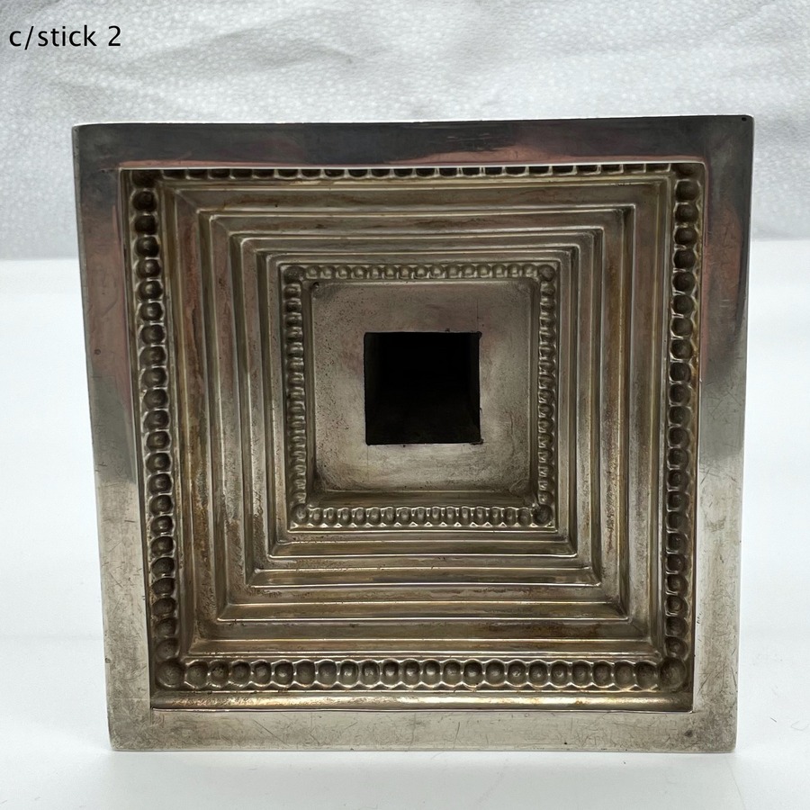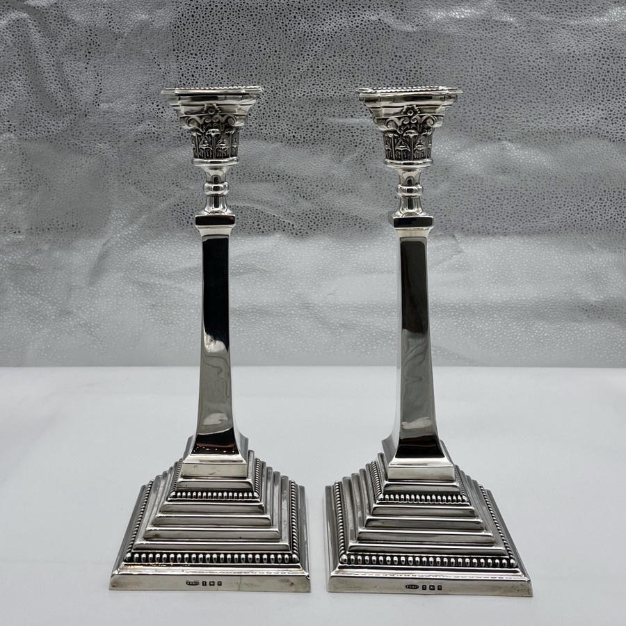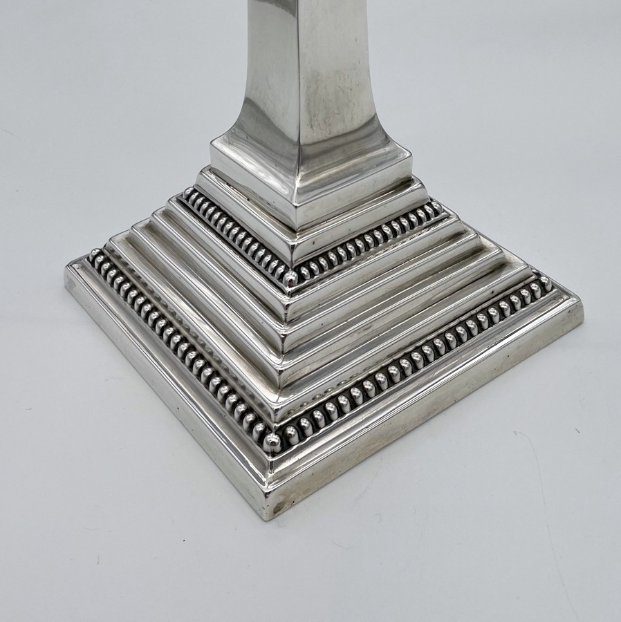 A highly desirable pair of sterling silver sabbath candlesticks designed with elegant square columns and stylish stepped bead bases.
