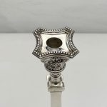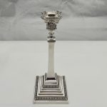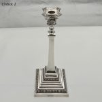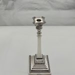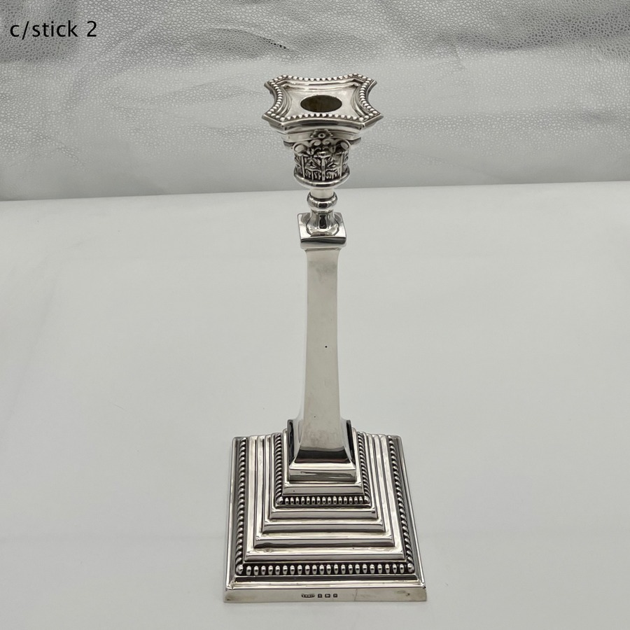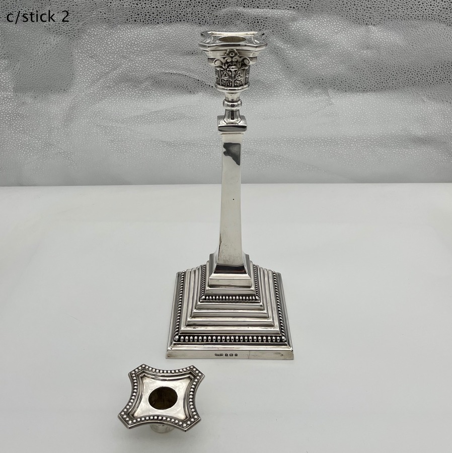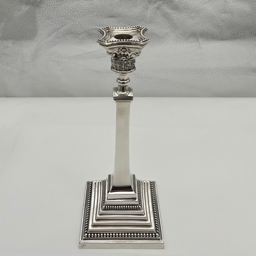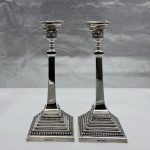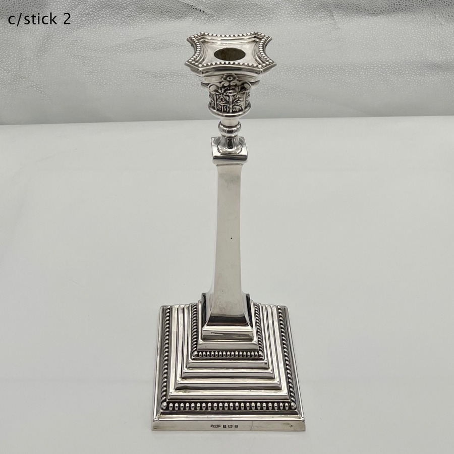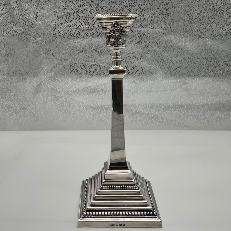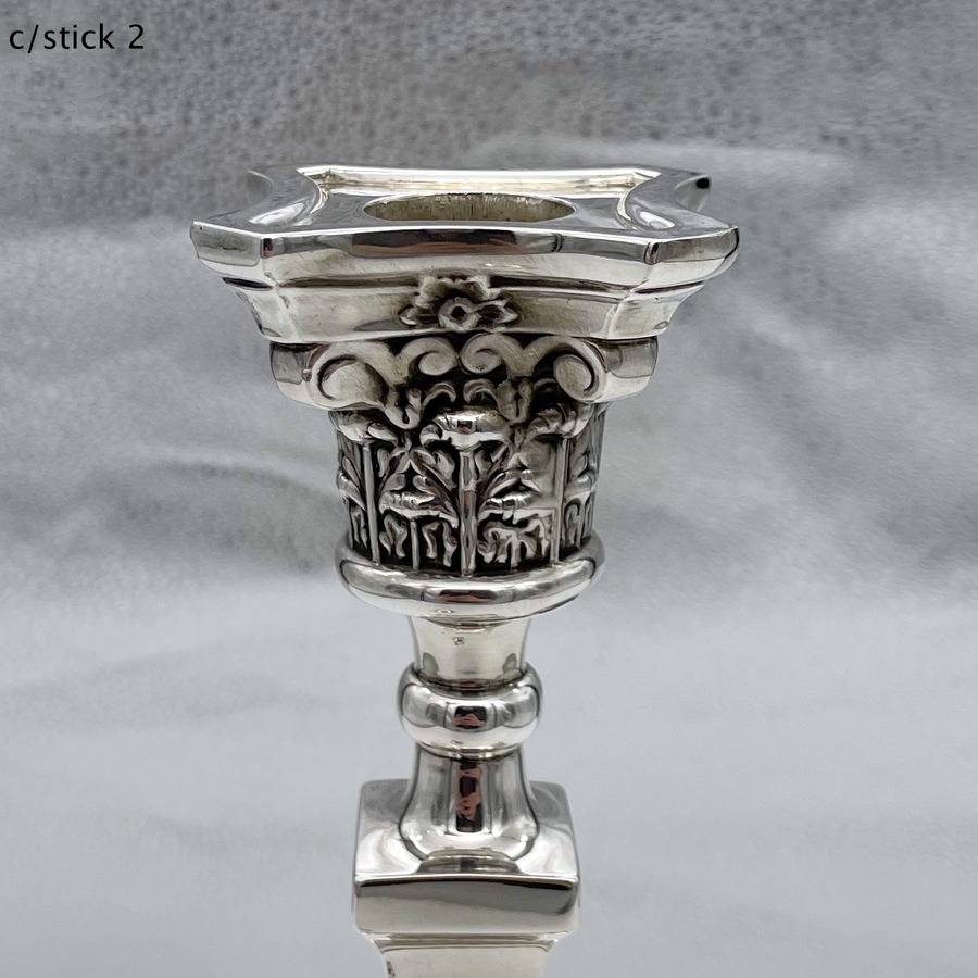 A highly desirable pair of sterling silver sabbath candlesticks designed with elegant square columns and stylish stepped bead bases.