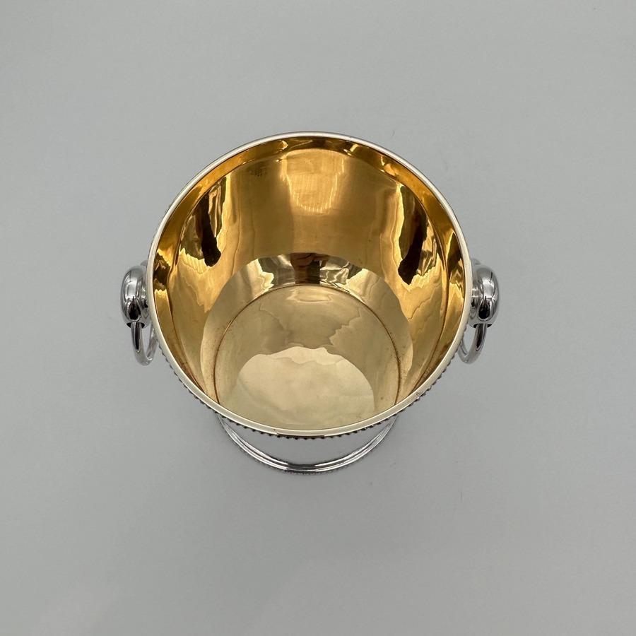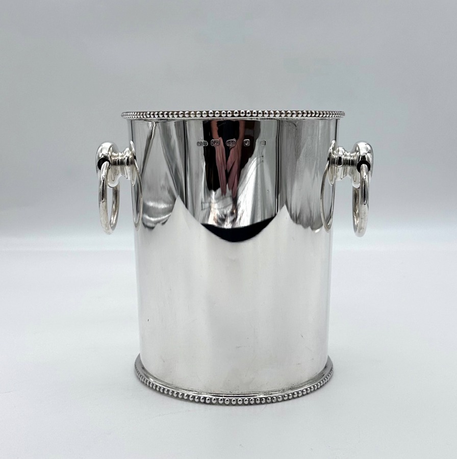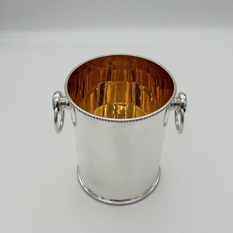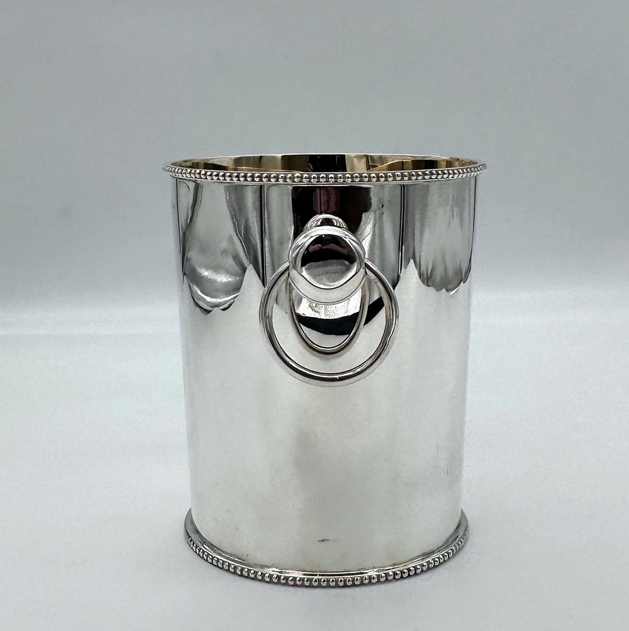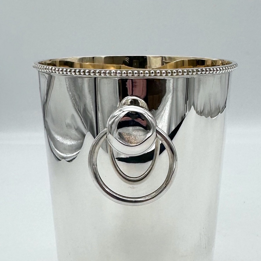 Highly collectable and stunning quality large plain formed sterling silver ice bucket decorated with stylish bead borders and designed with gorgeous drop ring handles. The interior has elegant gilding for decorative visual contrasts.
