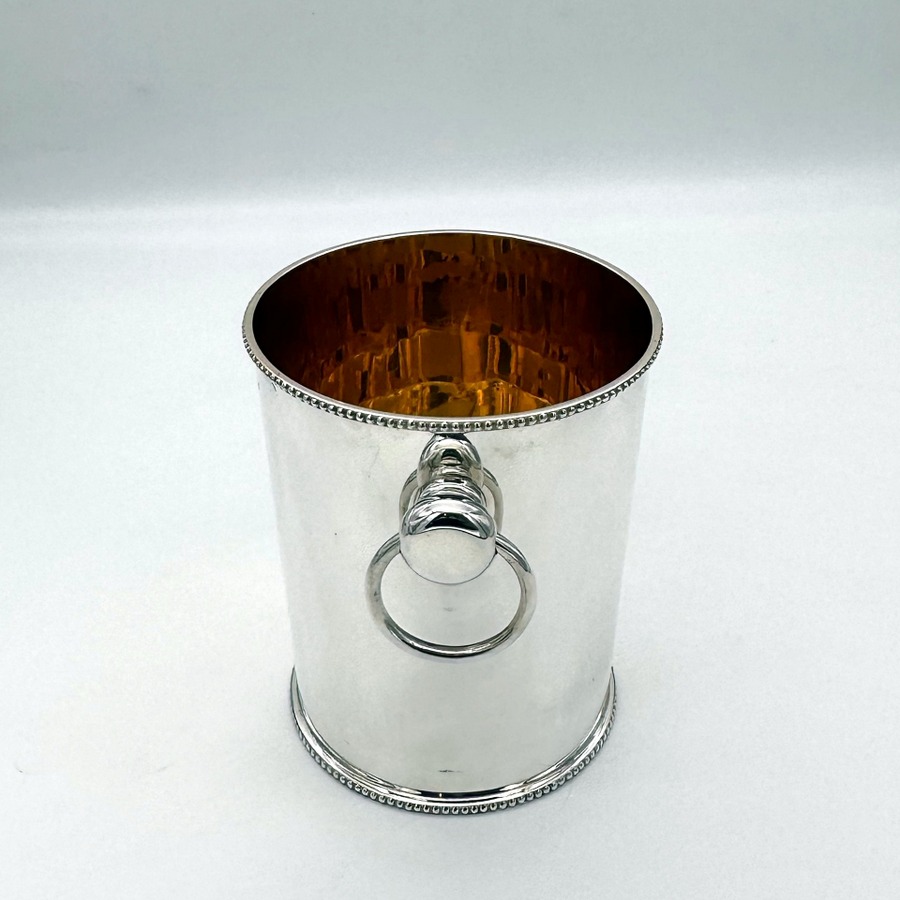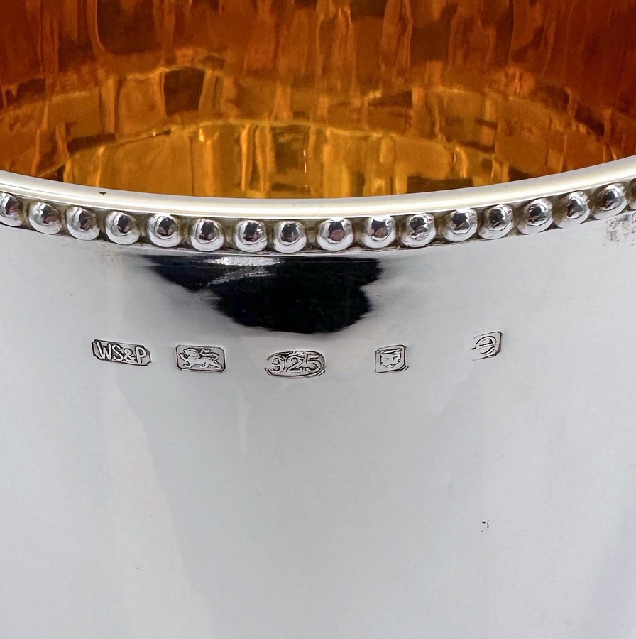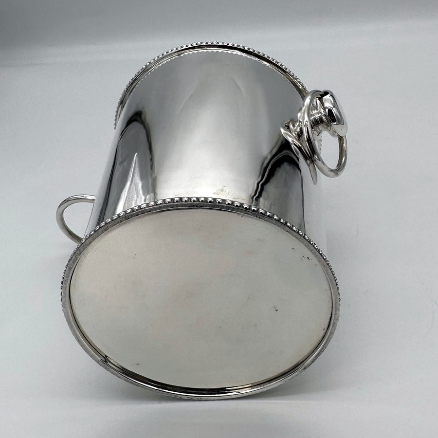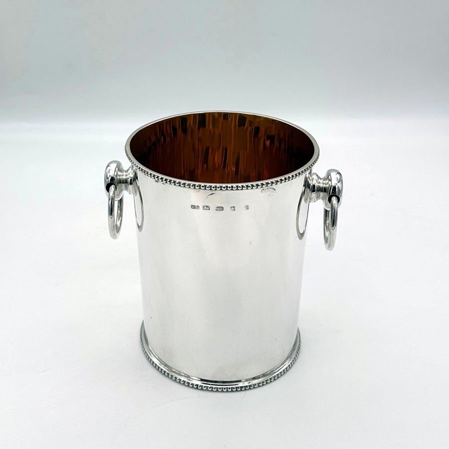 Highly collectable and stunning quality large plain formed sterling silver ice bucket decorated with stylish bead borders and designed with gorgeous drop ring handles. The interior has elegant gilding for decorative visual contrasts.
