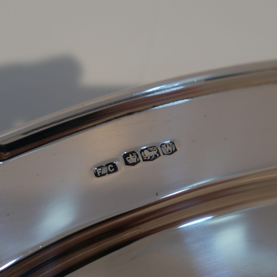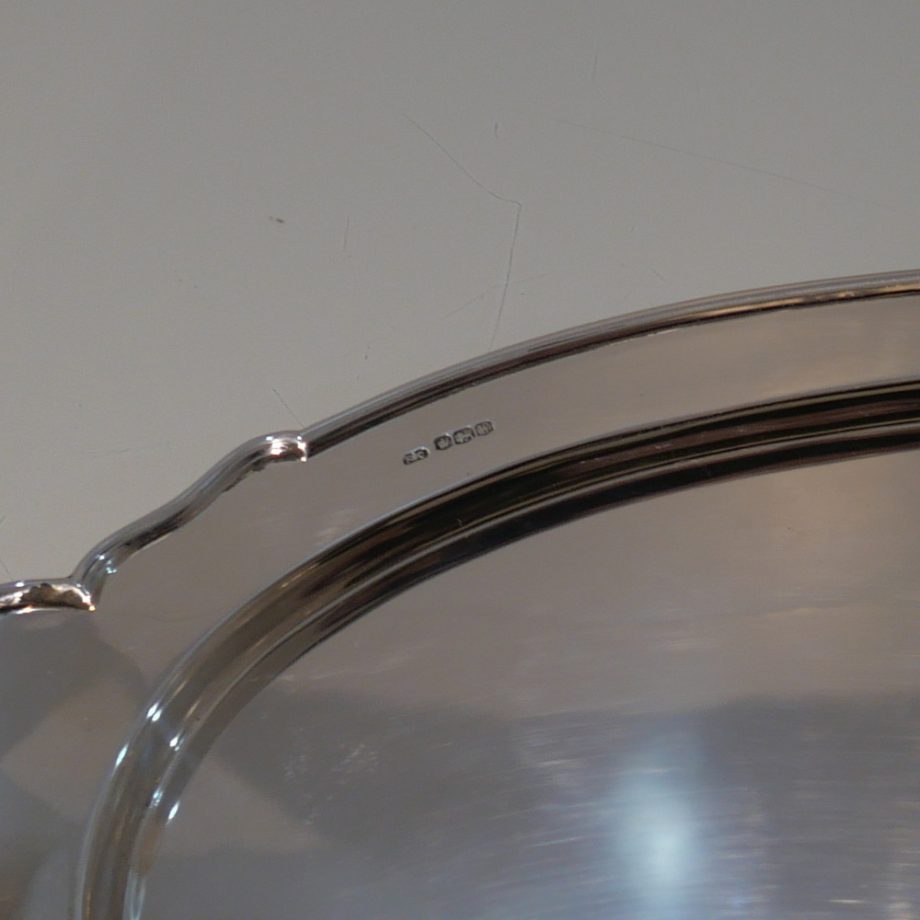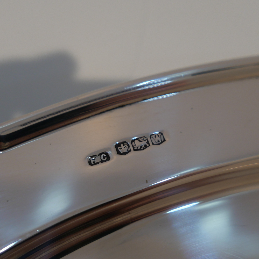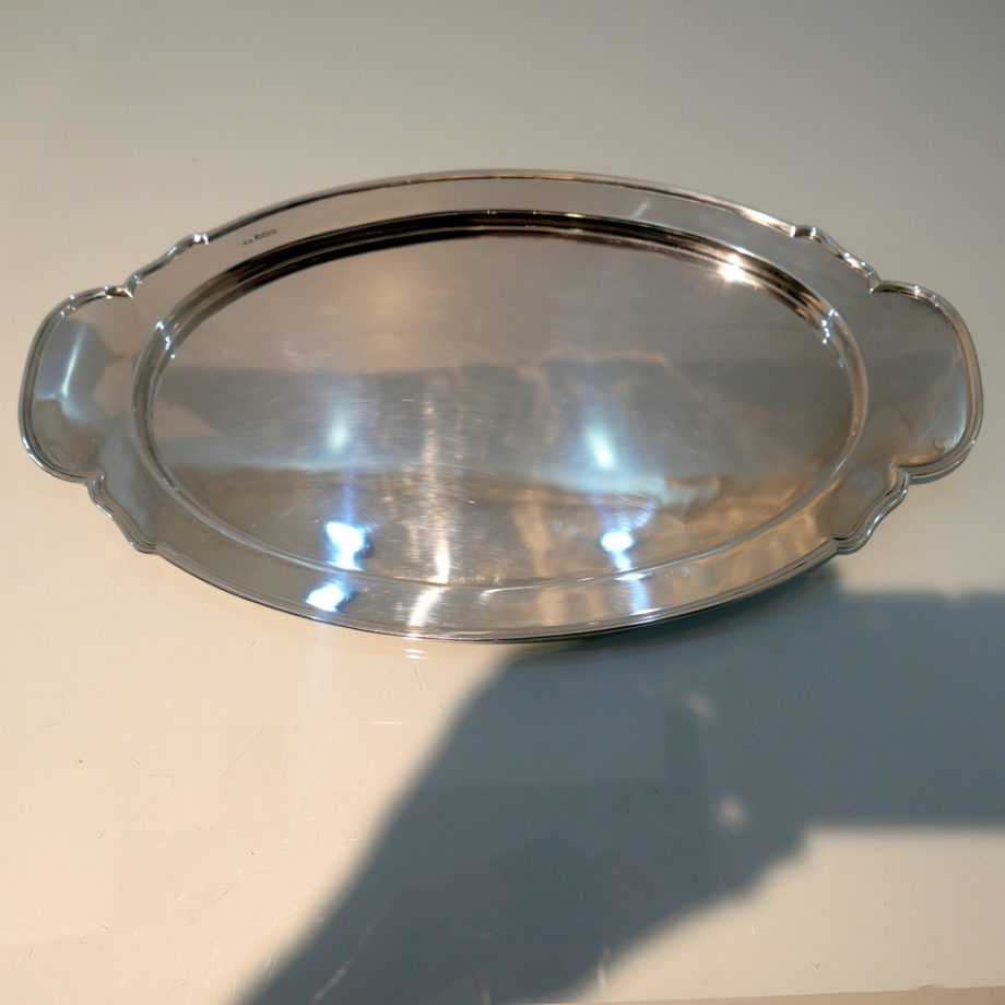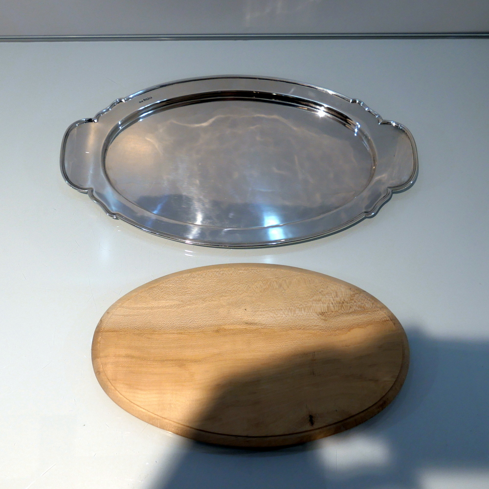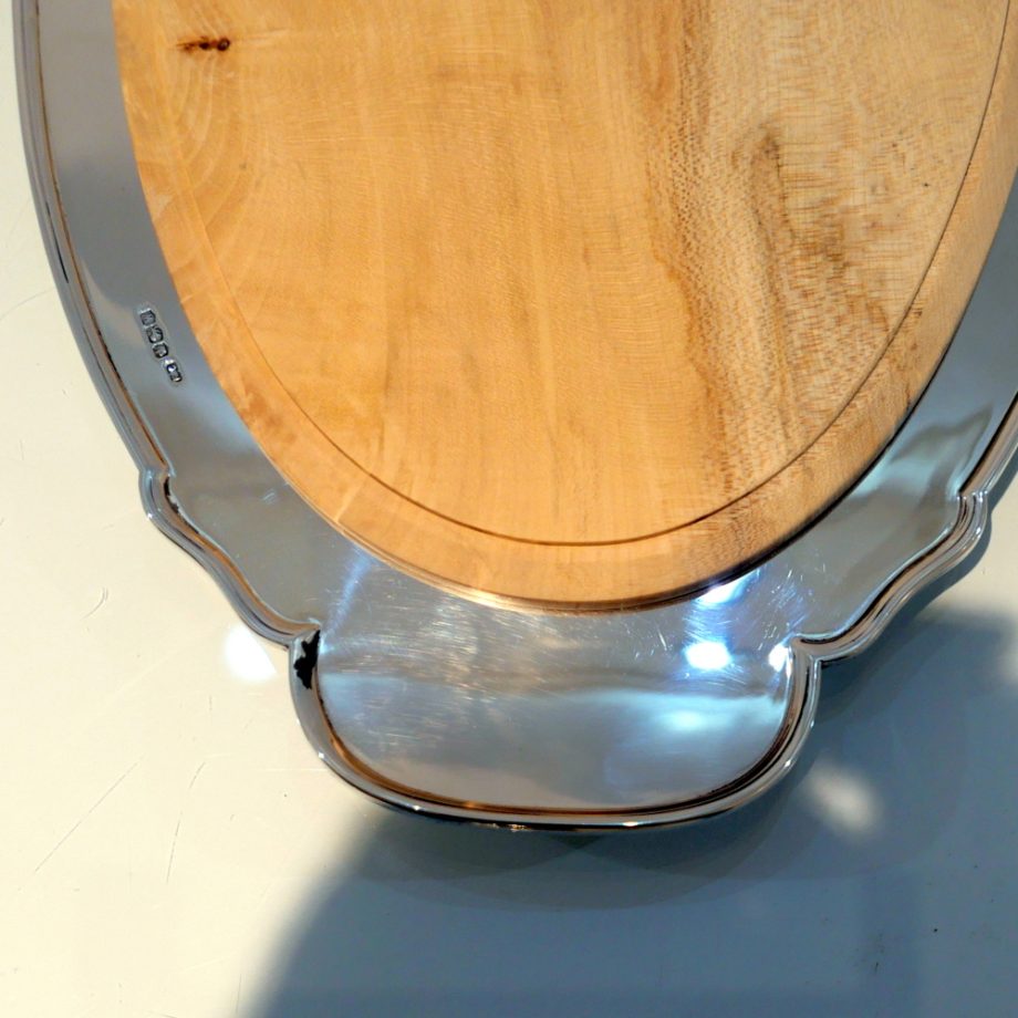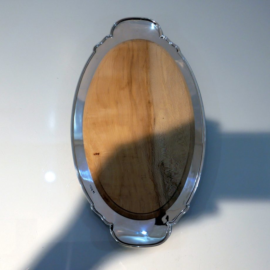 A large and extremely stylish shaped oval sterling silver bread board plain formed in design. Â The outer body has an applied shaped wire rim surround for decorative framing.