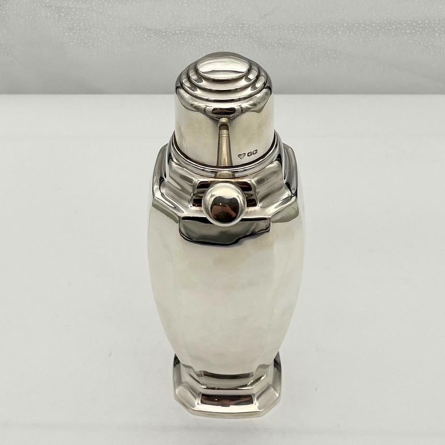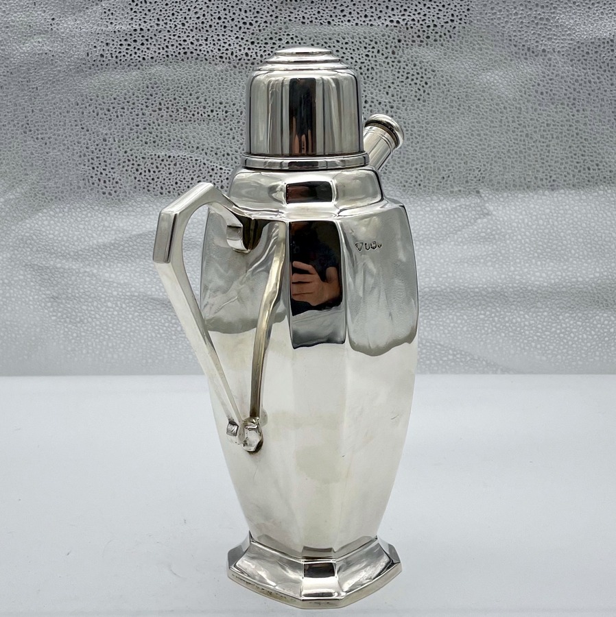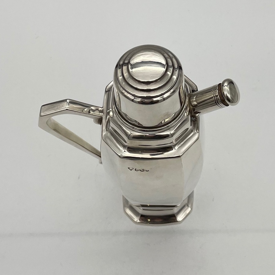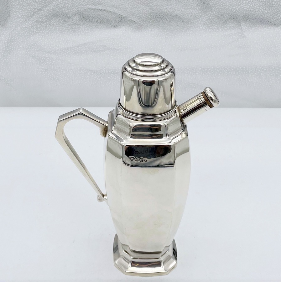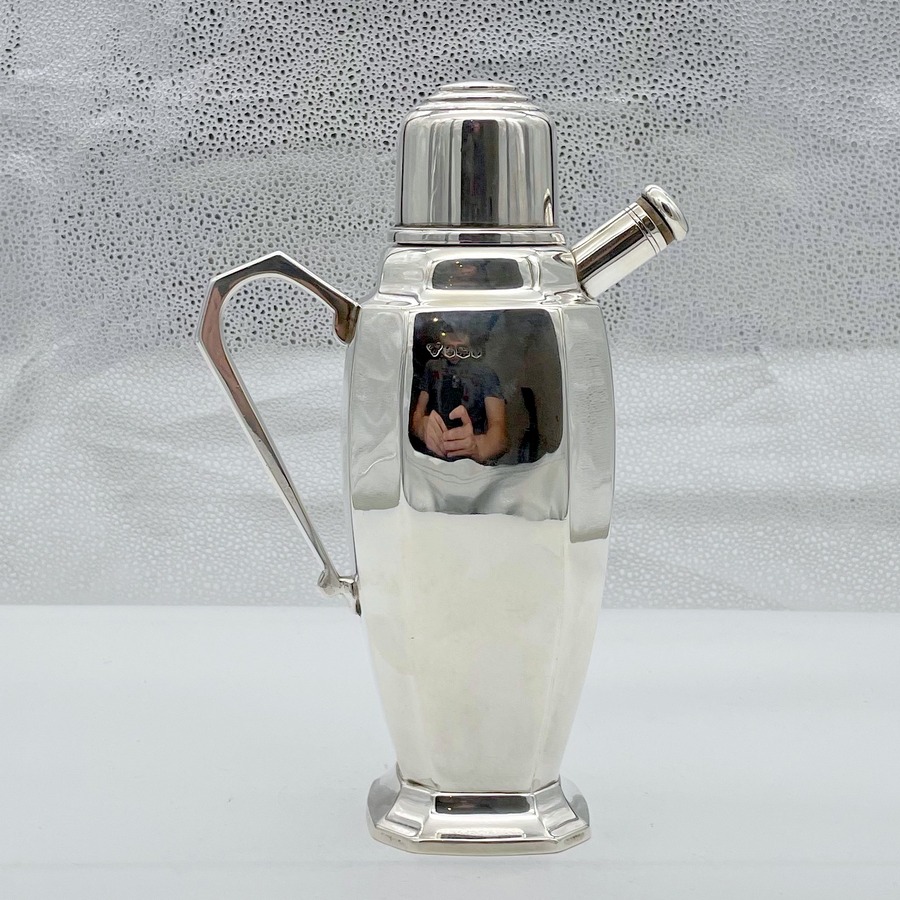 A rare and extremely collectable Art Deco style sterling silver spouted cocktail shaker designed with exemplary clean lines and a stylish detachable circular stepped lid.