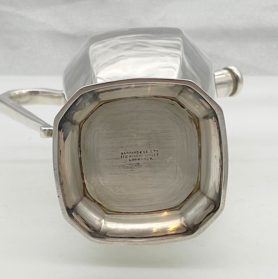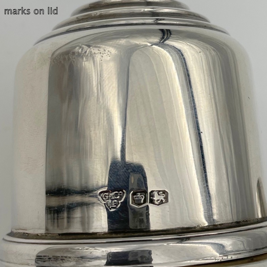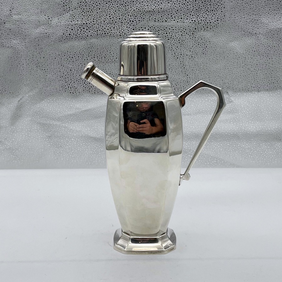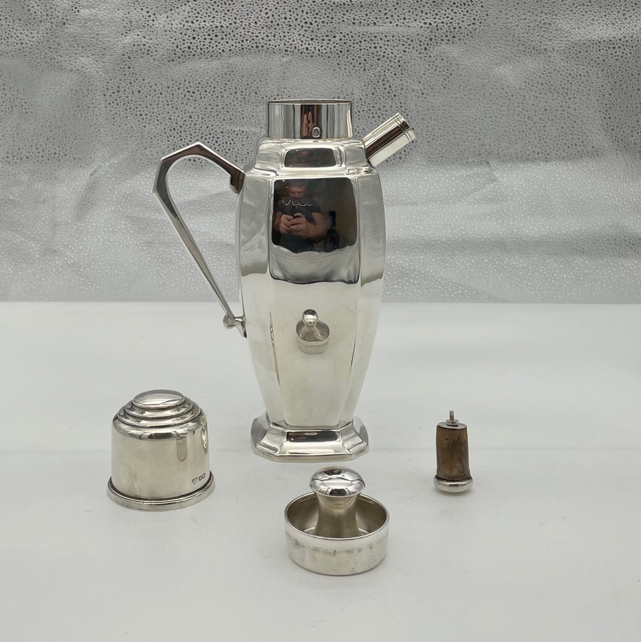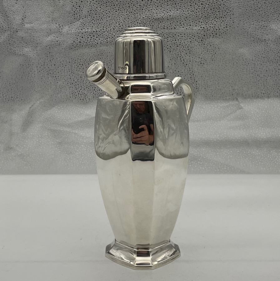A rare and extremely collectable Art Deco style sterling silver spouted cocktail shaker designed with exemplary clean lines and a stylish detachable circular stepped lid.