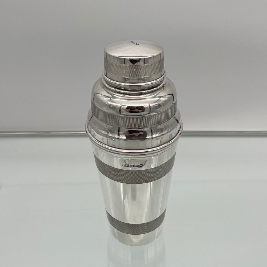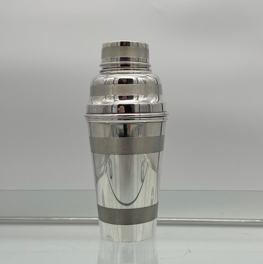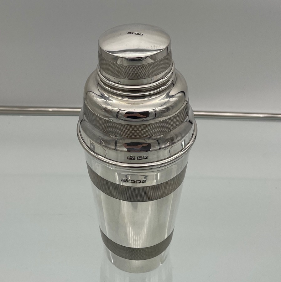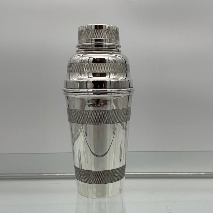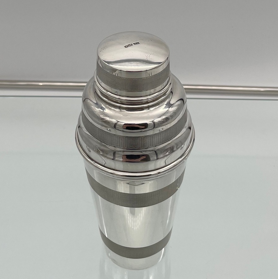 A truly beautiful sterling silver cocktail shaker designed with a slight tapering body and decorated with elegant engine turned bands alternating a plain form background for decorative contrast.
