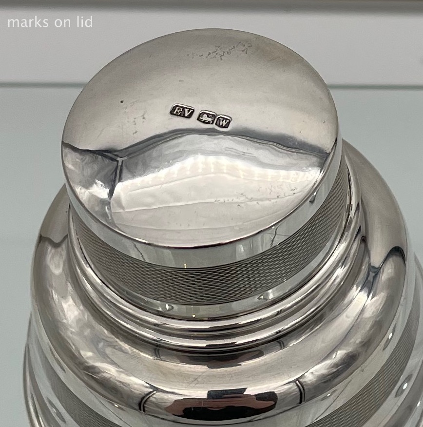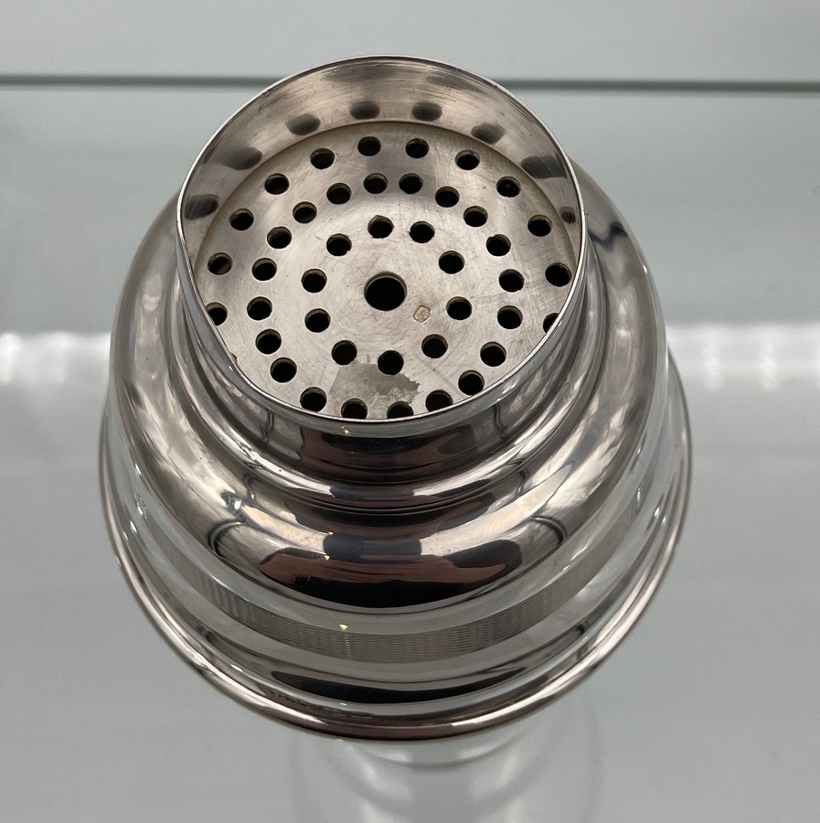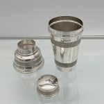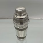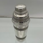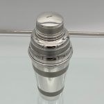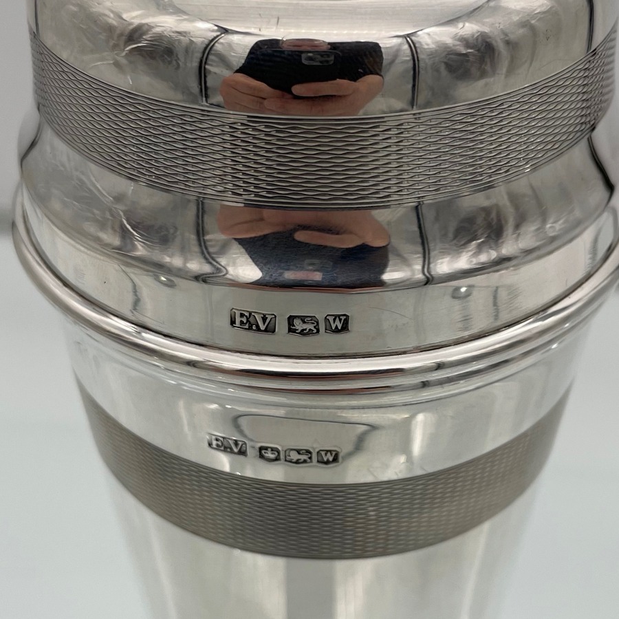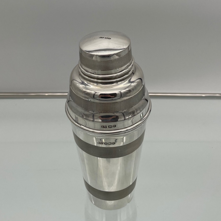 A truly beautiful sterling silver cocktail shaker designed with a slight tapering body and decorated with elegant engine turned bands alternating a plain form background for decorative contrast.