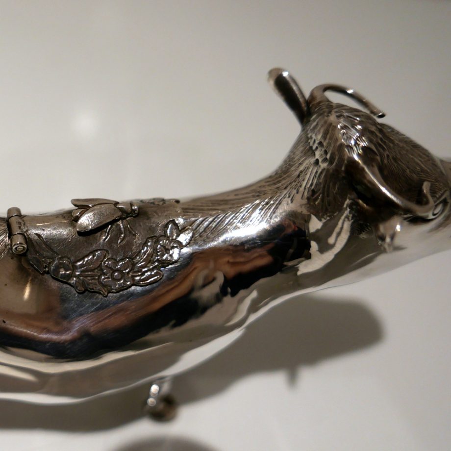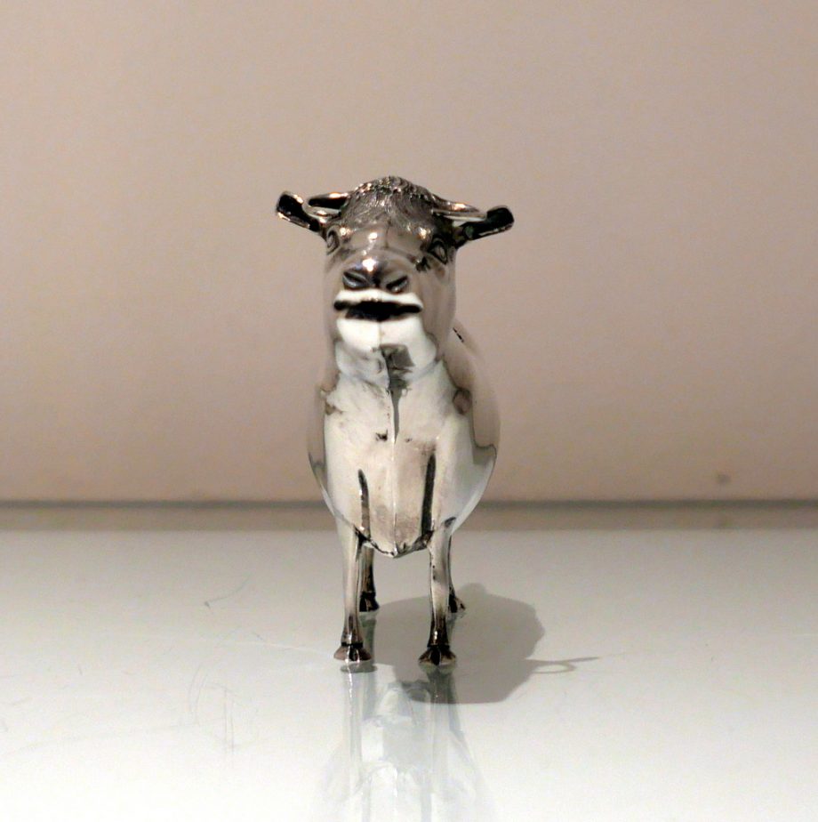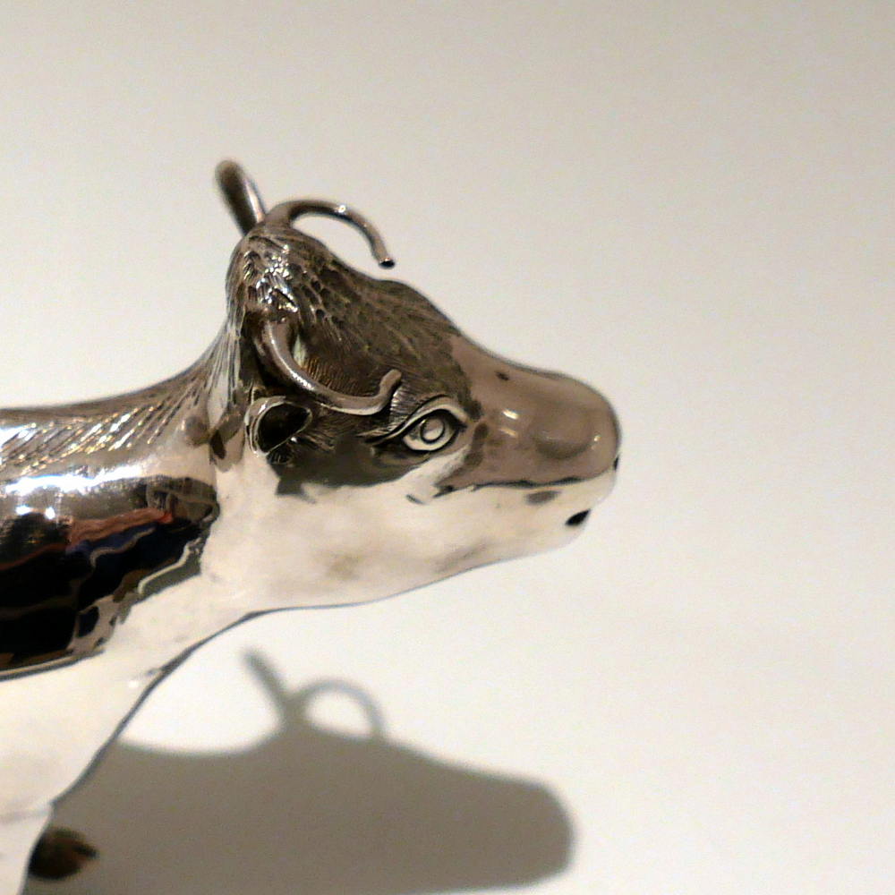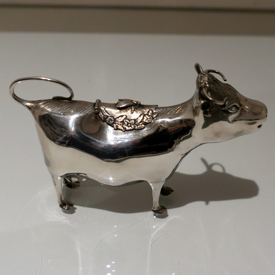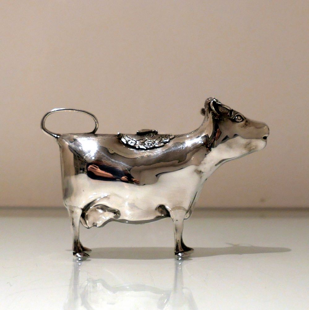 A beautiful sterling silver cow cream jug made by the highly renowned Carrington & Co. Â The model is elegantly formed with realistic features and a superbly ornate hinged flap.