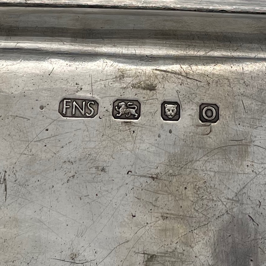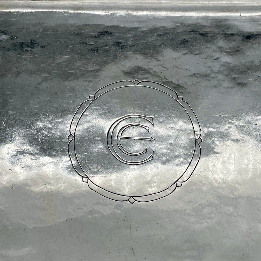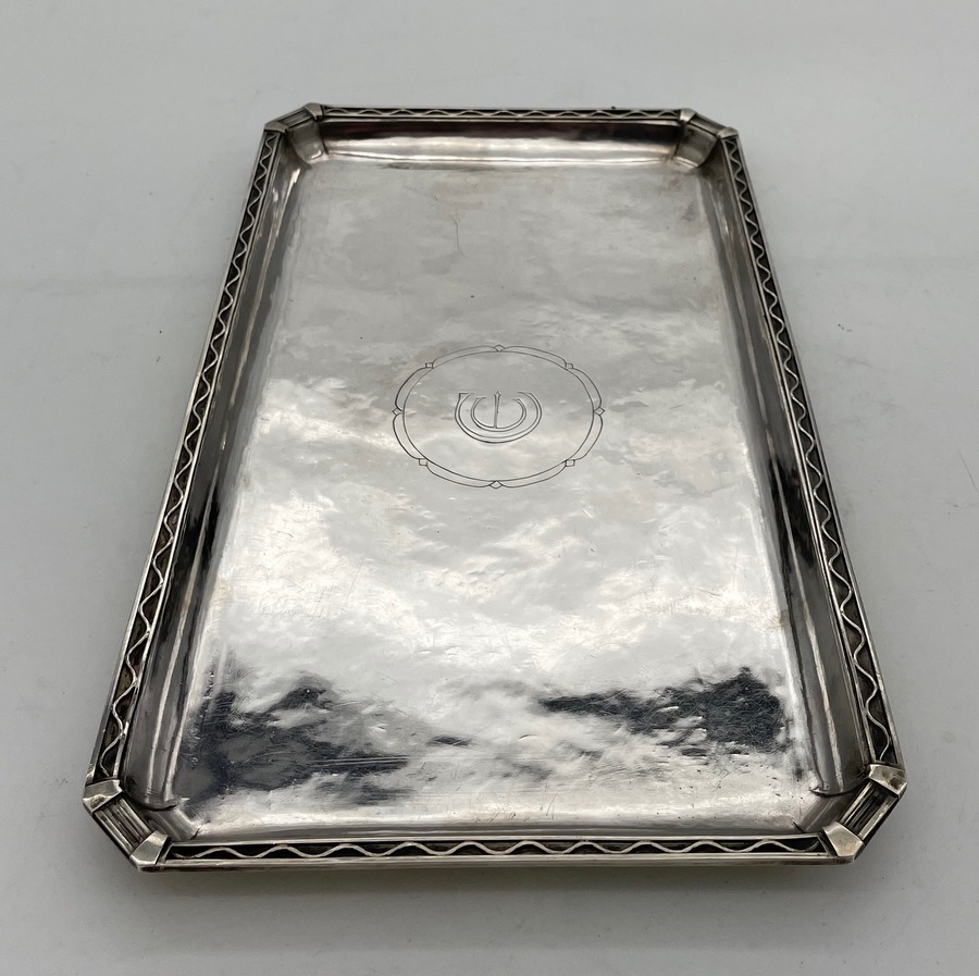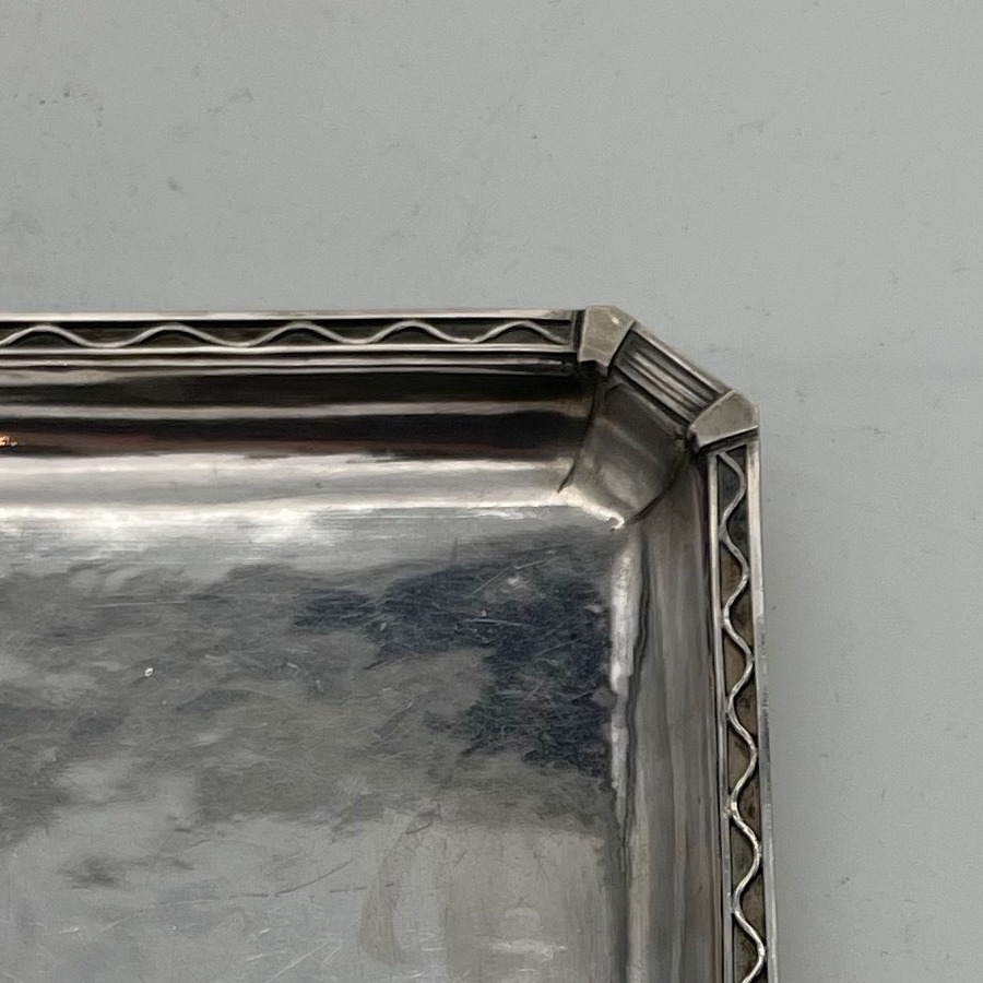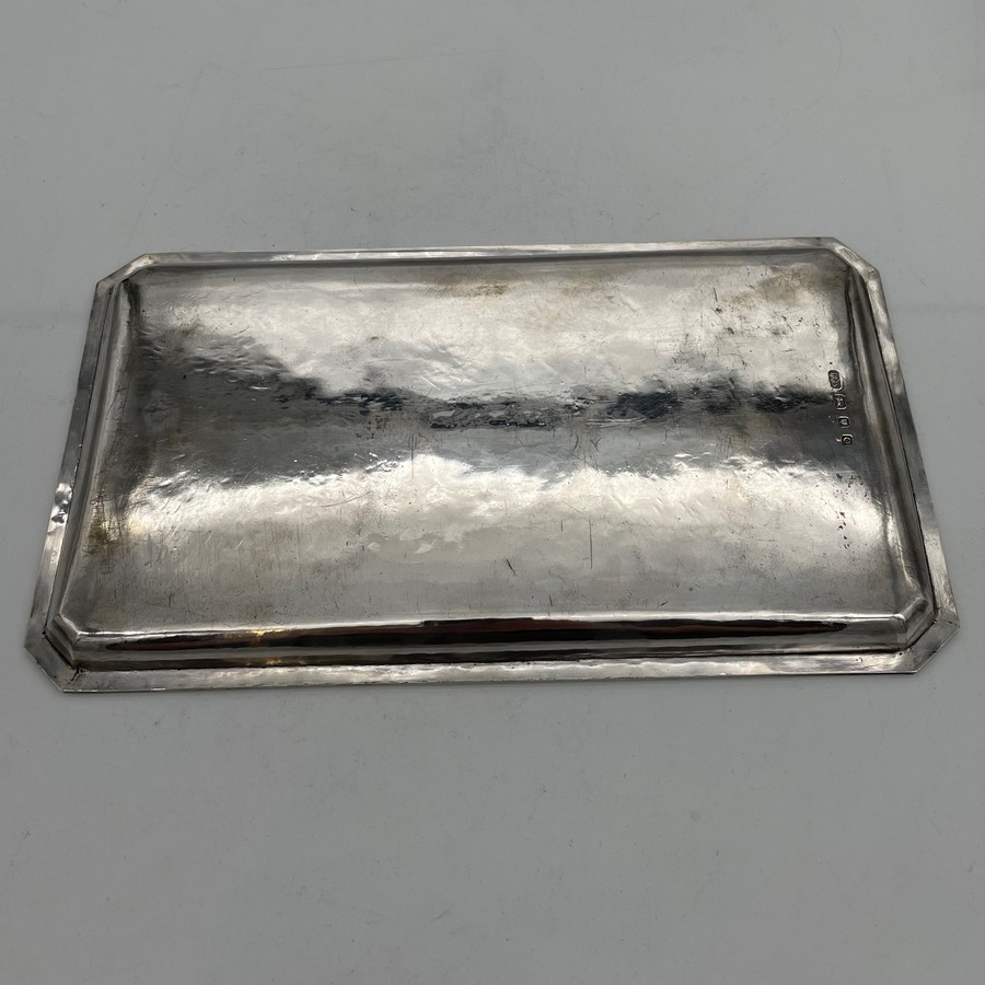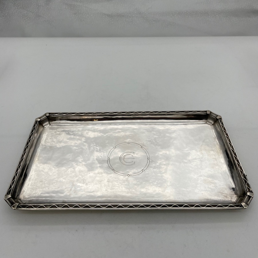 A fabulous rectangular cut cornered sterling silver drinks/serving tray designed with a highly desirable hammered patina and outer raised walls which has been mounted with a stylish applied swag patterned decorative border. Â The centre front has a hand engraved contemporary initial for importance.