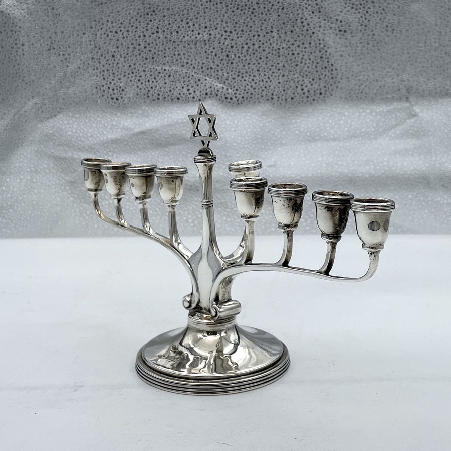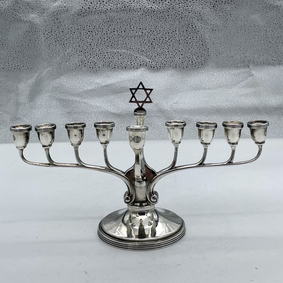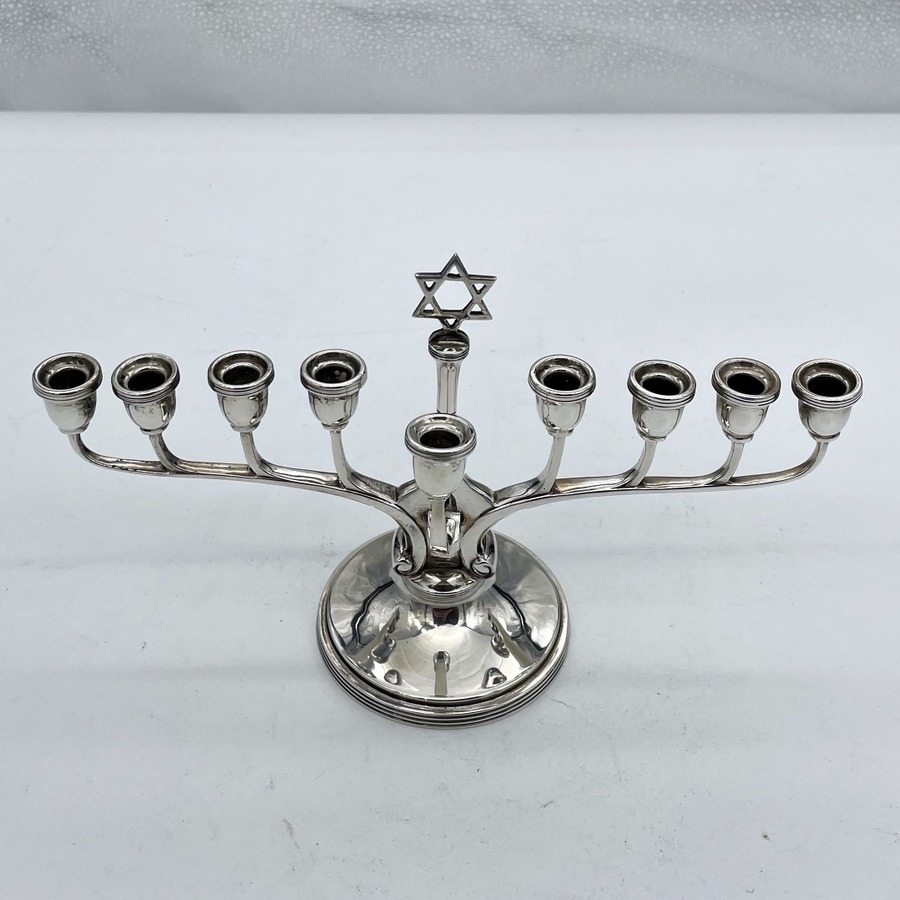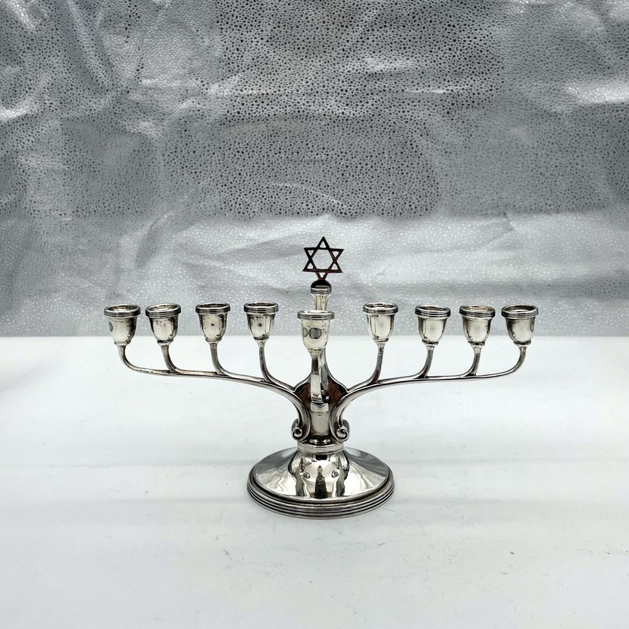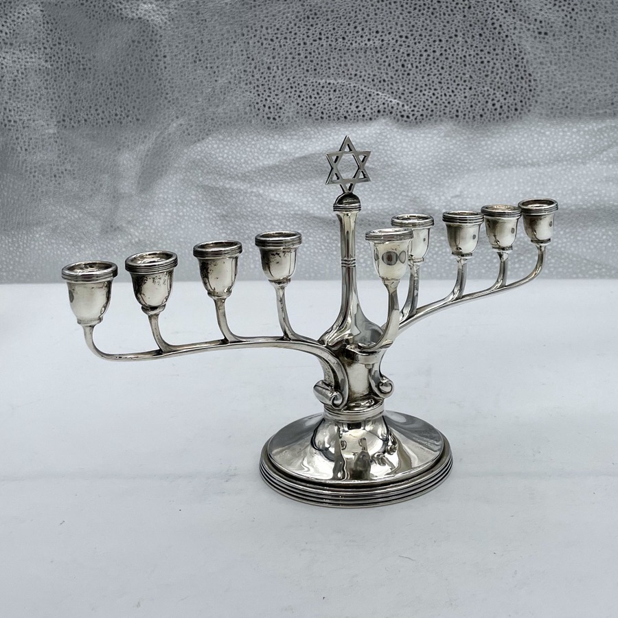 A fabulous sterling silver menorah designed with Georg Jensen style influences and targeting Art Deco revival movement tastes.