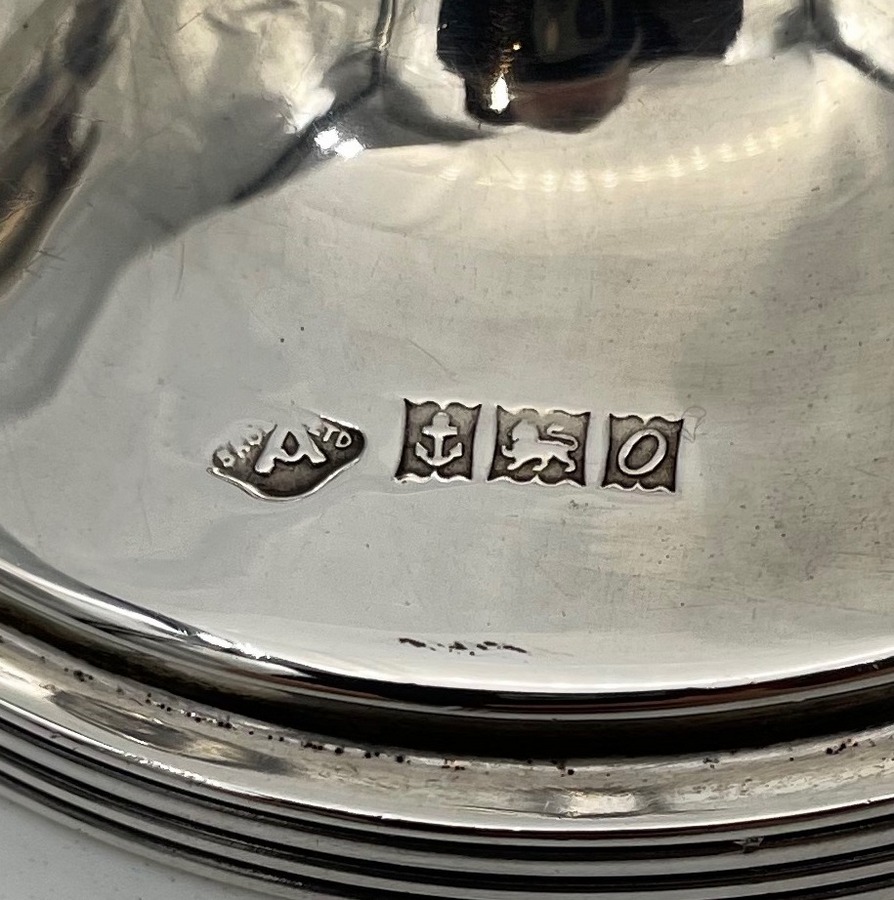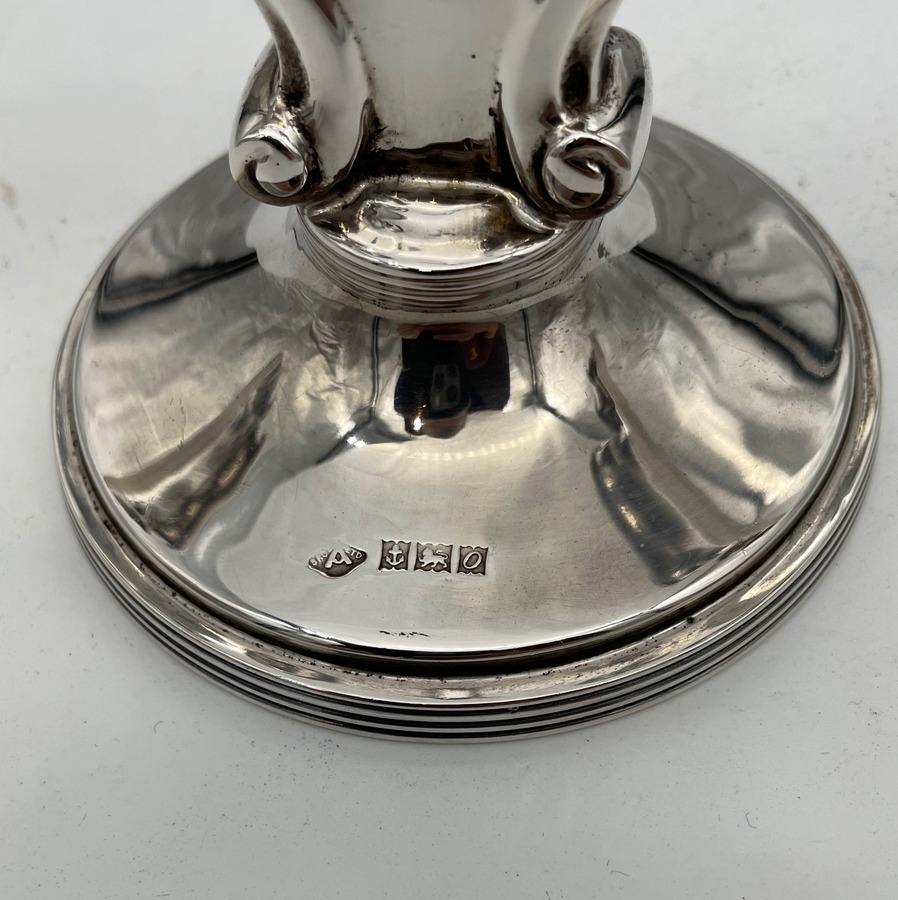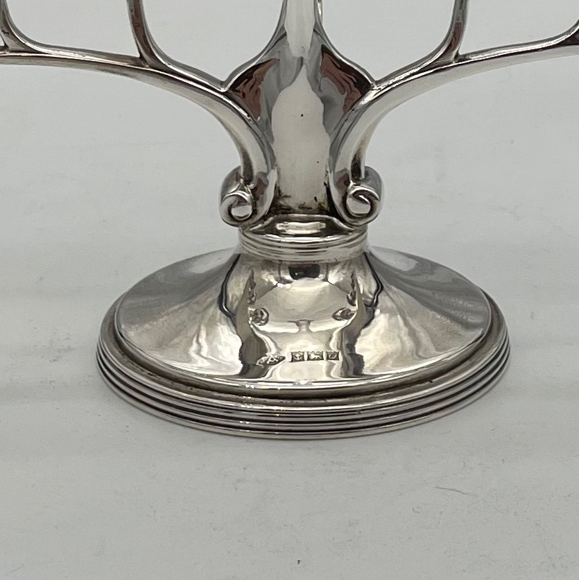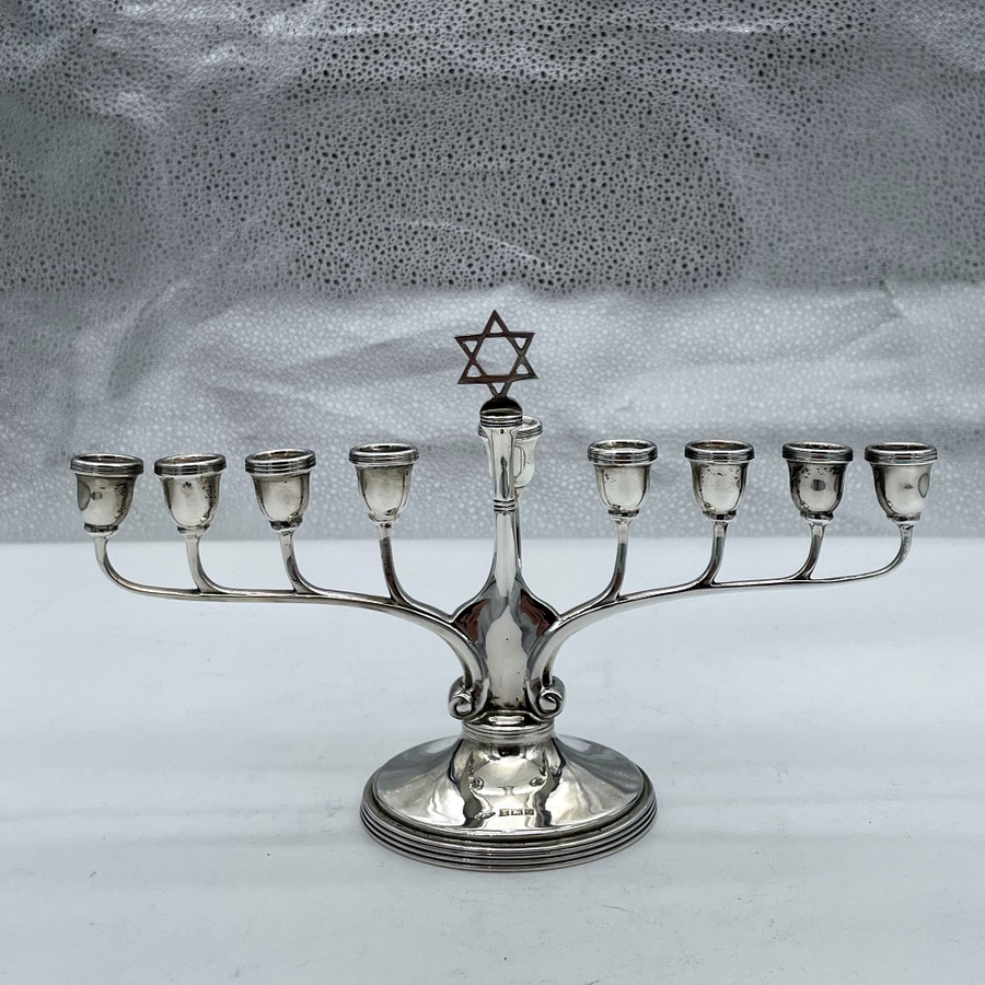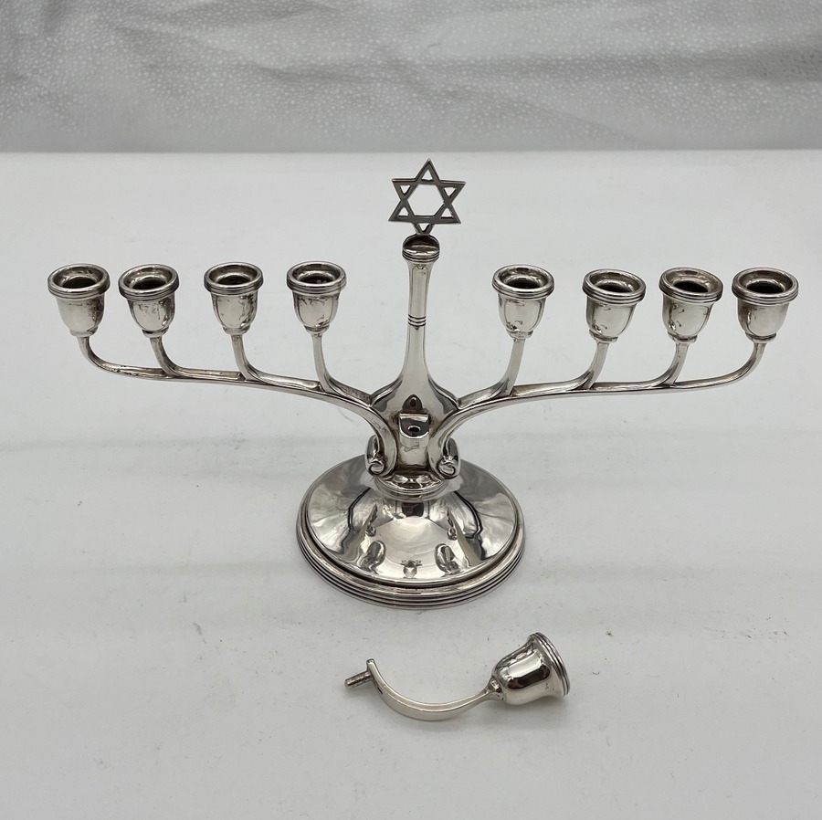 A fabulous sterling silver menorah designed with Georg Jensen style influences and targeting Art Deco revival movement tastes.