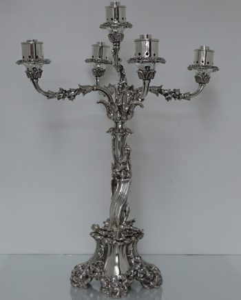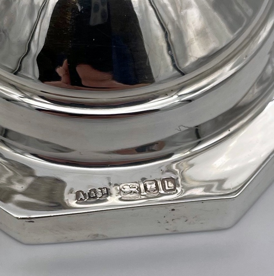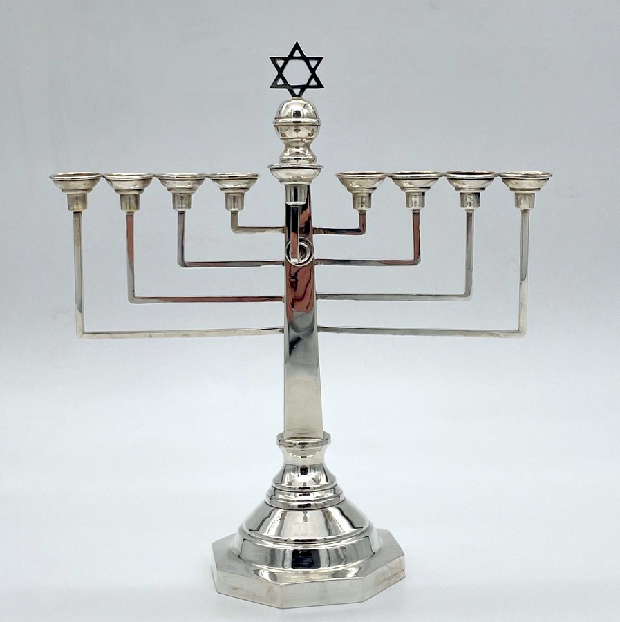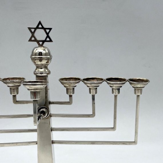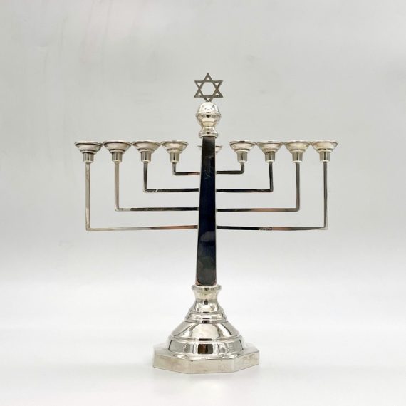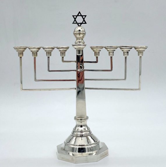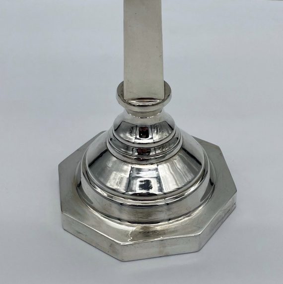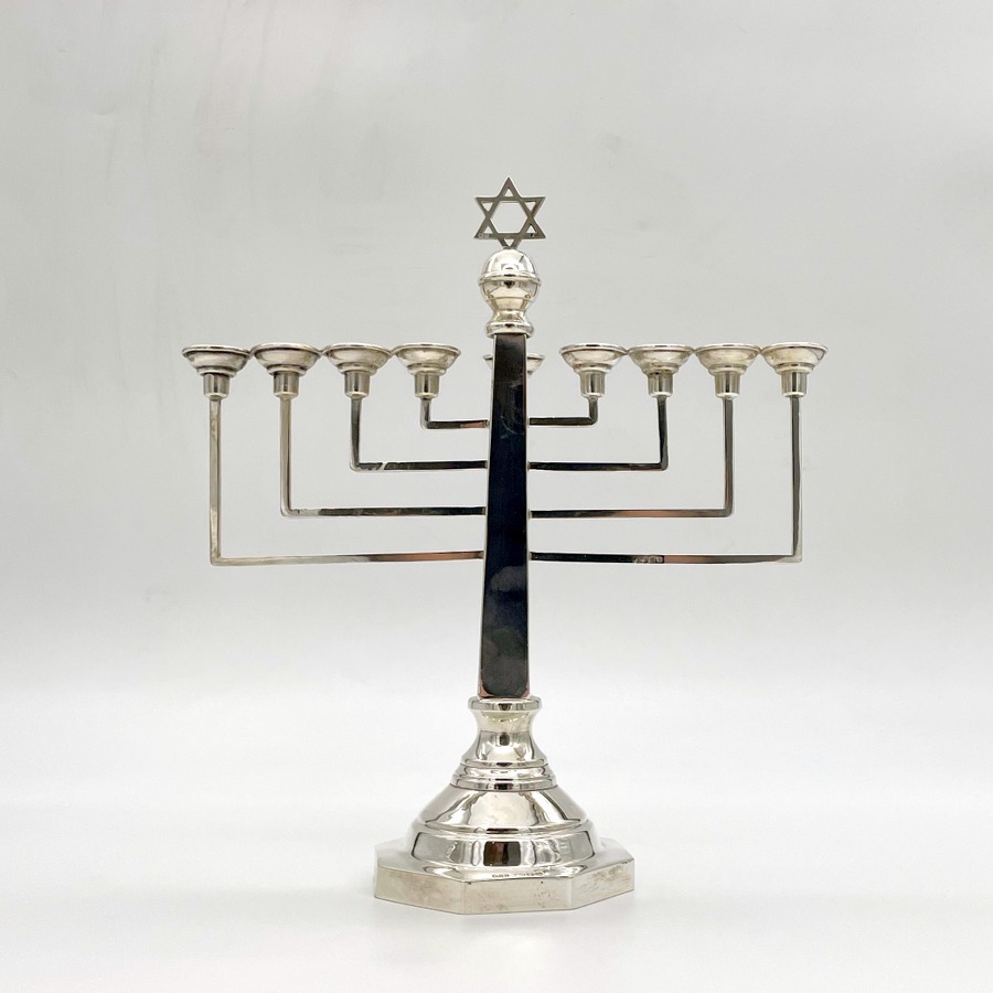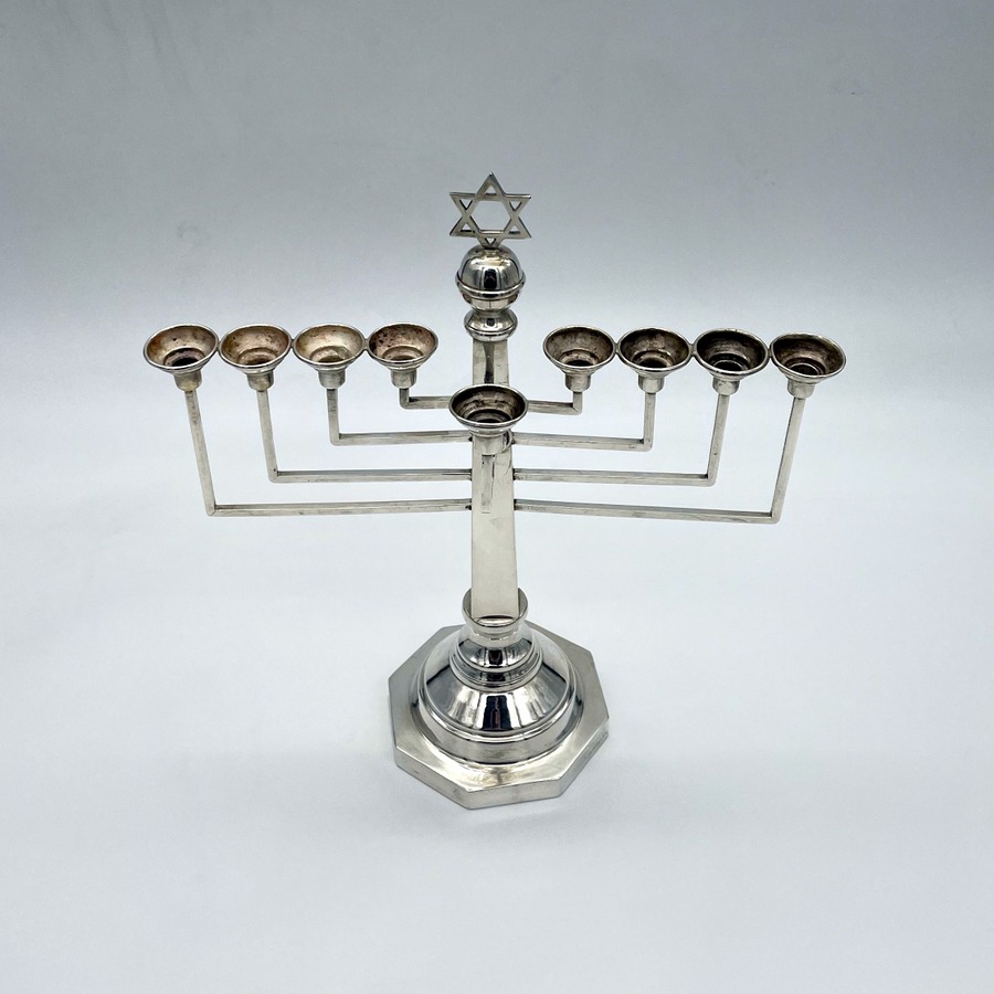 PA delightful mid 20th century sterling silver menorah designed with an elegant octagonal foot and a modernistic tubelar stem. The shamash is fixed.