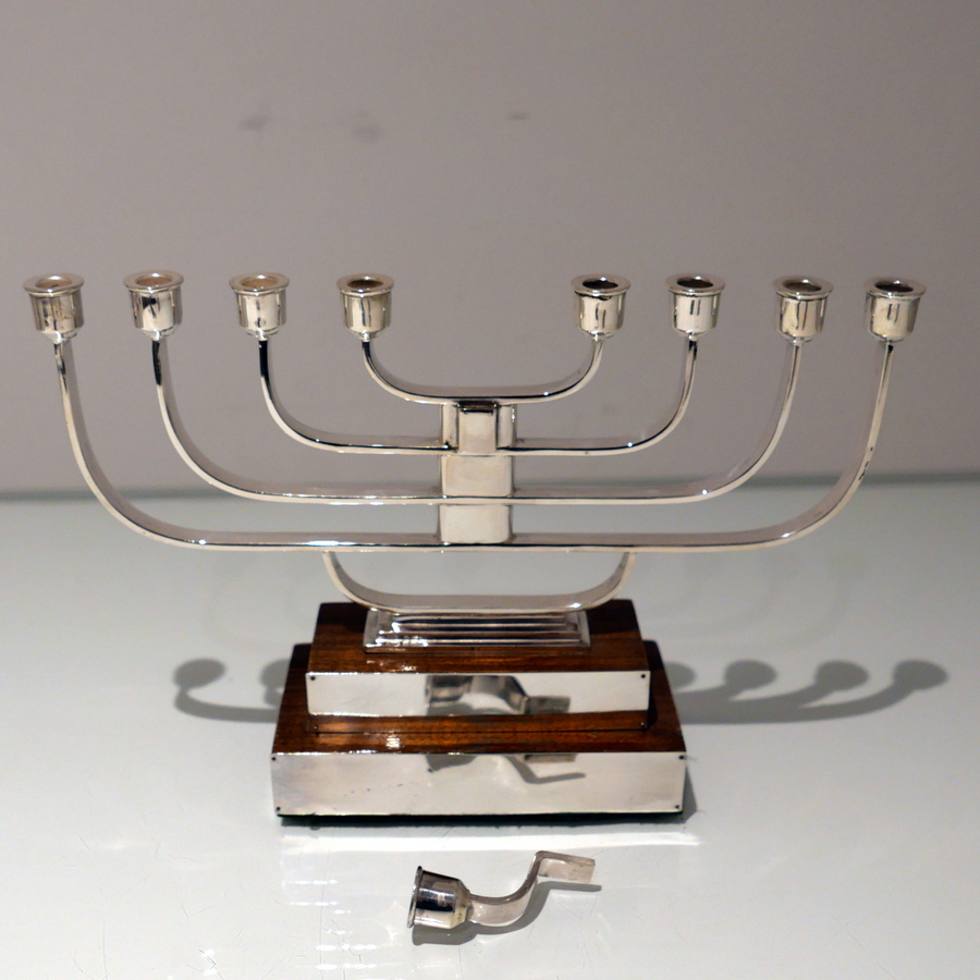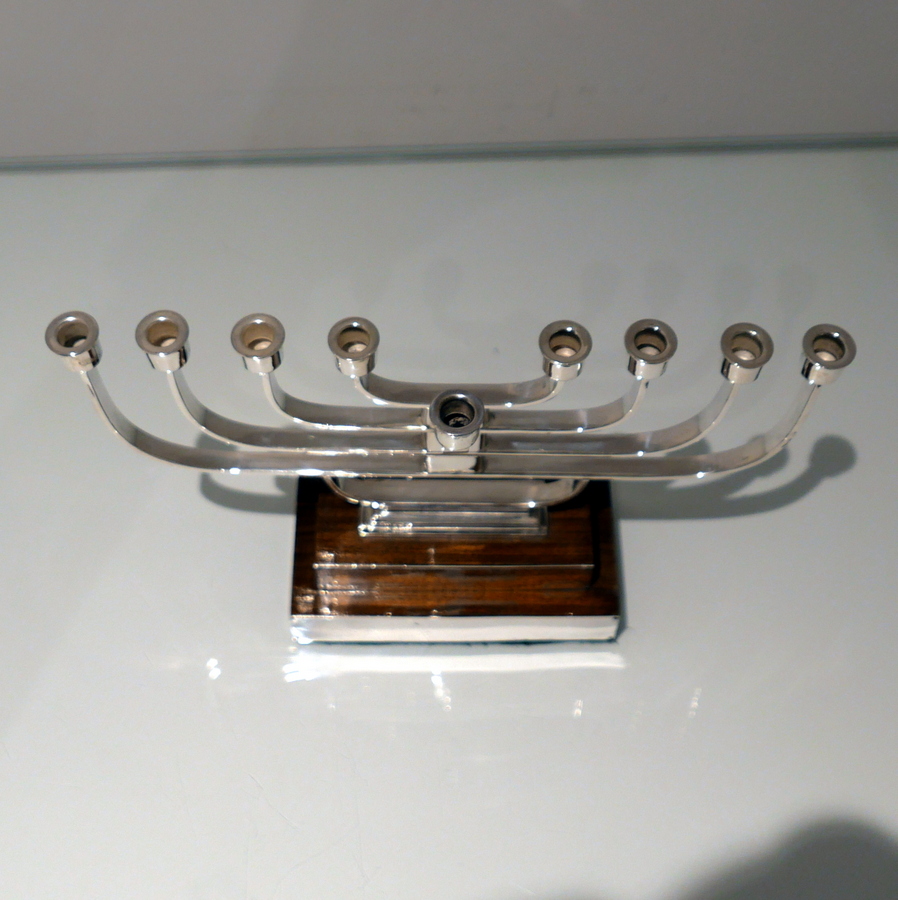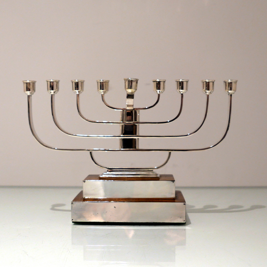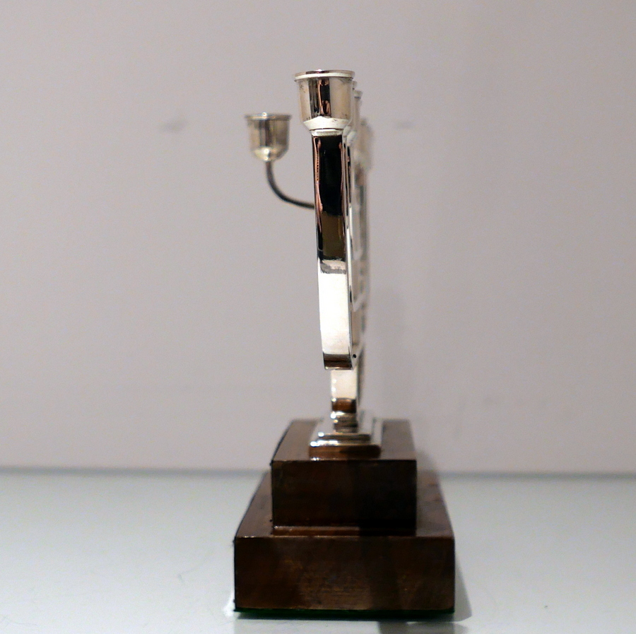 A rare and highly desirable Art Deco inspired wire work menorah designed with a beautiful modern touch and sitting on a large rectangular varnished wood stepped base.