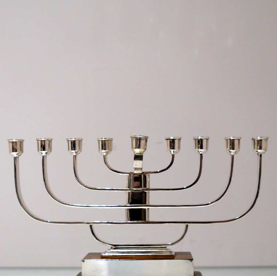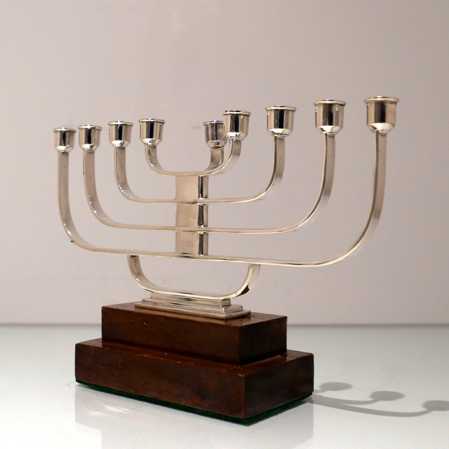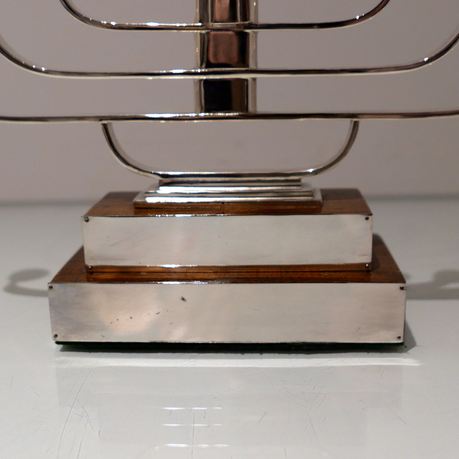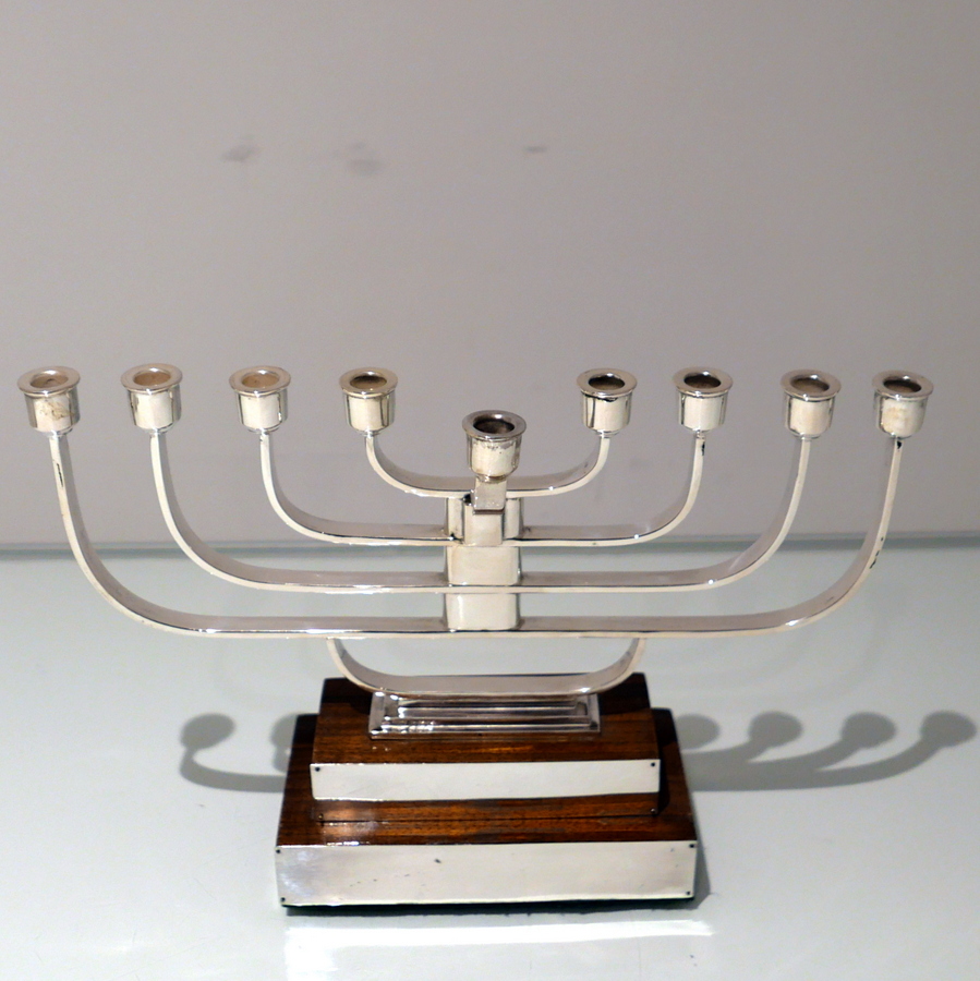 A rare and highly desirable Art Deco inspired wire work menorah designed with a beautiful modern touch and sitting on a large rectangular varnished wood stepped base.
