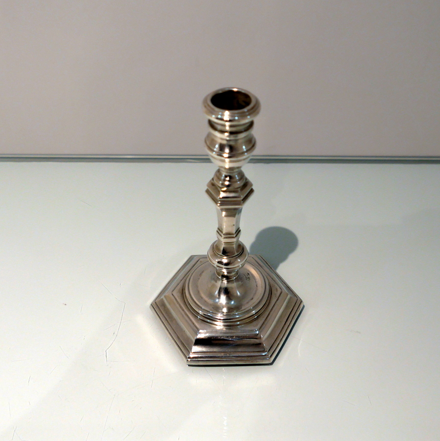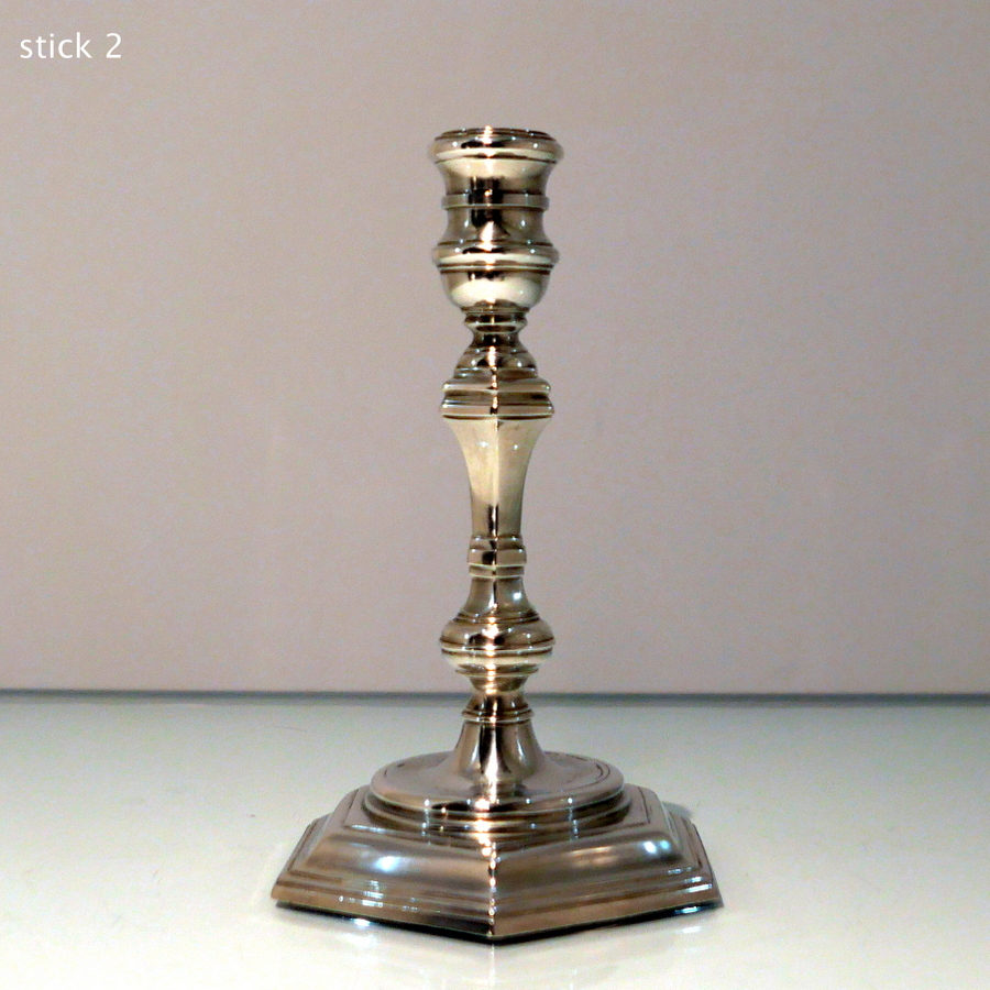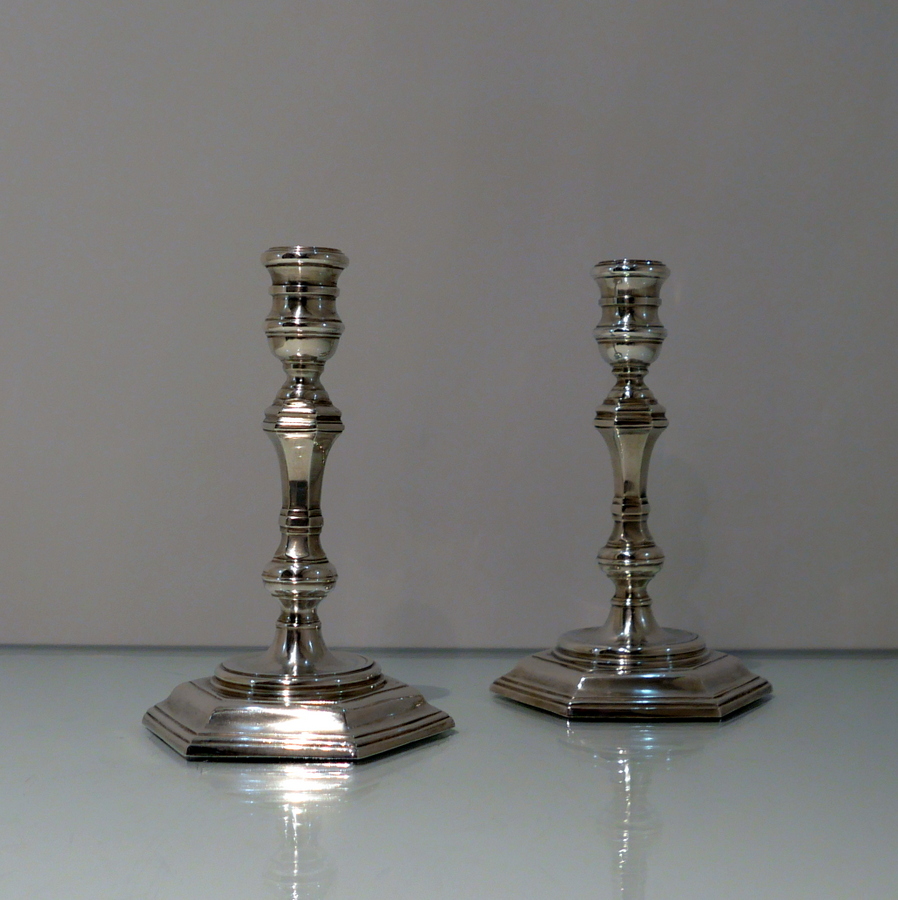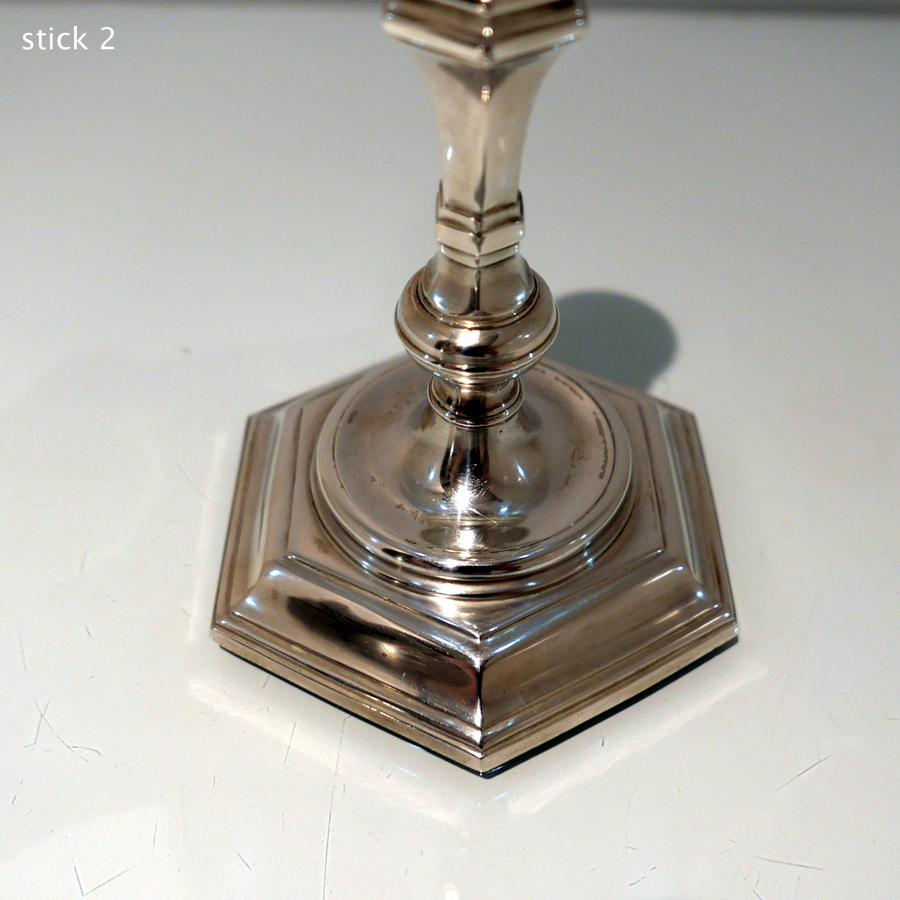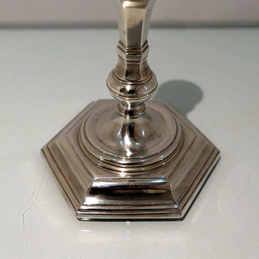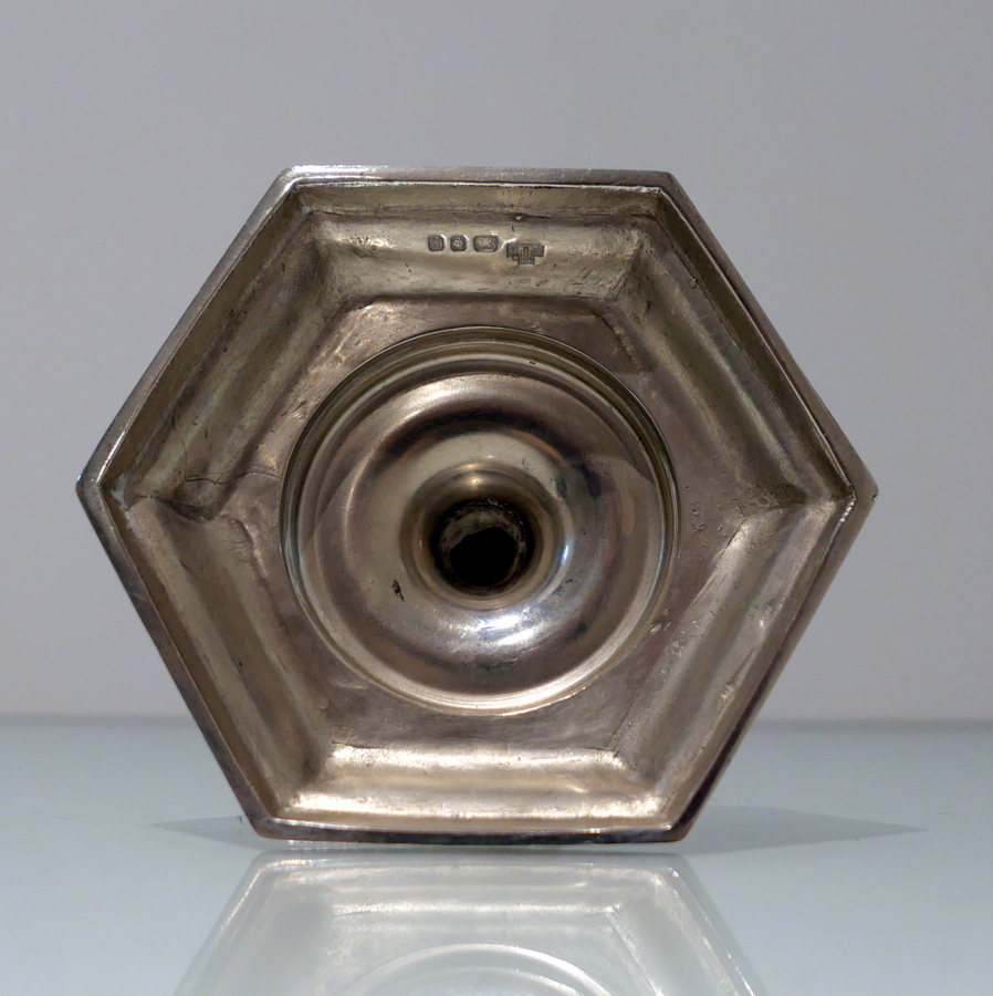 A stunning quality pair of plain formed sterling silver hexagonal cast (bases) candlesticks designed with strap work capitals, tapering stems and sunken in wells.
