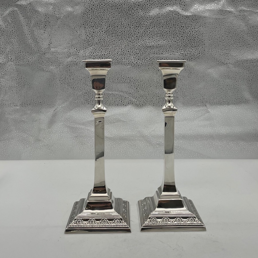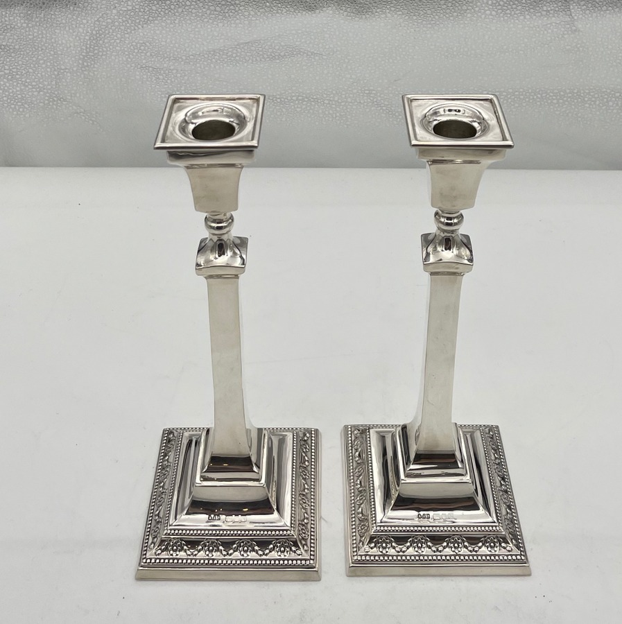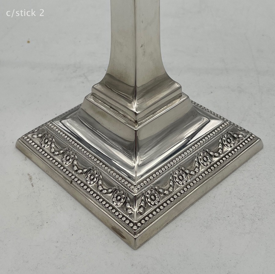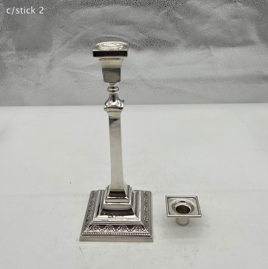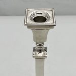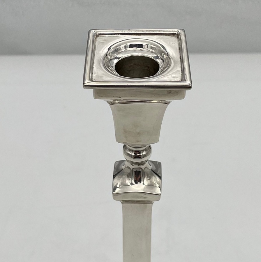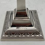 A wonderful pair of sterling silver sabbath candlesticks designed with plain formed sheet silver stems and elaborate double bead decorations to the outer square bases.