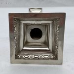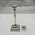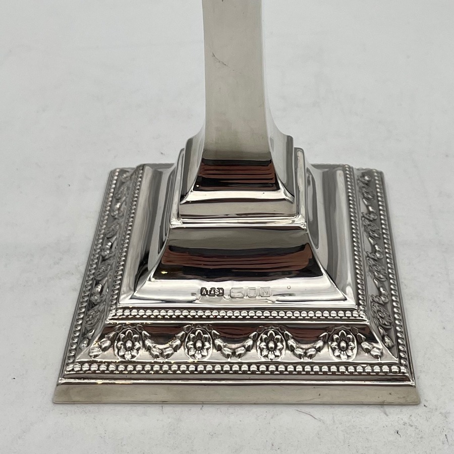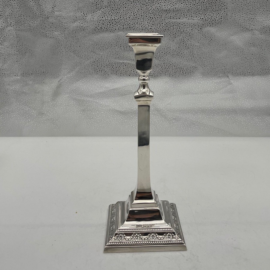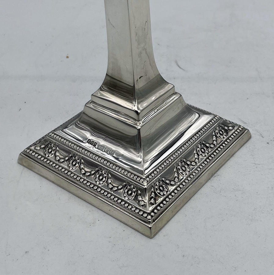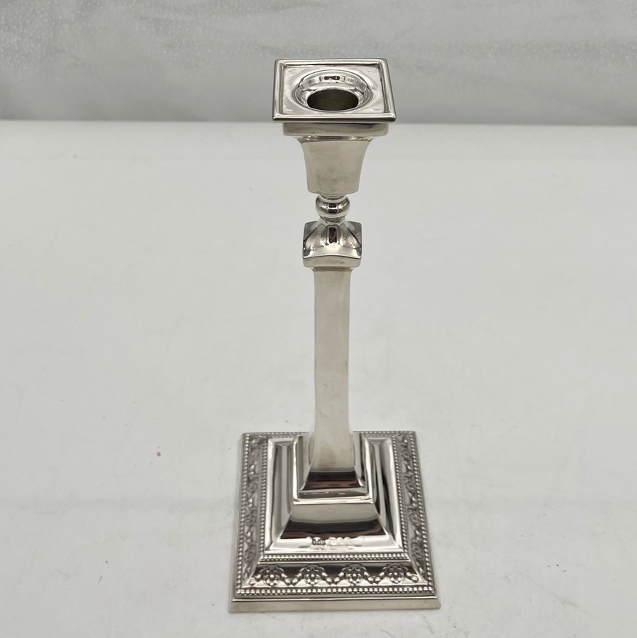 A wonderful pair of sterling silver sabbath candlesticks designed with plain formed sheet silver stems and elaborate double bead decorations to the outer square bases.