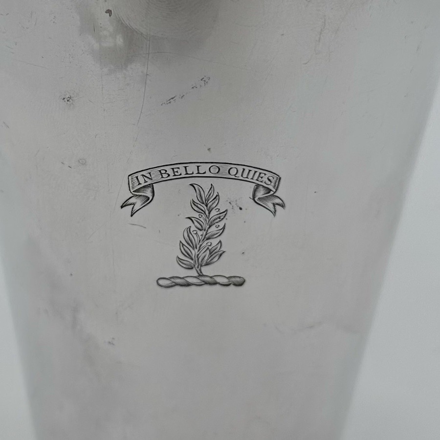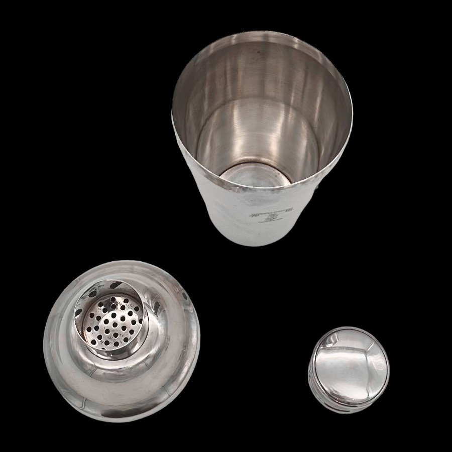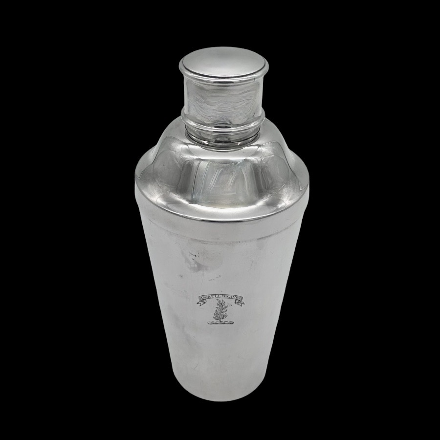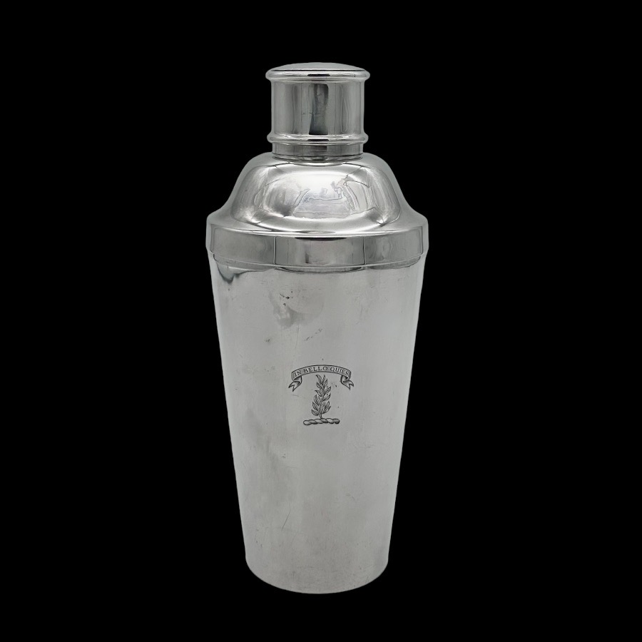 Stylish plain formed sterling silver Art Deco cocktail shaker designed with elegant tapering walls and a focal point hand engraved original crest for decorative importance.