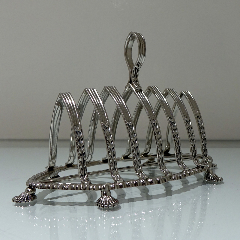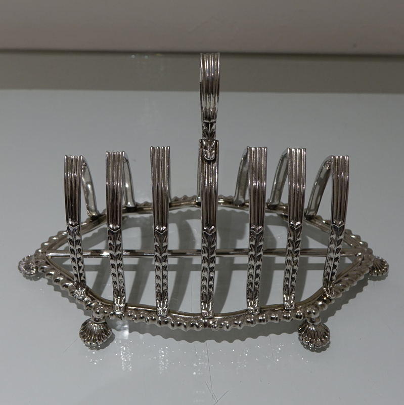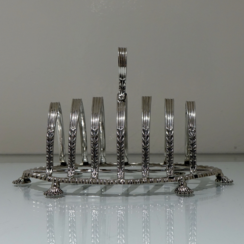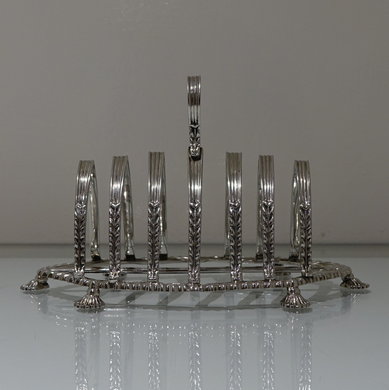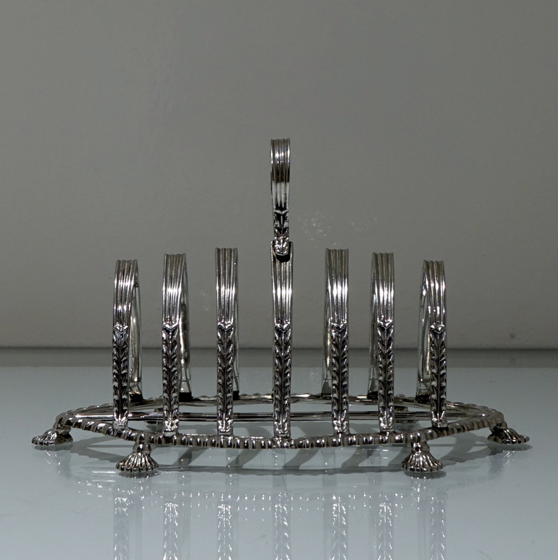 A superb quality seven bar toast rack decorated with a lower gadroon oval border wire frame which then sits on six shell feet. Â The upper bars of the place setting spacers have gadroon wires for decorative highlights. Â The central handle has additional gadroon decoration which sits above an ornate casting which repeats itself throughout the aforementioned place setting spacers.