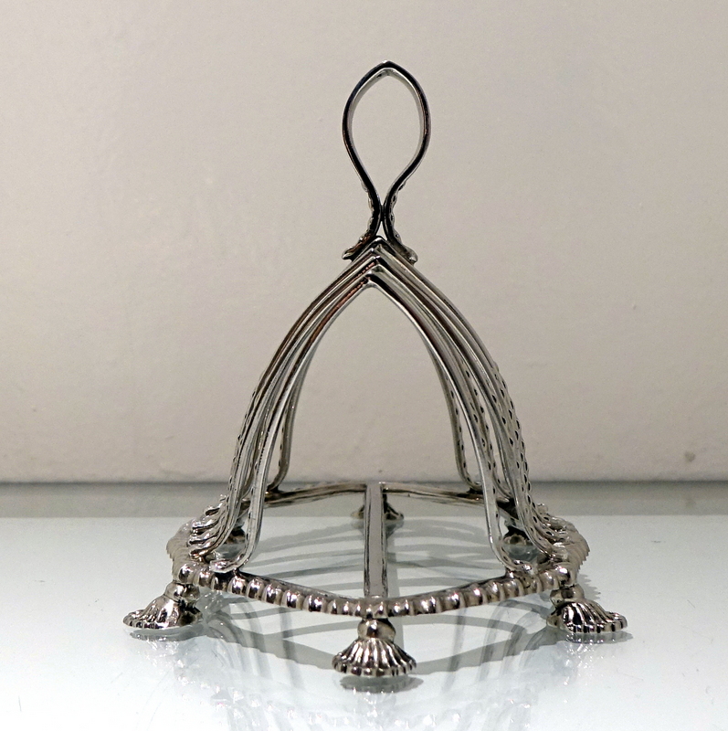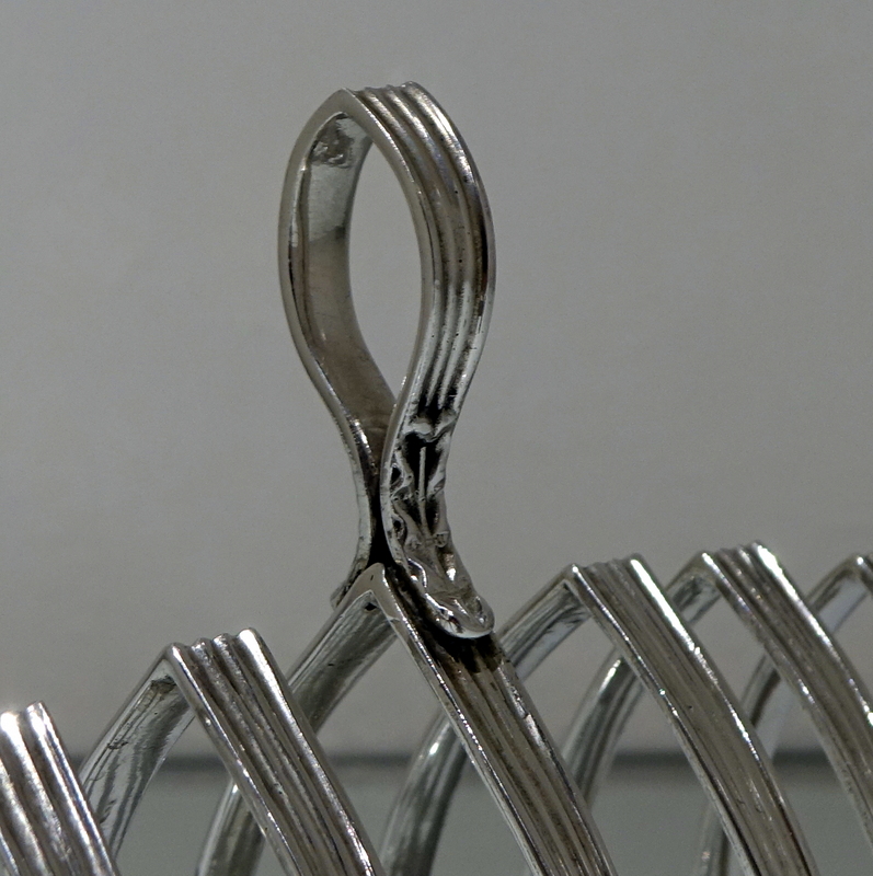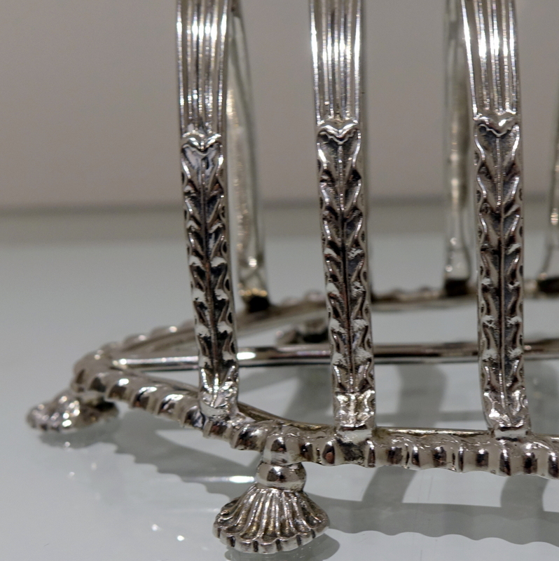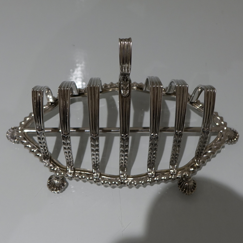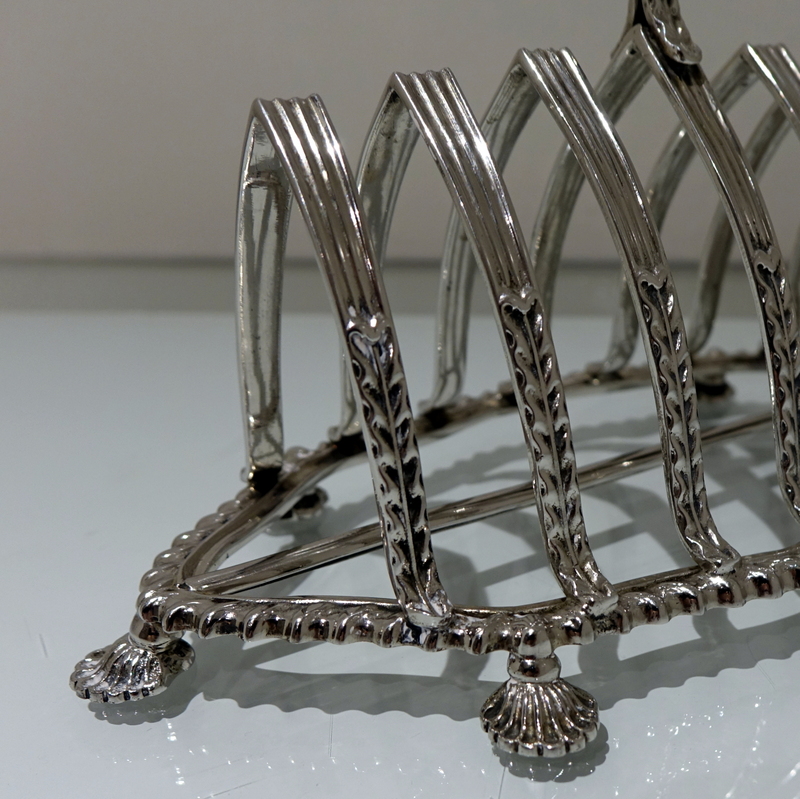 A superb quality seven bar toast rack decorated with a lower gadroon oval border wire frame which then sits on six shell feet. Â The upper bars of the place setting spacers have gadroon wires for decorative highlights. Â The central handle has additional gadroon decoration which sits above an ornate casting which repeats itself throughout the aforementioned place setting spacers.