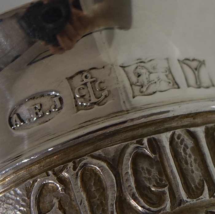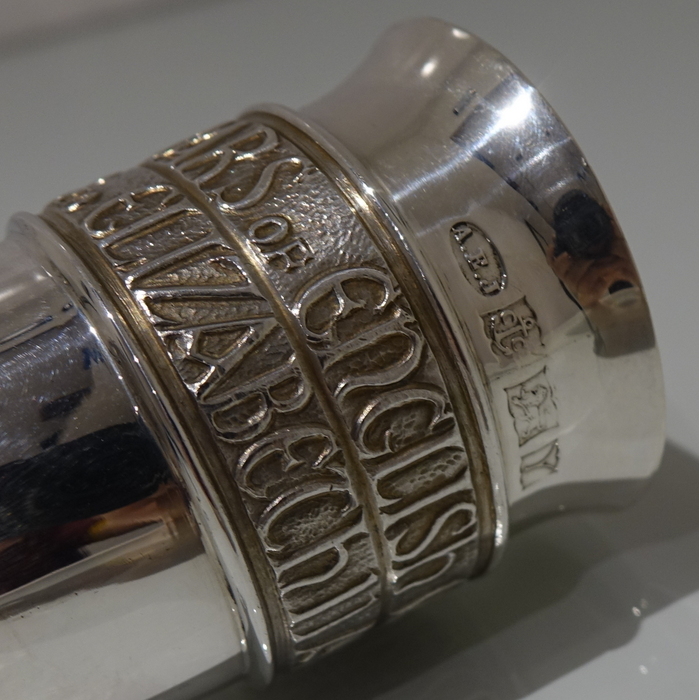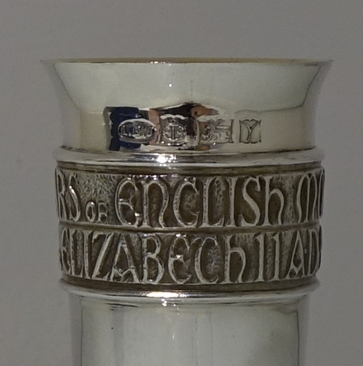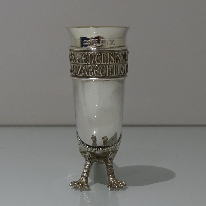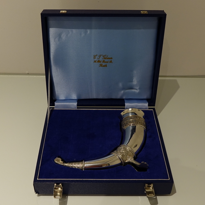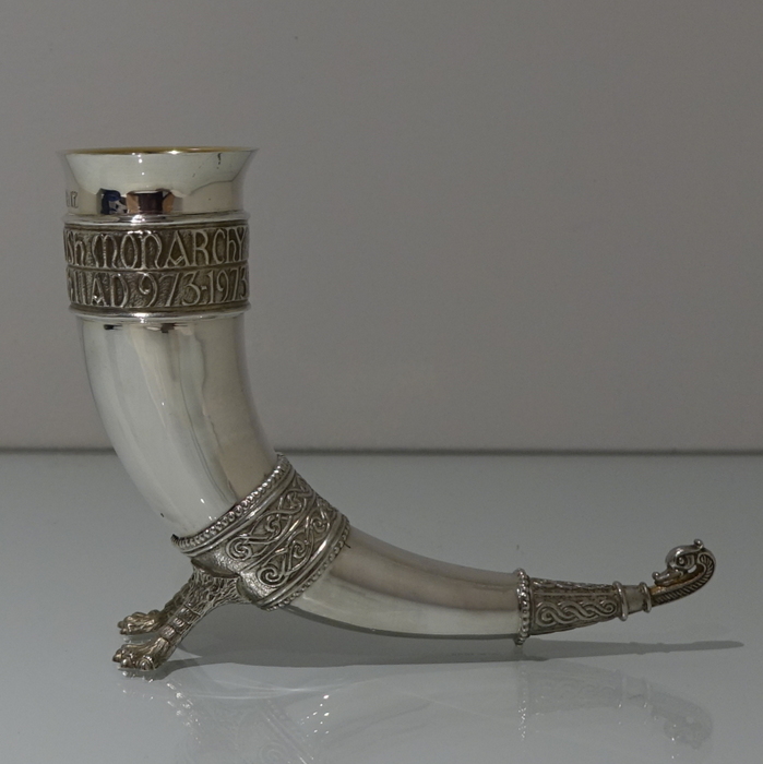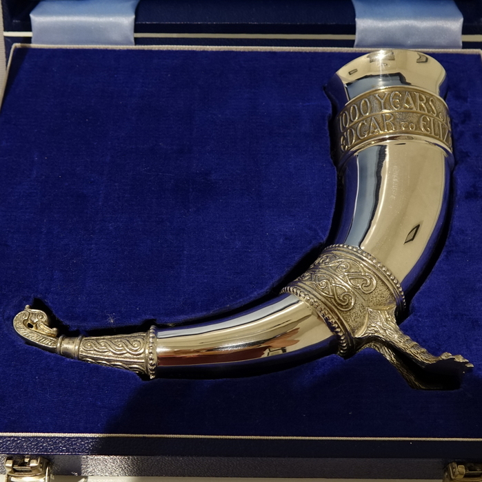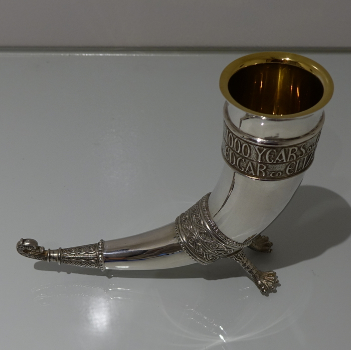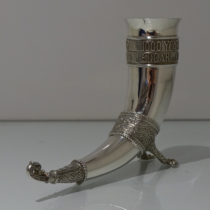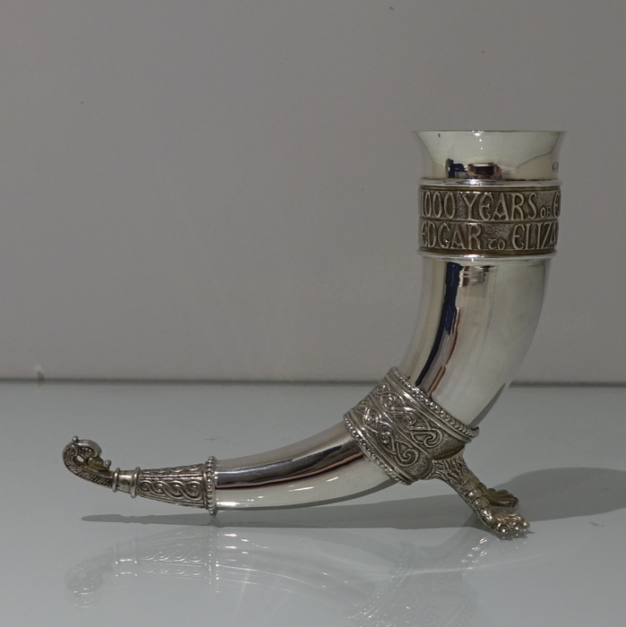 A very unusual and highly collectable horn vase commemorating 200 years of the Birmingham assay office. Â The vase has three bands of ornate Celtic workmanship for decoration and sits on two stylish looking claw feet and comes in a blue velvet lined presentation box.