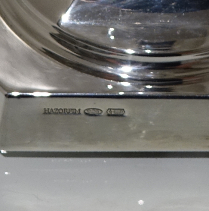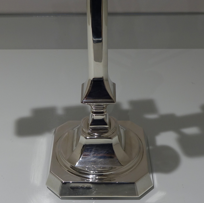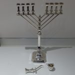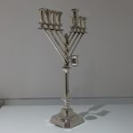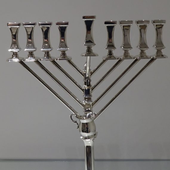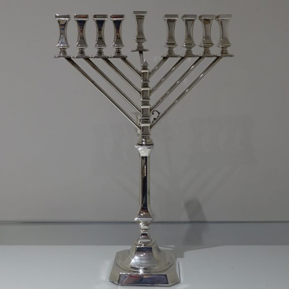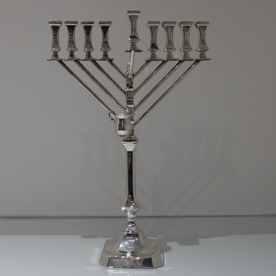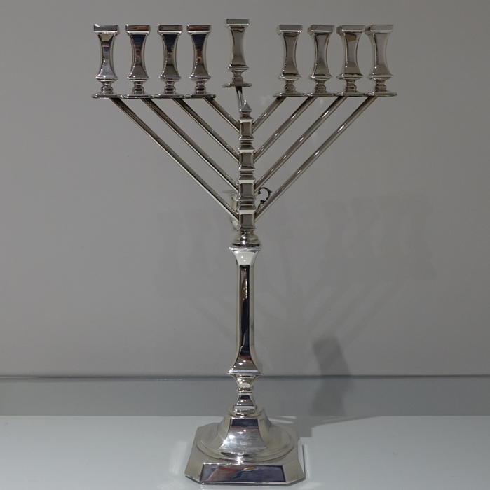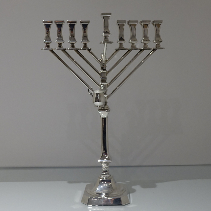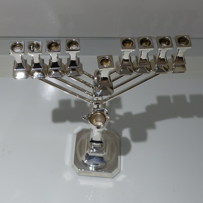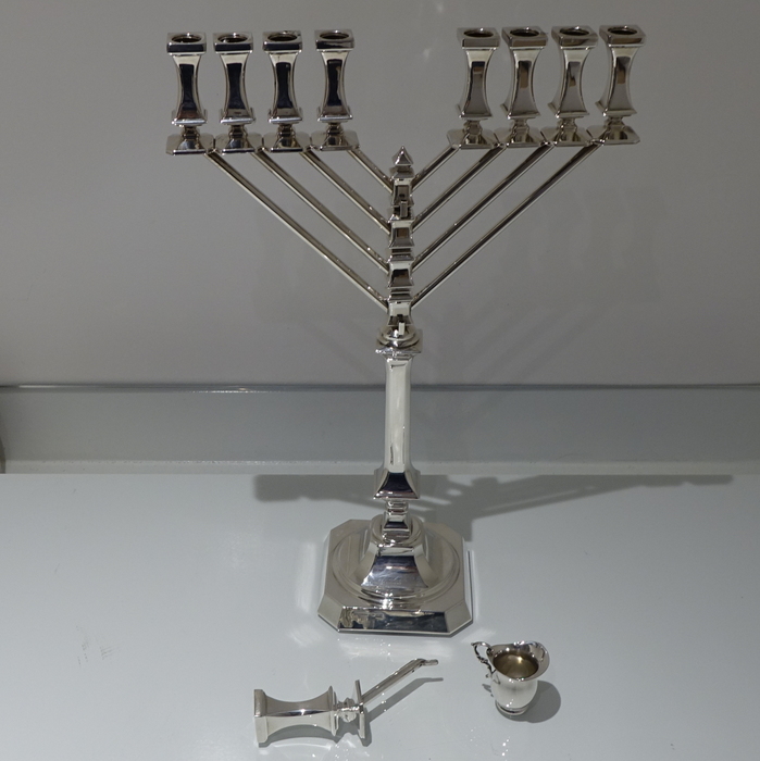 A large stylish modern menorah which replicates in design the art deco period. Â There are stylish straight lines and panelled edges for contrasting effect. Â The chamois and oil jug is detachable.