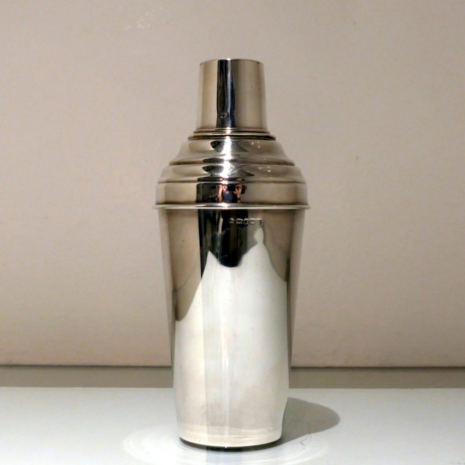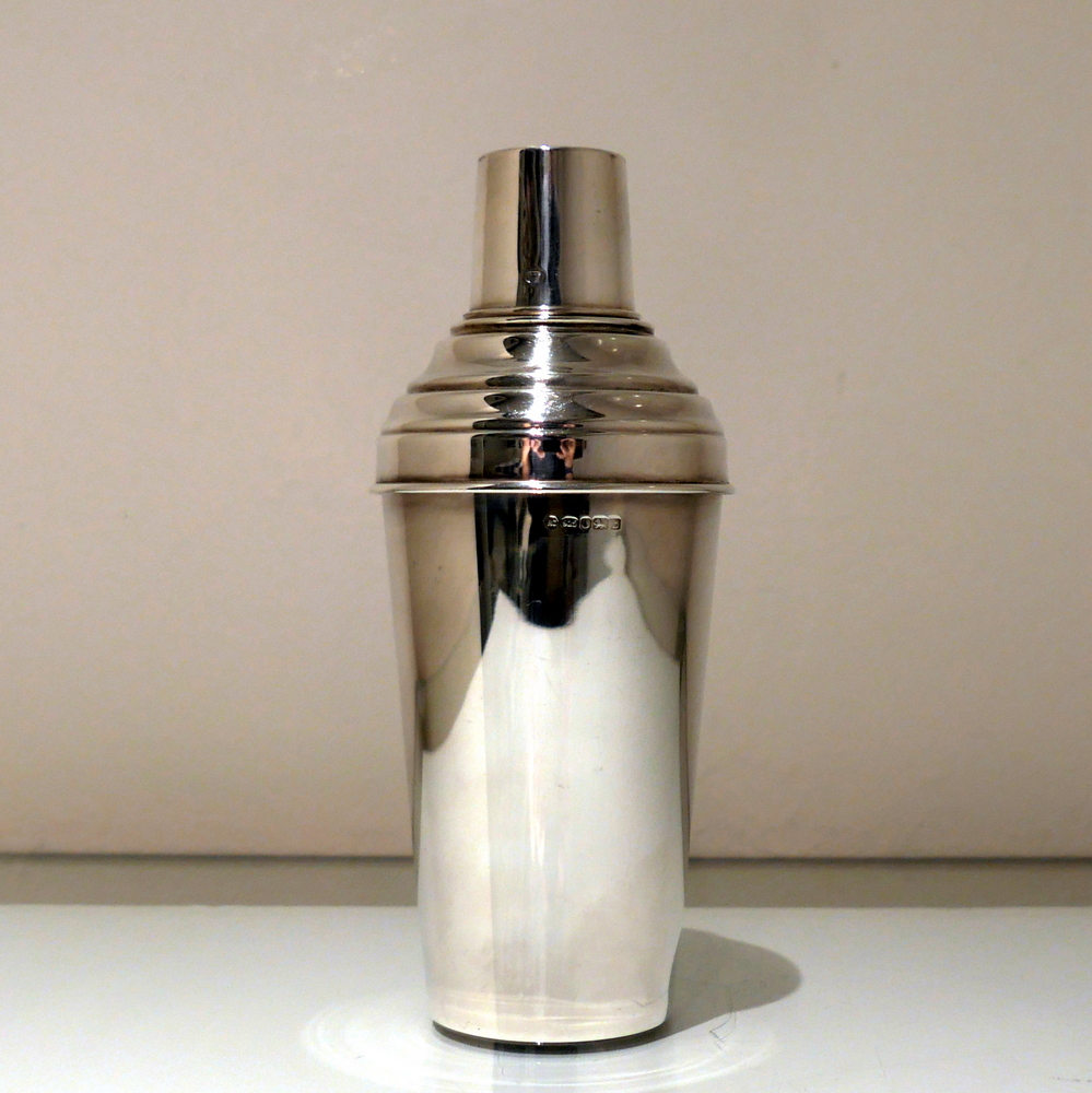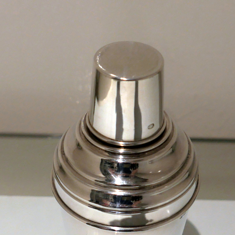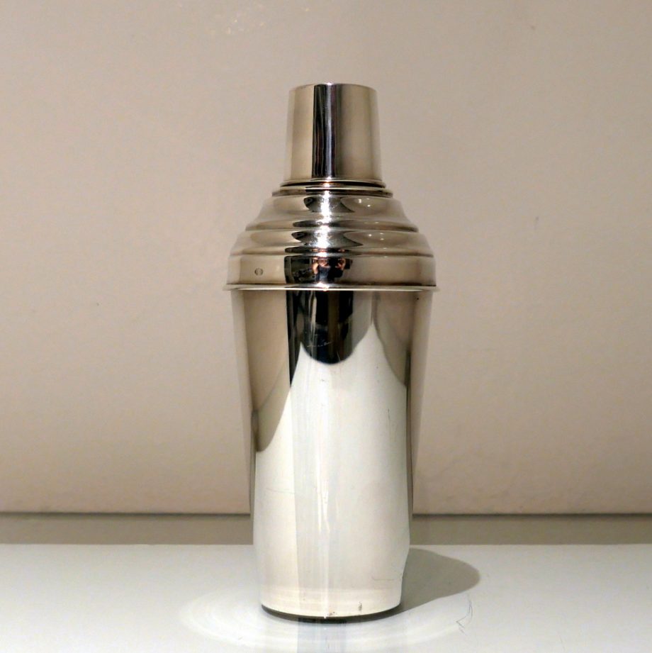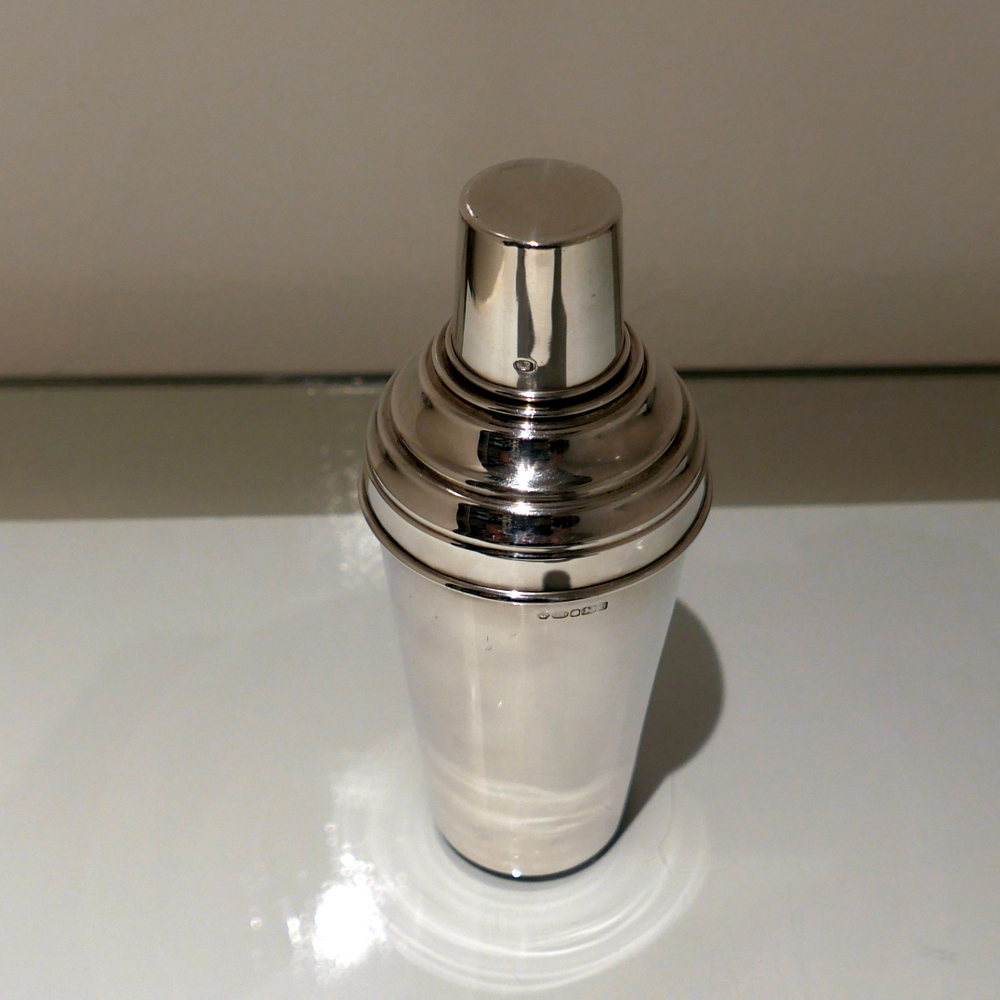 A stylish plain formed sterling silver cocktail shaker designed with an elegant tapering body (bowl) and detachable into three snuggly fitting sleeved sections.