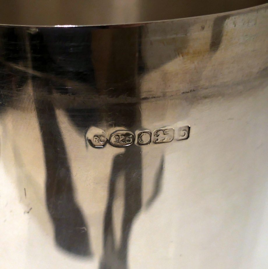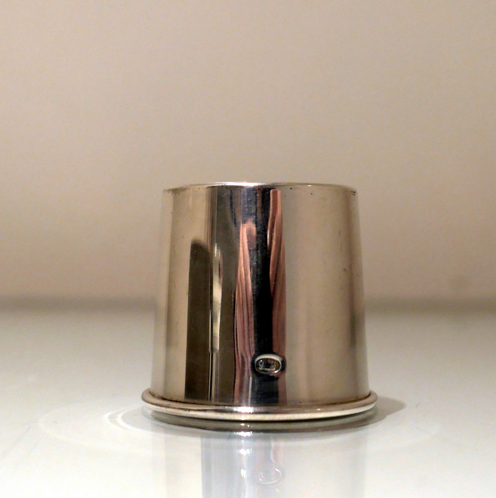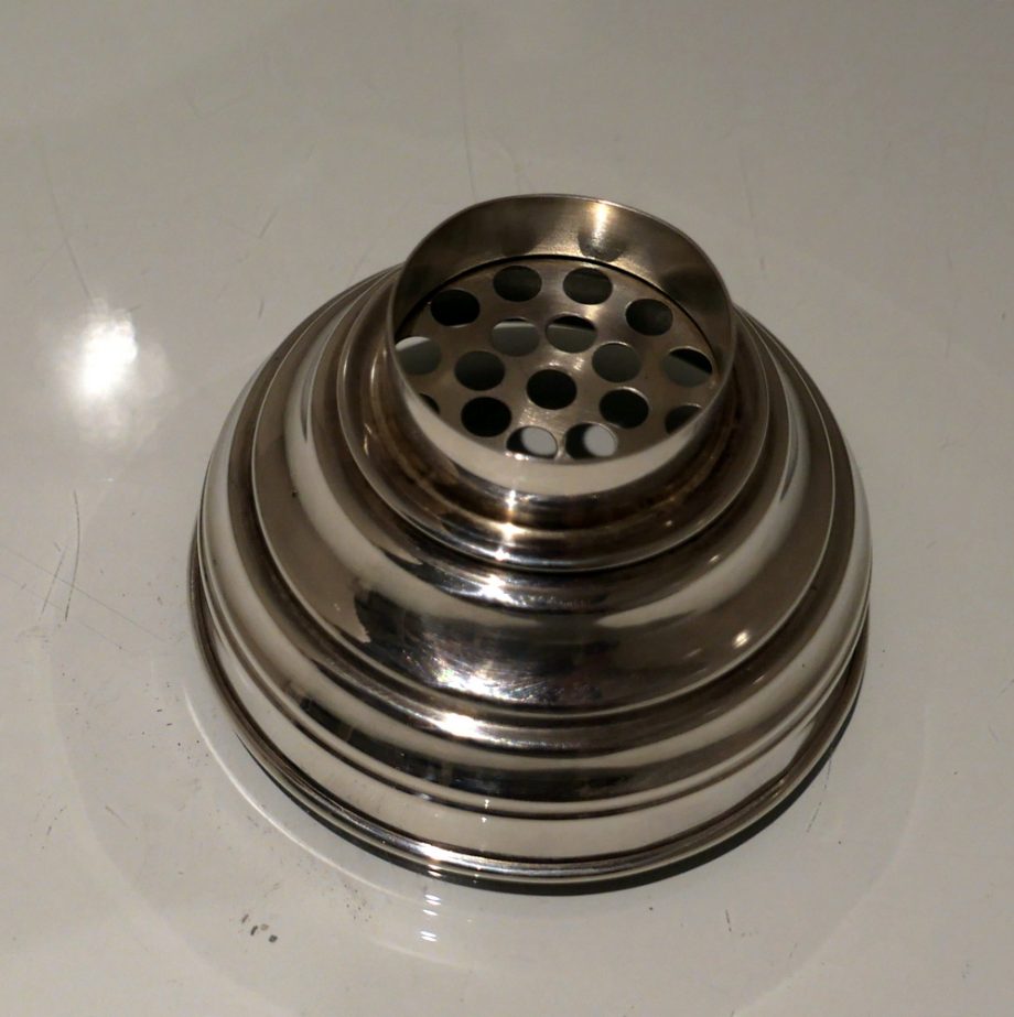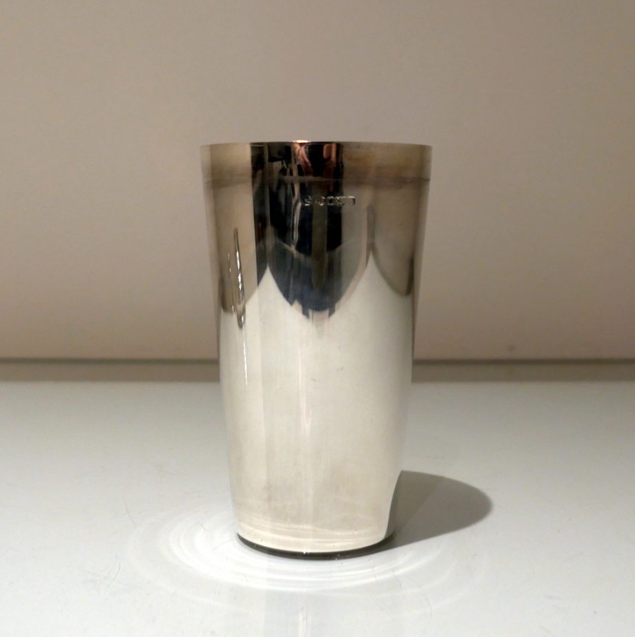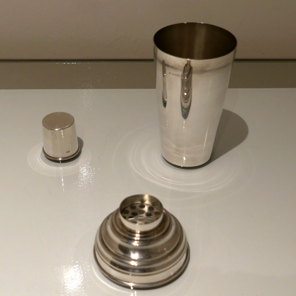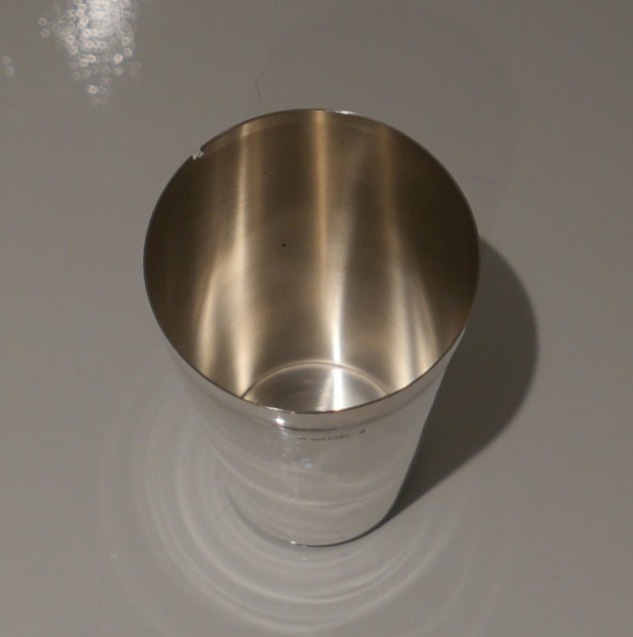 A stylish plain formed sterling silver cocktail shaker designed with an elegant tapering body (bowl) and detachable into three snuggly fitting sleeved sections.