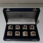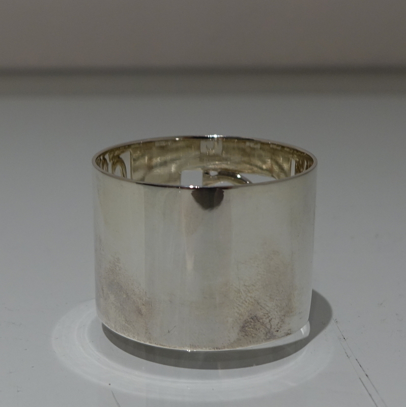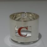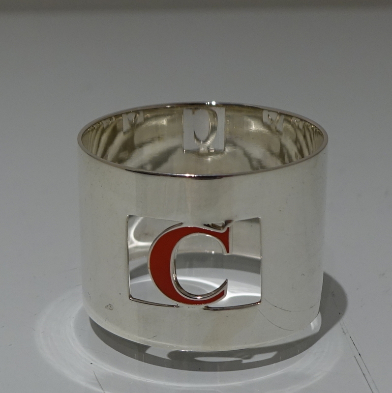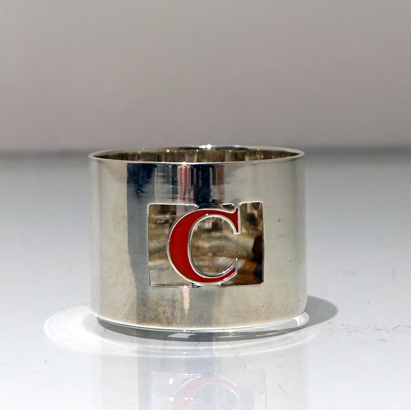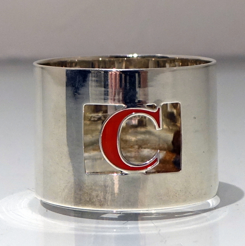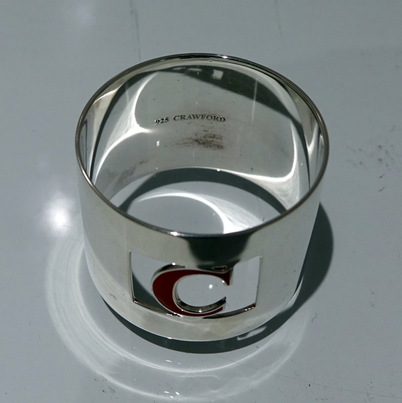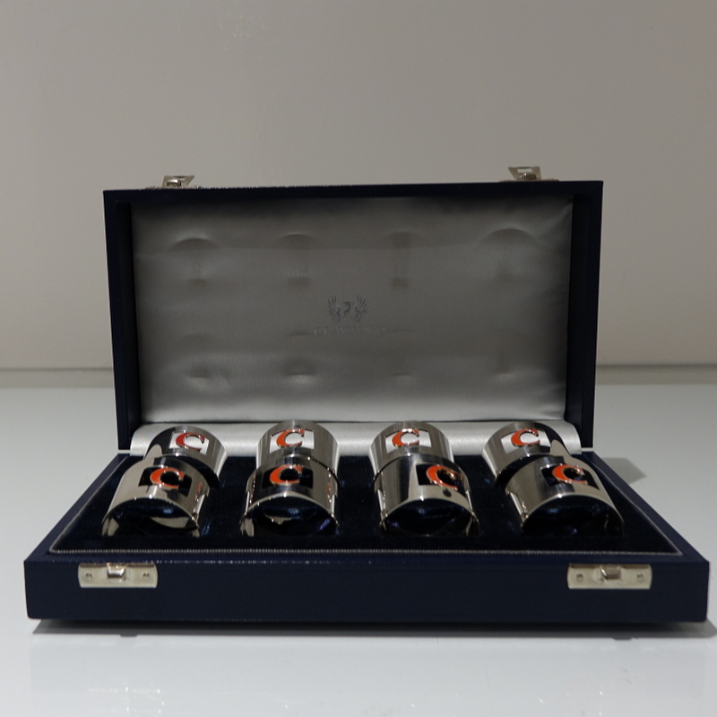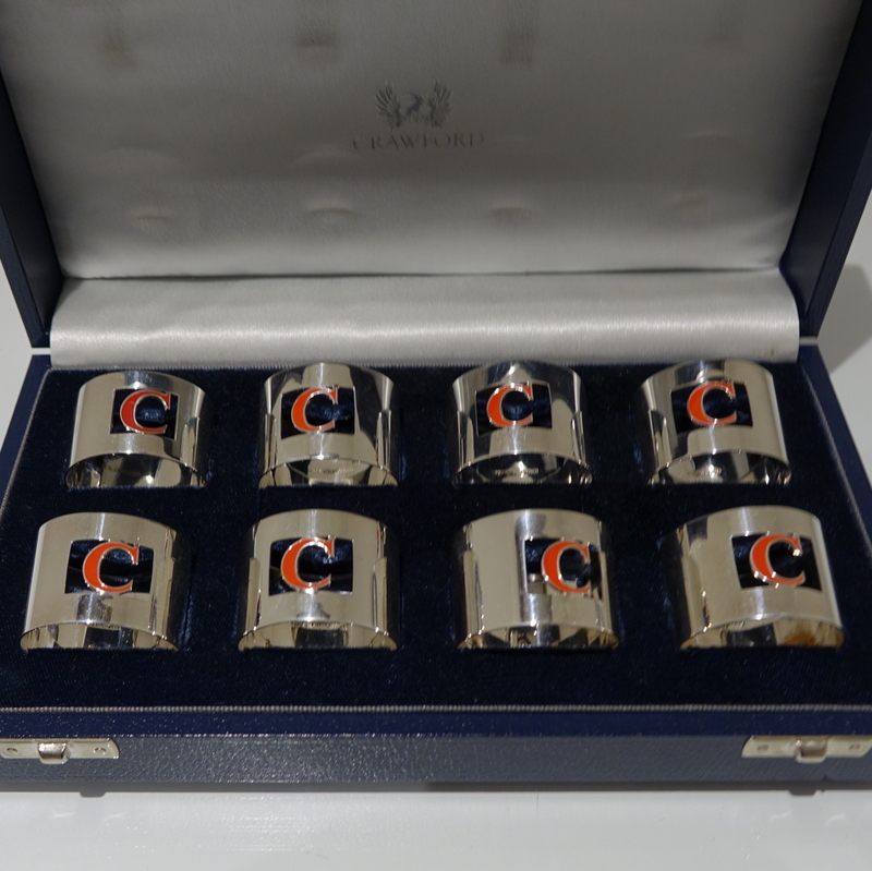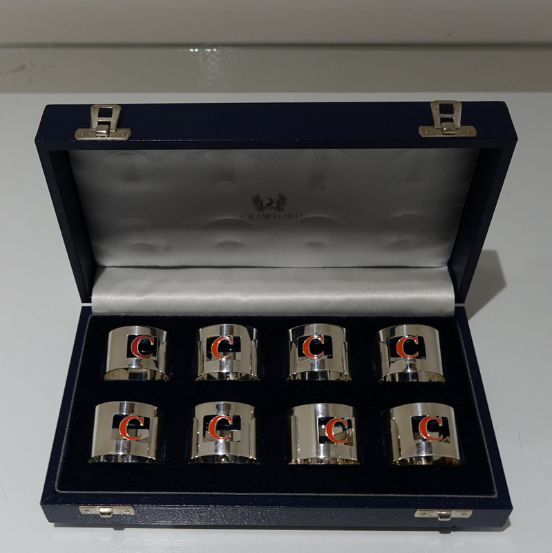 A set of eight silver and enamel napkin rings presented in blue velvet lined case. Â The napkins are plain formed in design with a”cut out” square cartouche in which sits a red enamelled C for the designer “Crawford”.