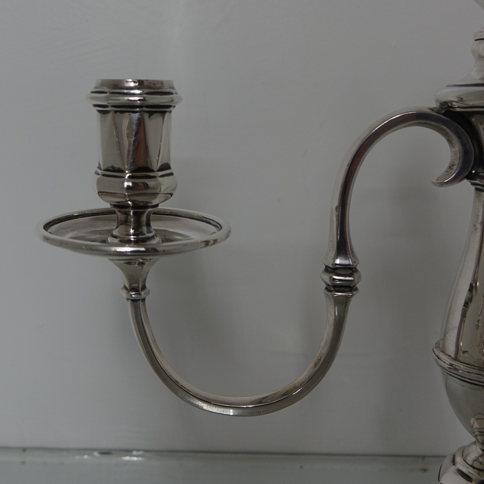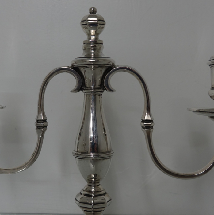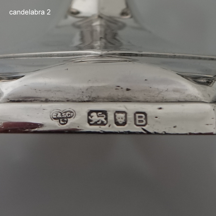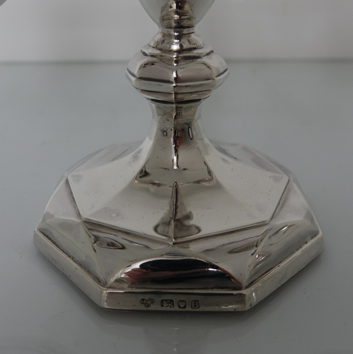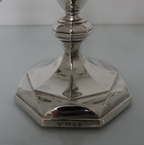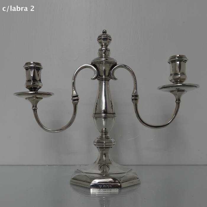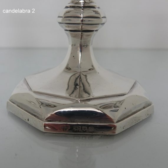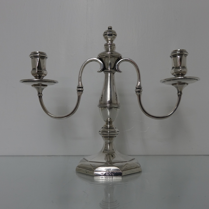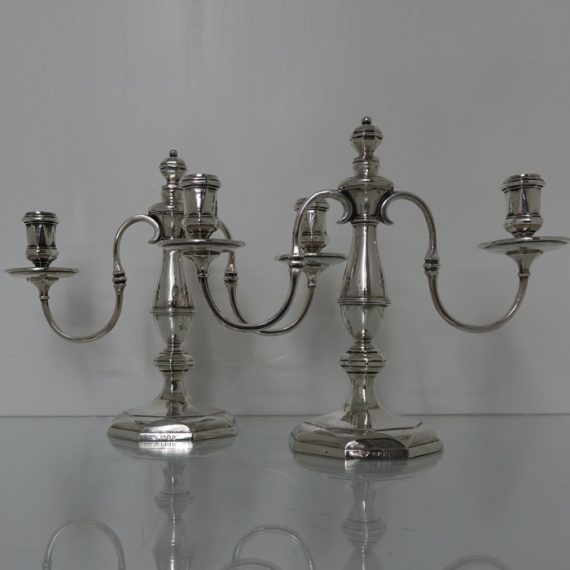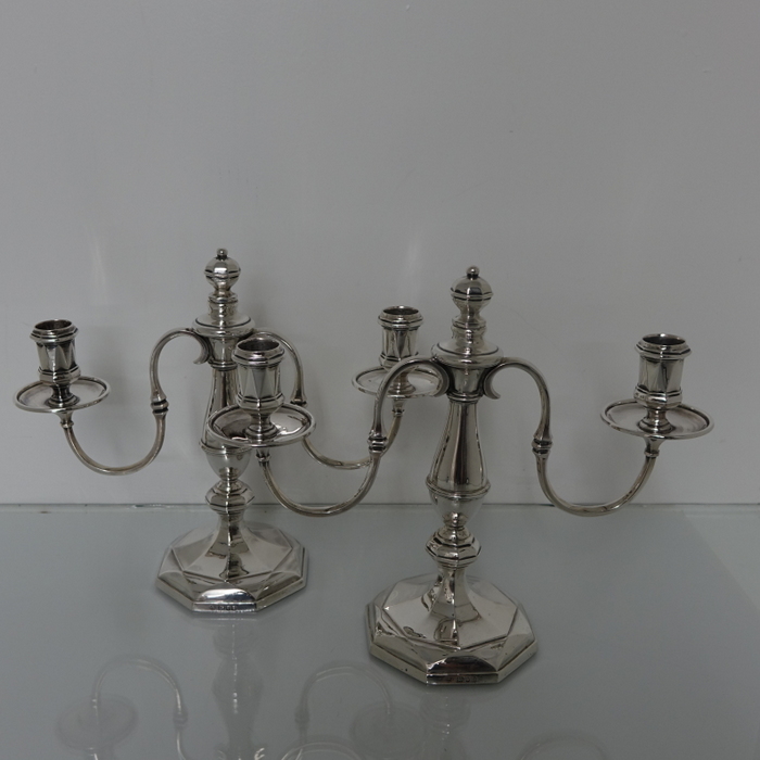 A very beautiful pair of George VI octagonal themed fixed branch two light candelabra. The central stem of the candelabra is plain formed with a decorative band around the middle. The drip pans and the sconces are plain circular with the sconces being detachable. The candelabras are sheet silver. Extremely elegant.