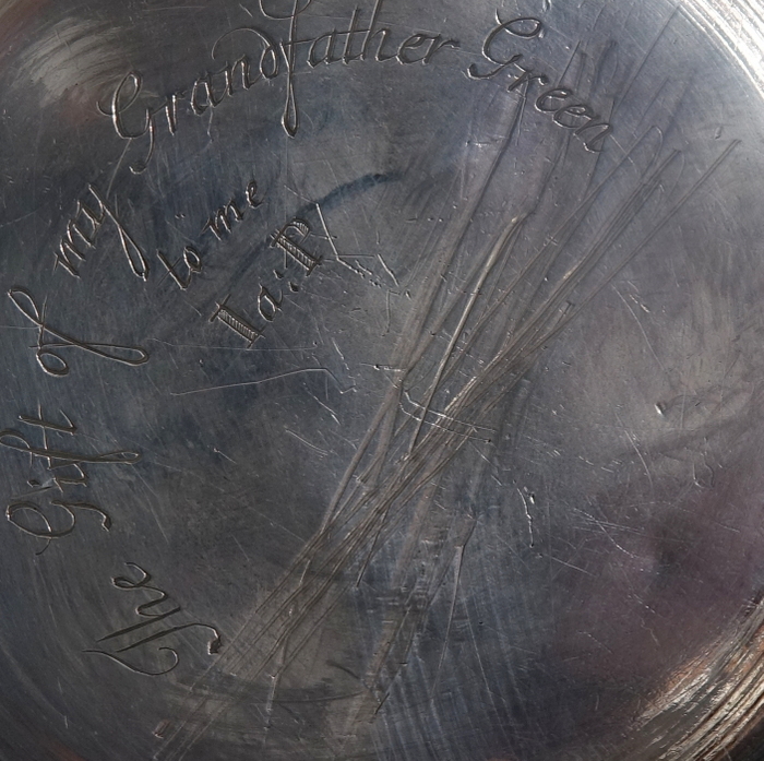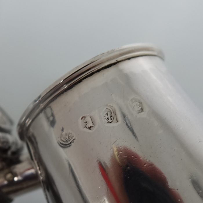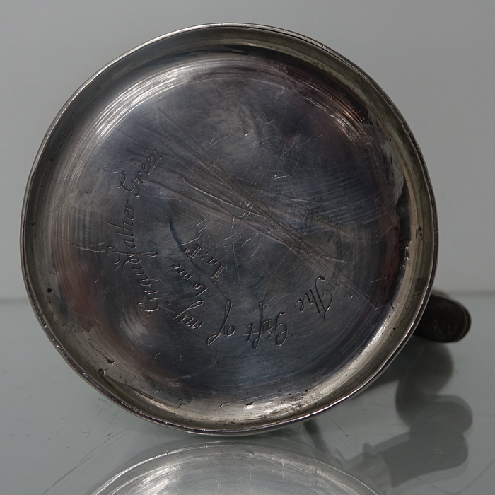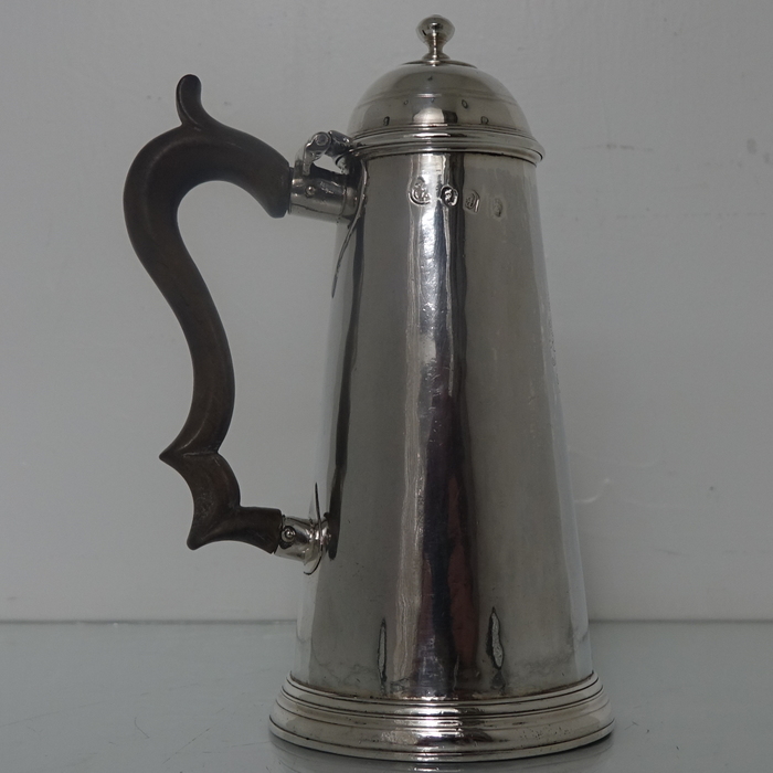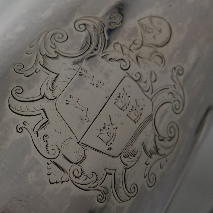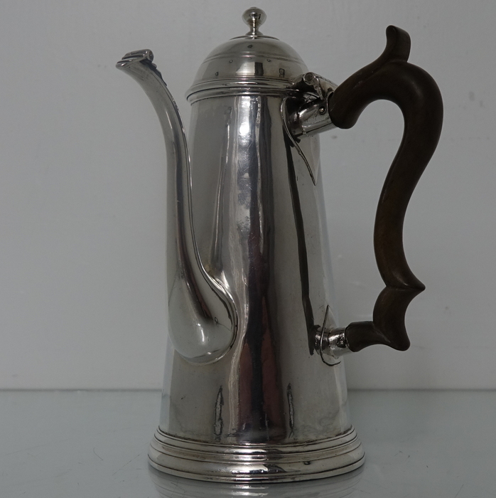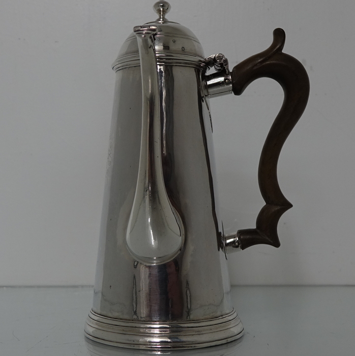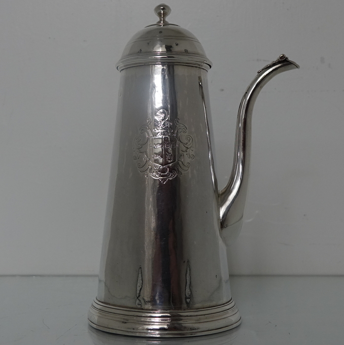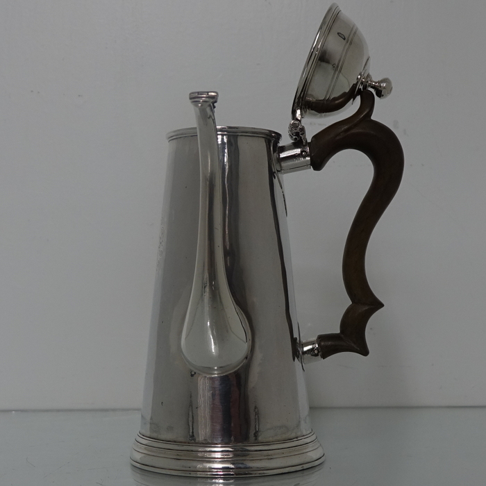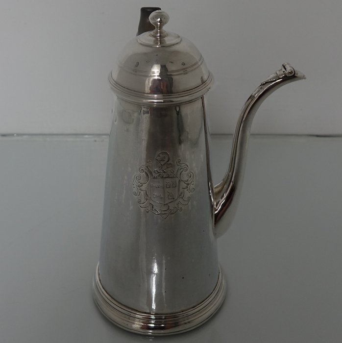 A stunningly beautiful and highly collectable side handled coffee pot with plain formed tapering body with a contemporary coat of arms for importance. Â The scroll designed fruitwood handle has elegant heart shaped cut card work applied around the sockets. Â The lid is hinged and is crowned with a elegant finial.