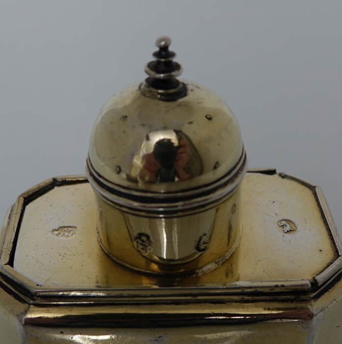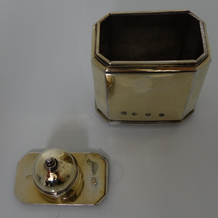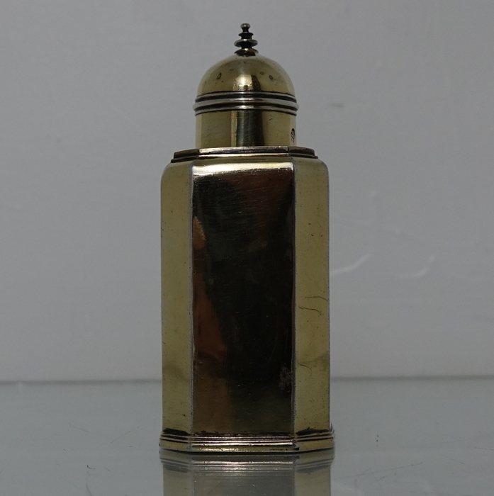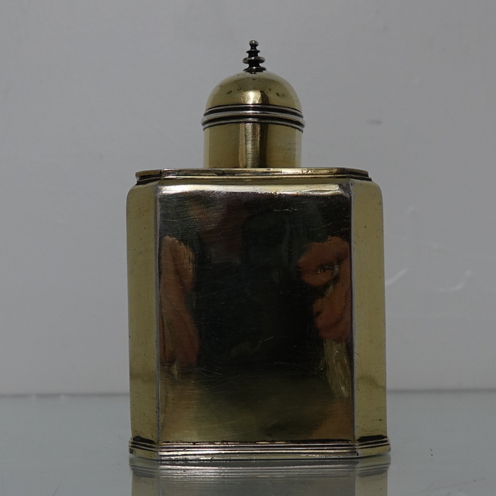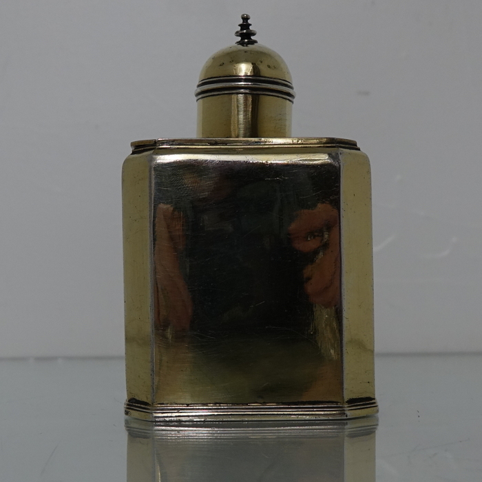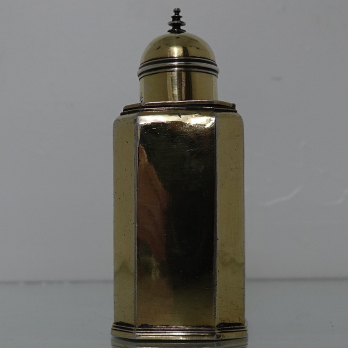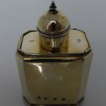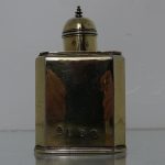 A very elegant fire gilt octagonal tea caddy with a sliding section (slide top) at the shoulder for filling the caddy. Â The base has a stylish hand engraved contemporary initial for importance.