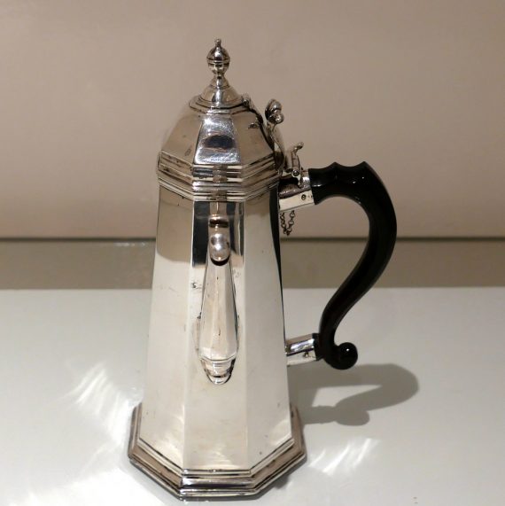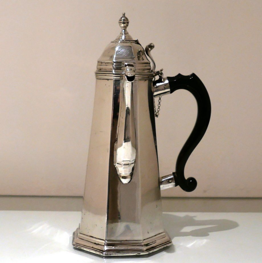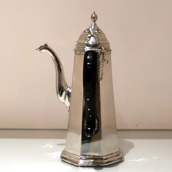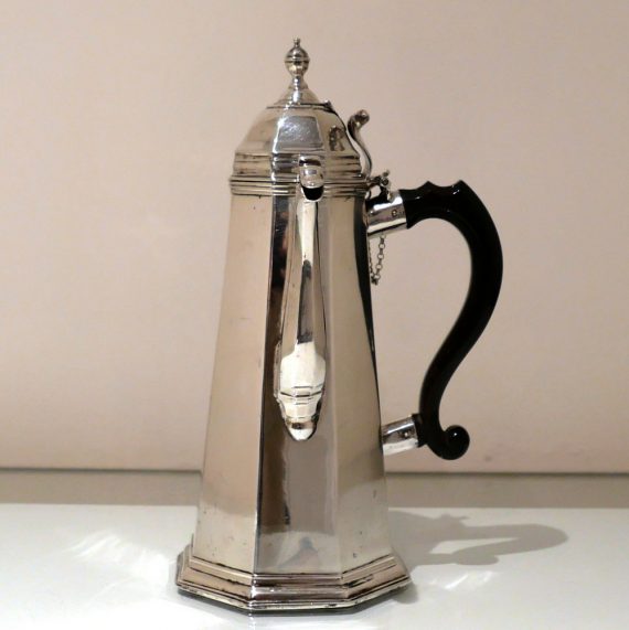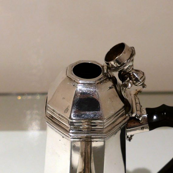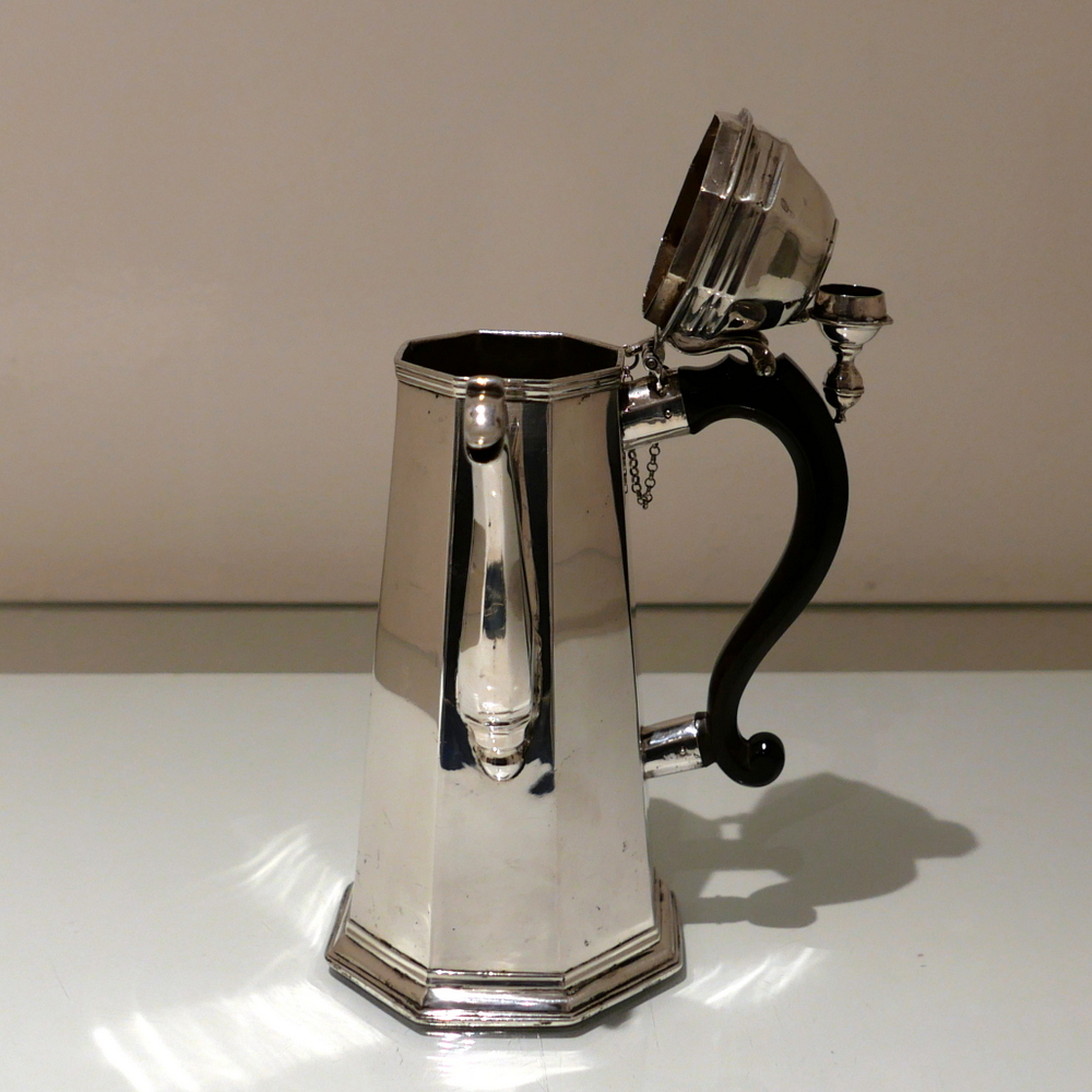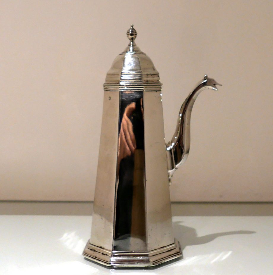 A rare and extremely fine early 18th century Queen Anne silver side handled chocolate pot designed with a superbly sculptured octagonal plain formed body and a breathtaking swan neck spout which is elegant capped off with a stunning ‘ducks’ head terminal. Â The hinged lid is designed in keeping with the body and the stirring ‘flap’ has an additional hinge.