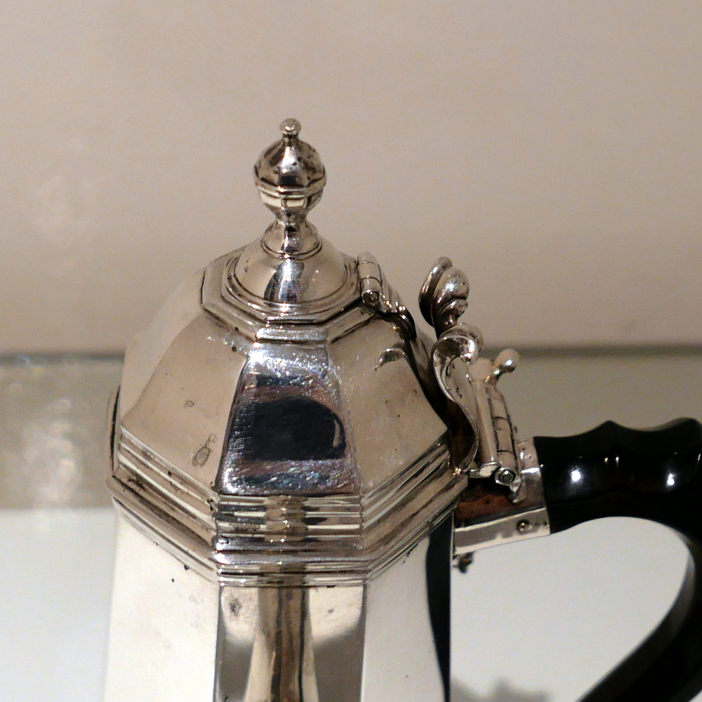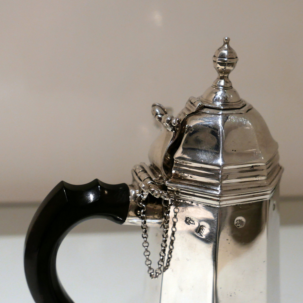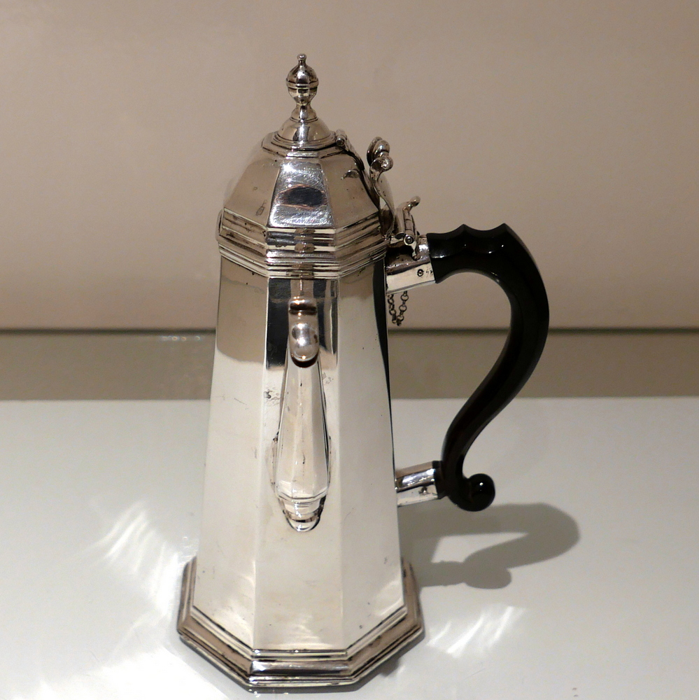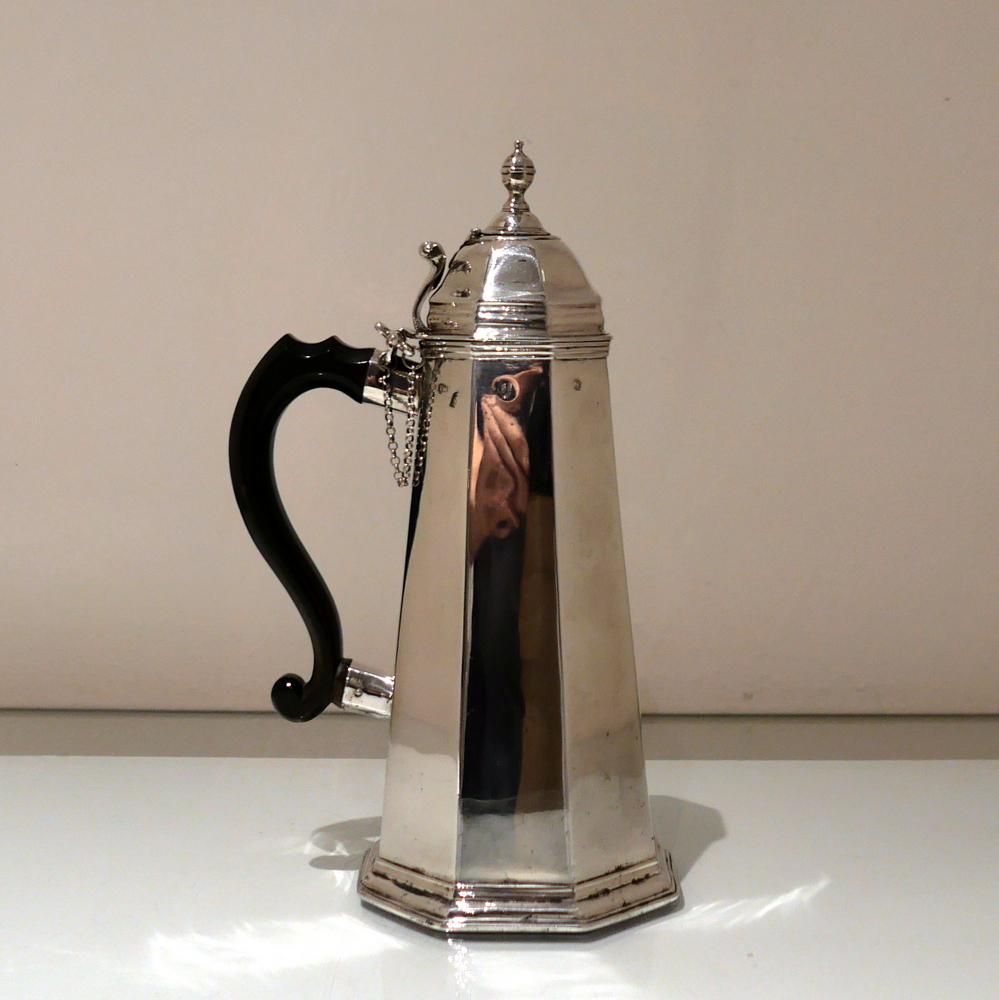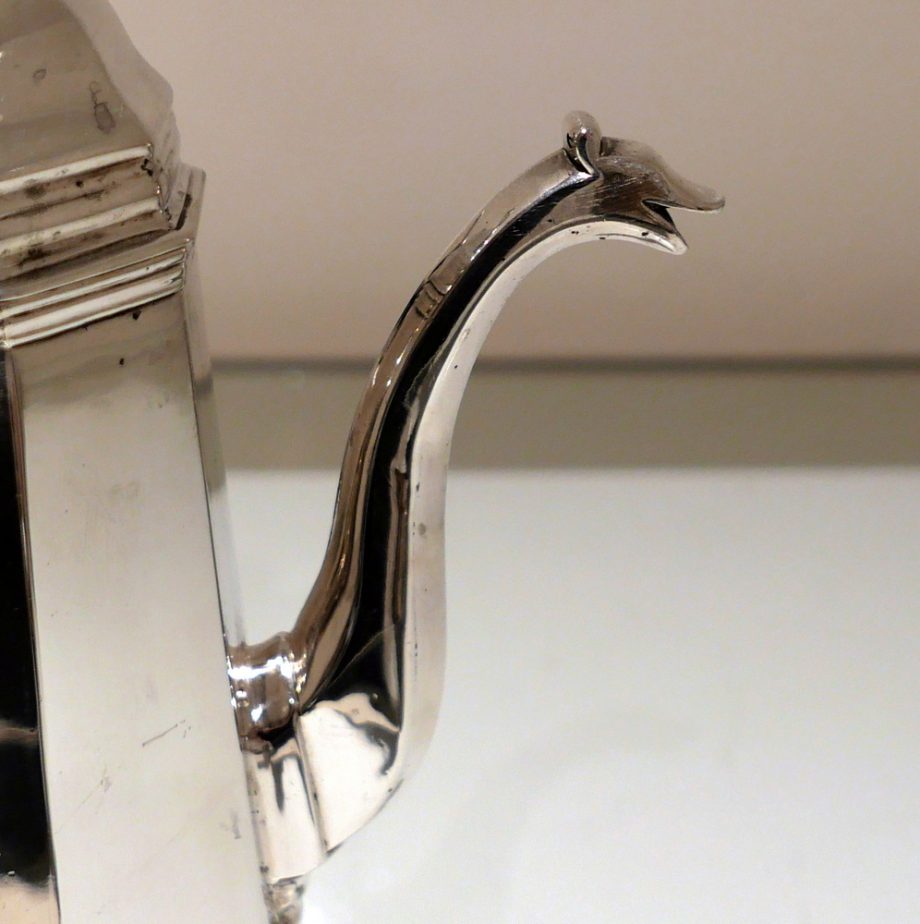 A rare and extremely fine early 18th century Queen Anne silver side handled chocolate pot designed with a superbly sculptured octagonal plain formed body and a breathtaking swan neck spout which is elegant capped off with a stunning ‘ducks’ head terminal. Â The hinged lid is designed in keeping with the body and the stirring ‘flap’ has an additional hinge.