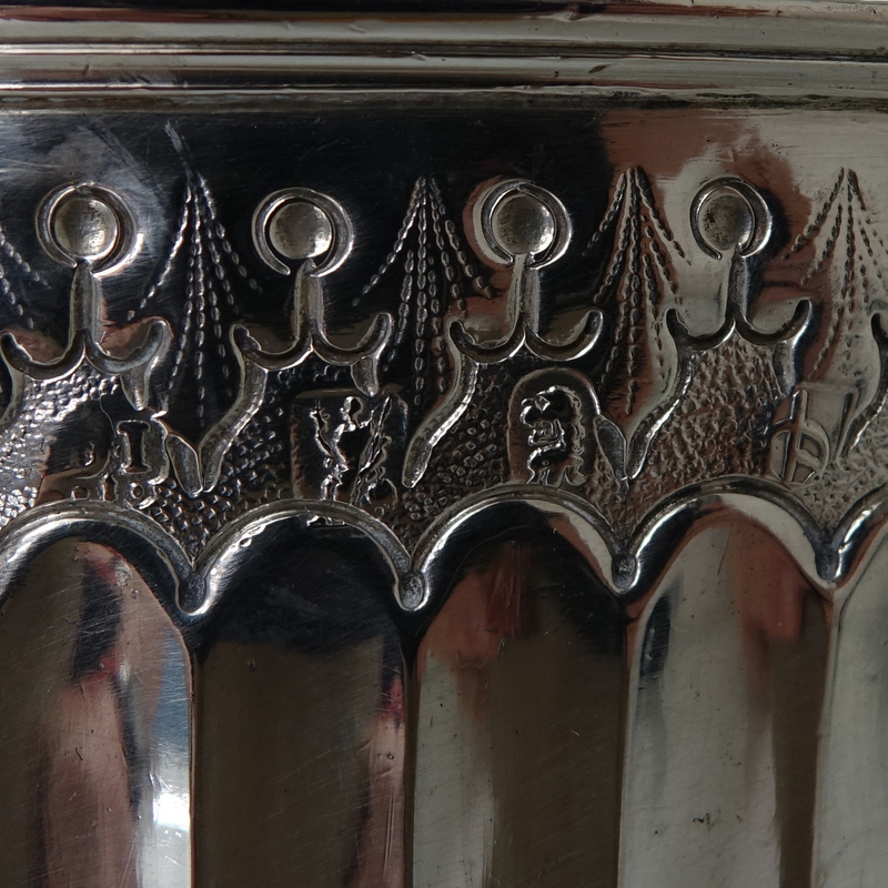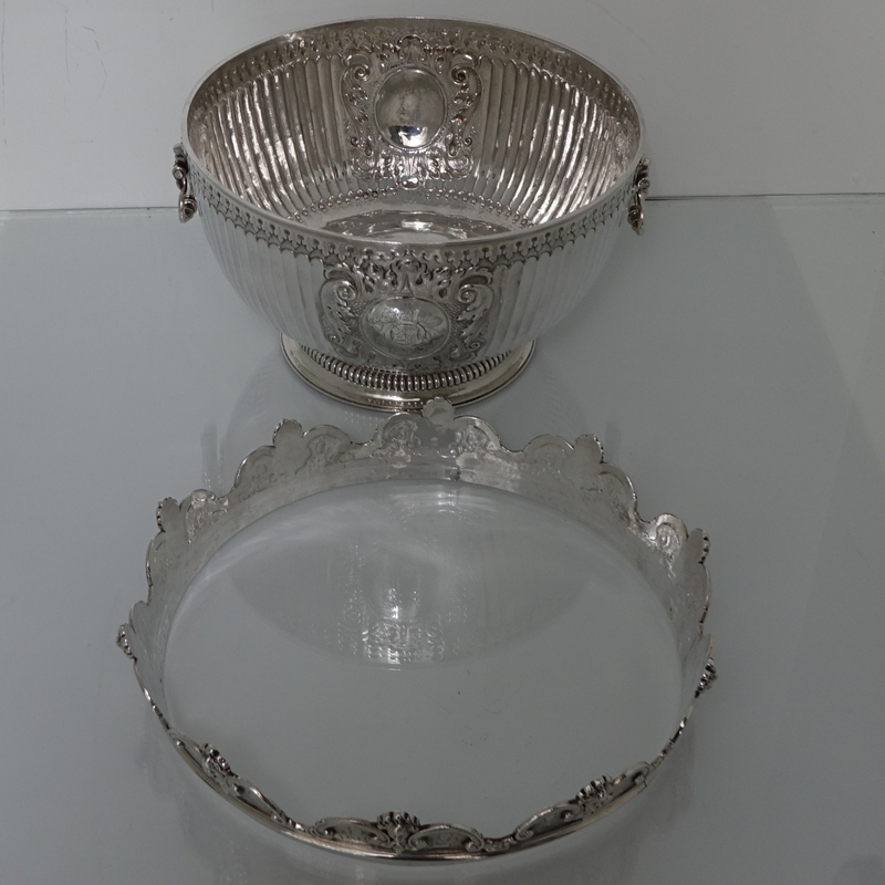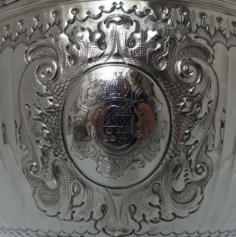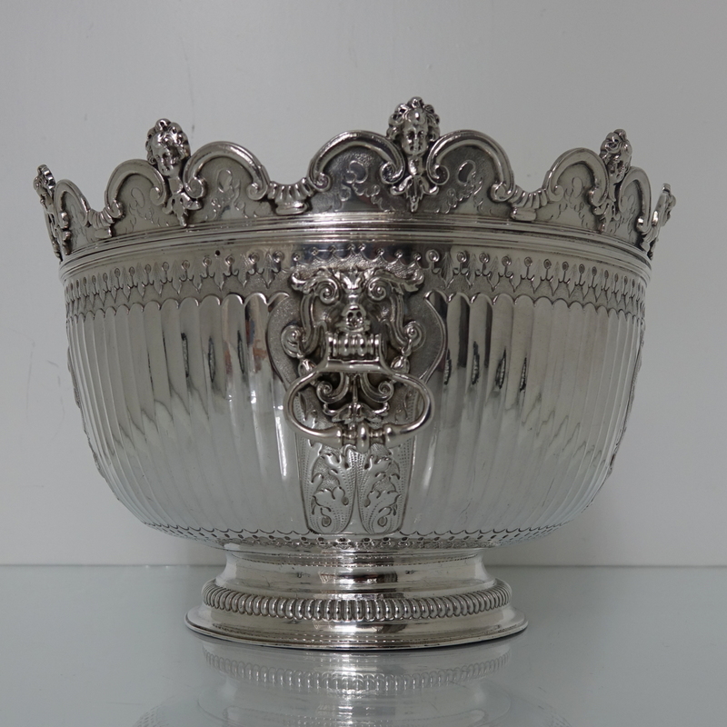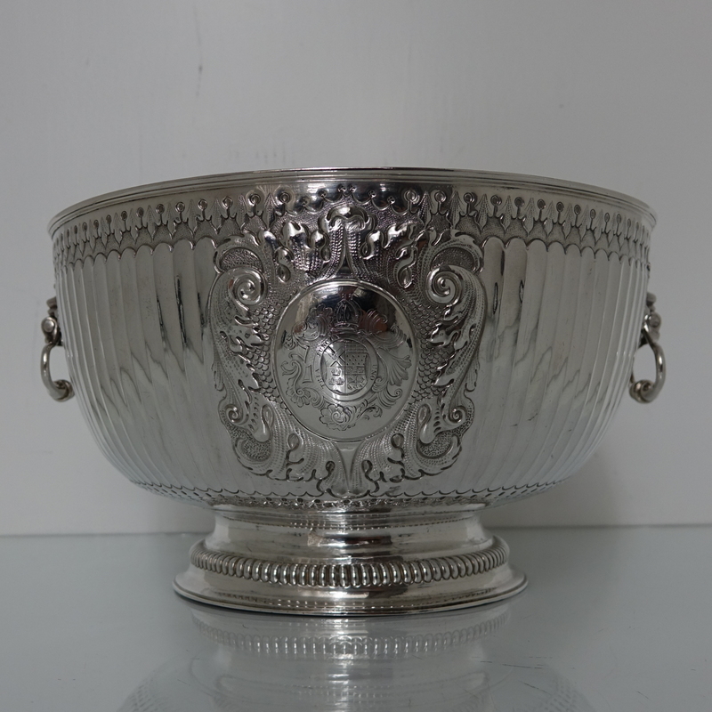 A very important early 18th century fluted circular montieth bowl with removable rim. The bowl has a double cartouche (armorial & crest) with lion mask drop ring handles for decoration. The bowl sits on a raised pedestal circular foot. The rim of the bowl is decorated with cherubs with splashing of floral engraving on matt a background.