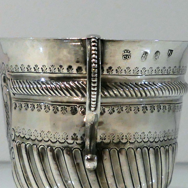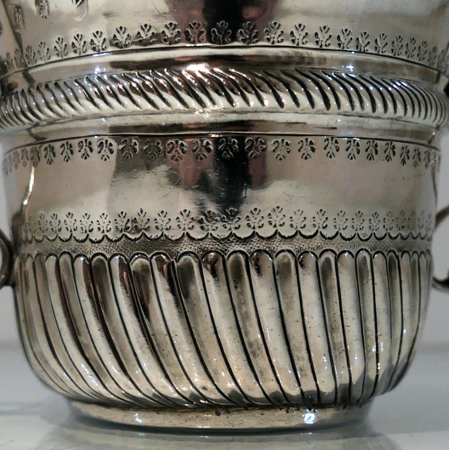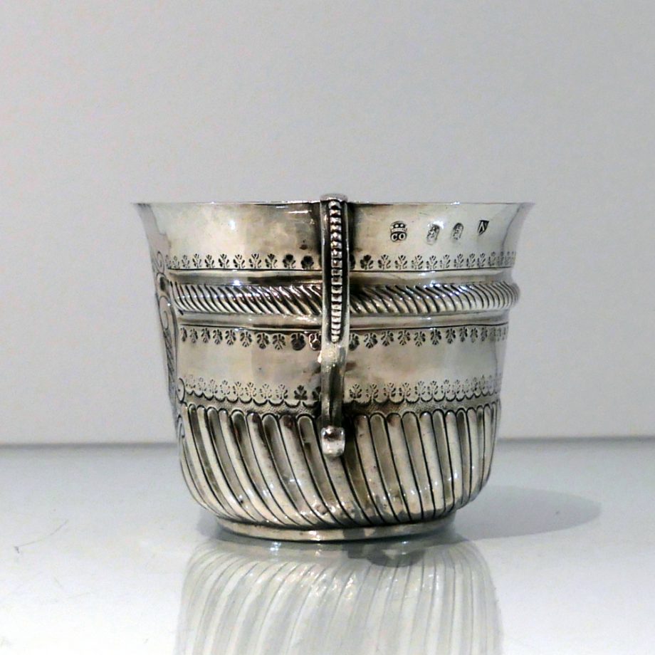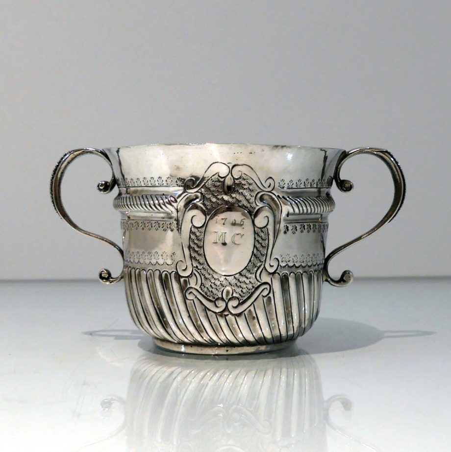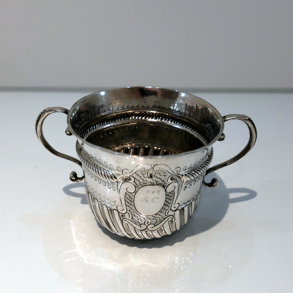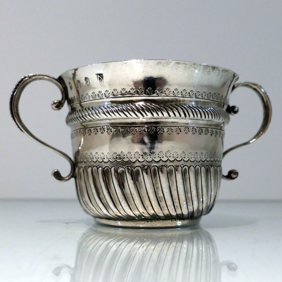 A fine Britannia standard porringer decorated with spiral fluting to the lower section and a elegant central matted scalloped cartouche in which sits contemporary initials for importance. Â There are two stylish applied bead wire handles for decorative highlights.