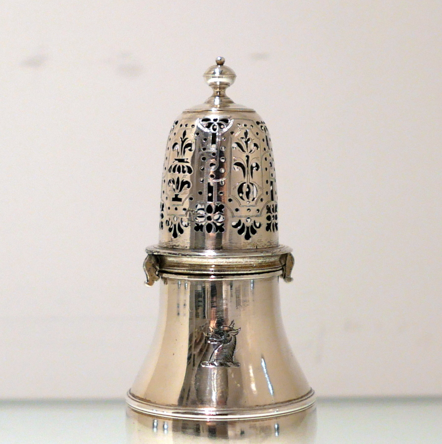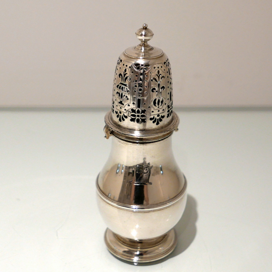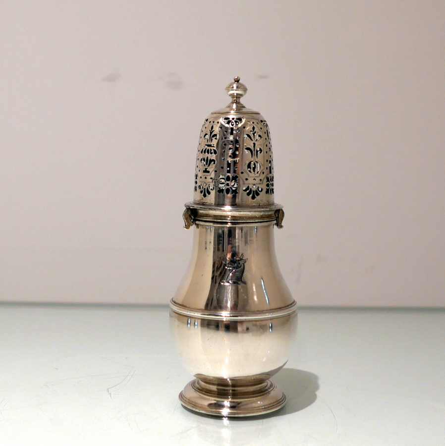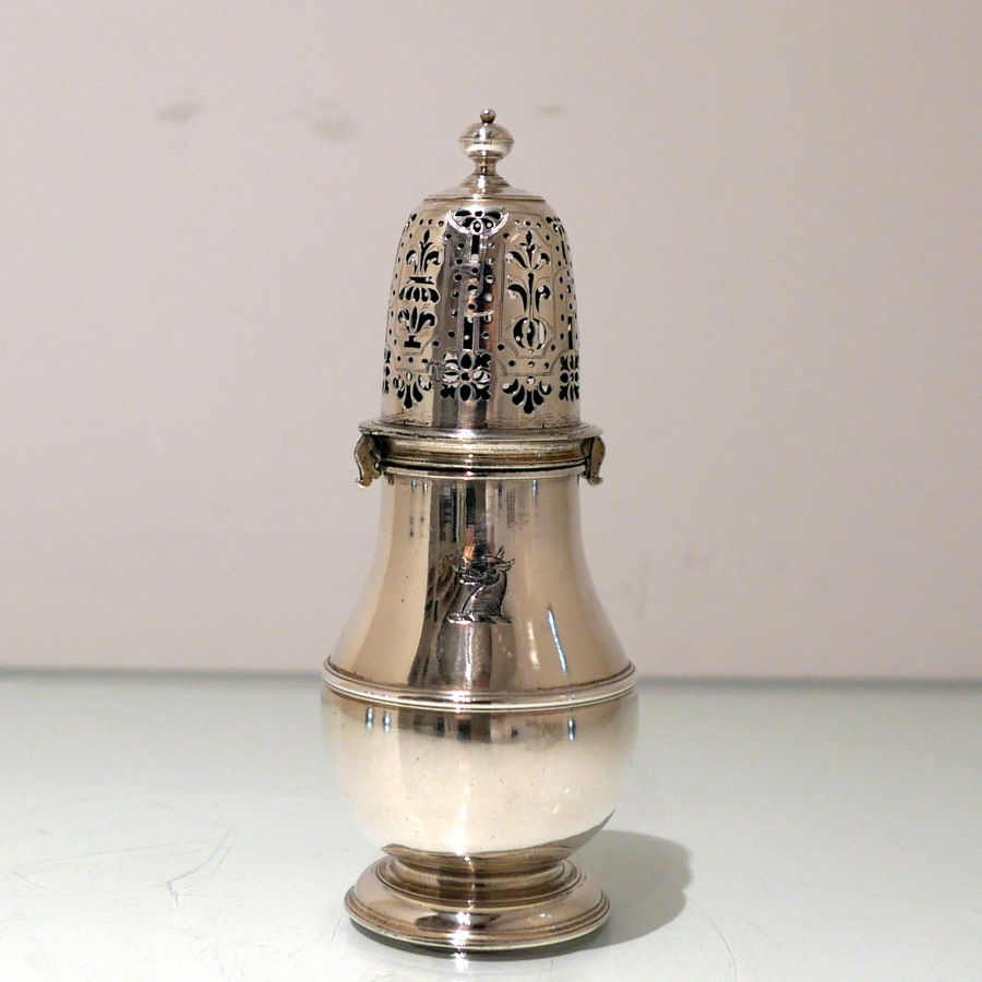 A fine Britannia silver Queen Anne baluster shaped sugar caster decorated with a central strap work girdle and an intricately hand pierced bayonet locking lid. Â The centre front has a contemporary hand engraved crest for importance.