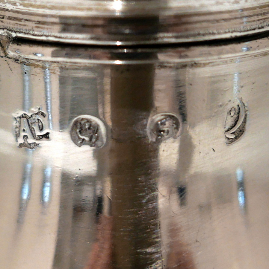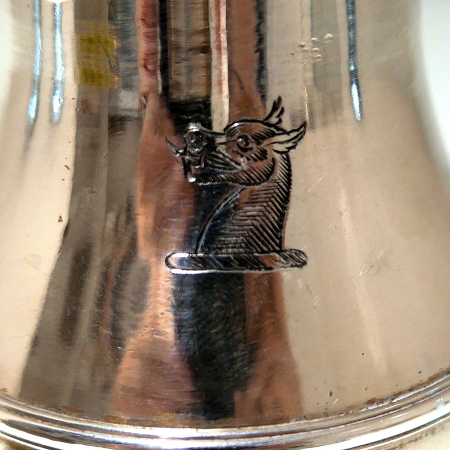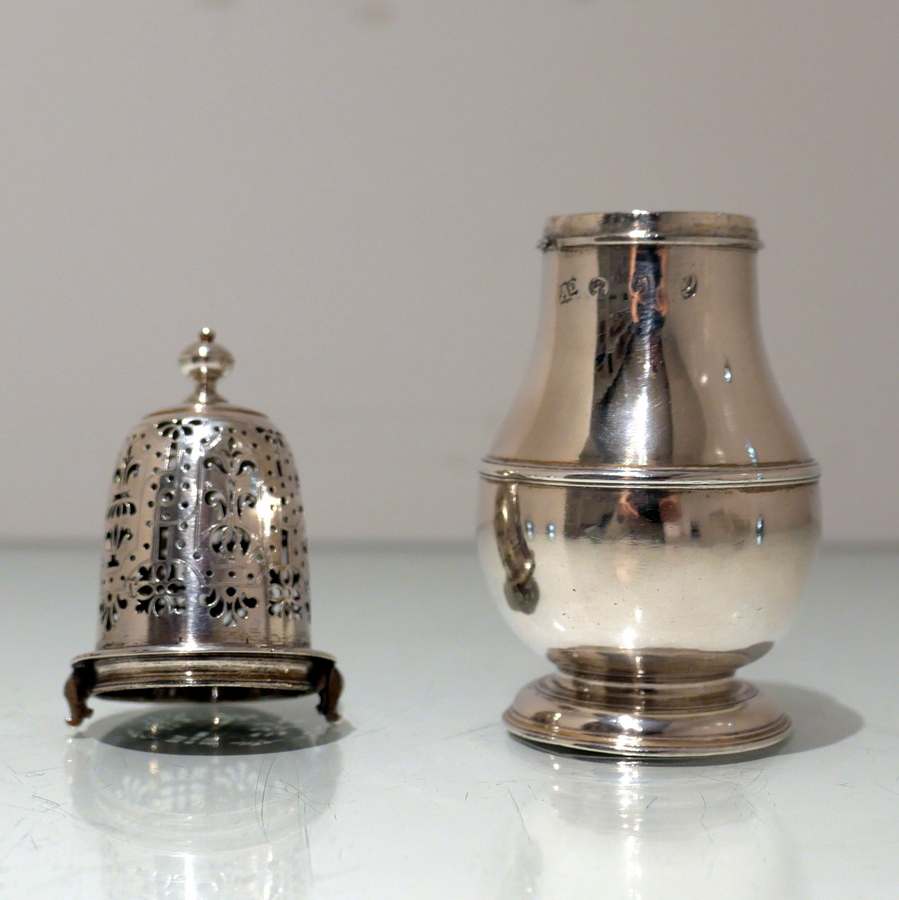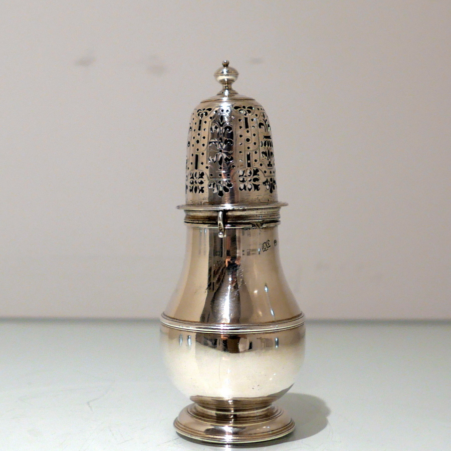A fine Britannia silver Queen Anne baluster shaped sugar caster decorated with a central strap work girdle and an intricately hand pierced bayonet locking lid. Â The centre front has a contemporary hand engraved crest for importance.